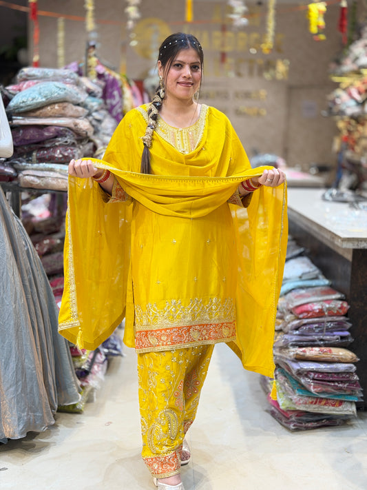 YELLOW PARTY WEAR FARSHI SALWAR DESIGN SUIT