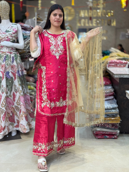 PREMIUM RASHIAN SILK PEARL HANDWORK WITH HANDBAG PLAZO SUIT