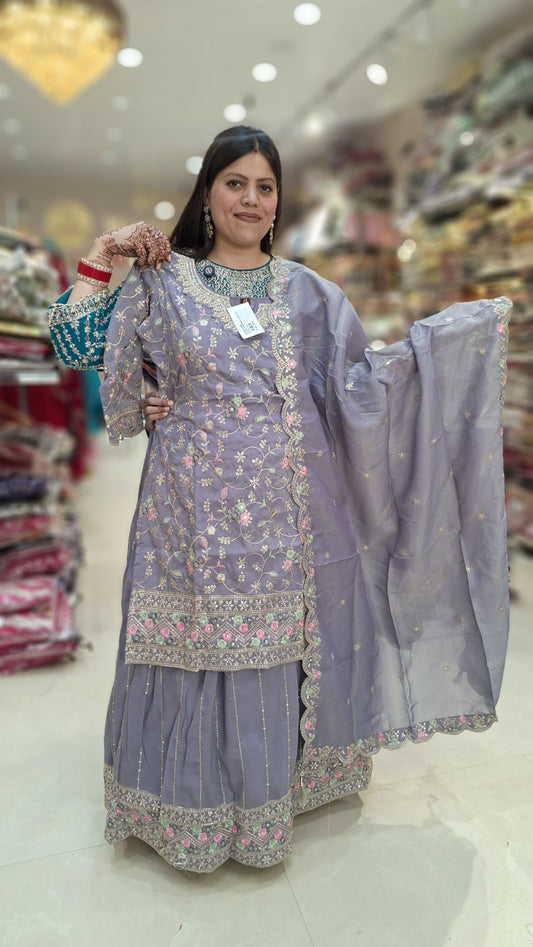 LAVNDER WITH IVORY CONTRAST ANARKALI WITH DESIGNER WORK DUPPATA