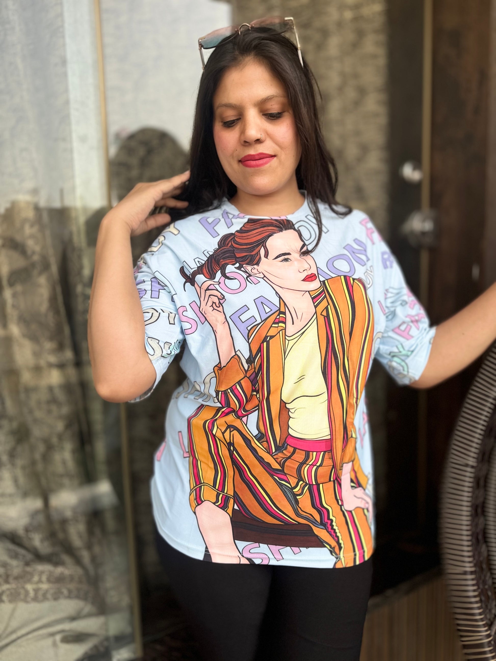 Experience fashionable freedom with the Baggie TShirt Fashion Lady Print (T-007)! Made with Spendix Cotton and a free size fit up to 46 inches, this t-shirt provides unbeatable comfort and a length of 29 inches for a stylish look. Take a risk and stand out in this bold and empowering piece.