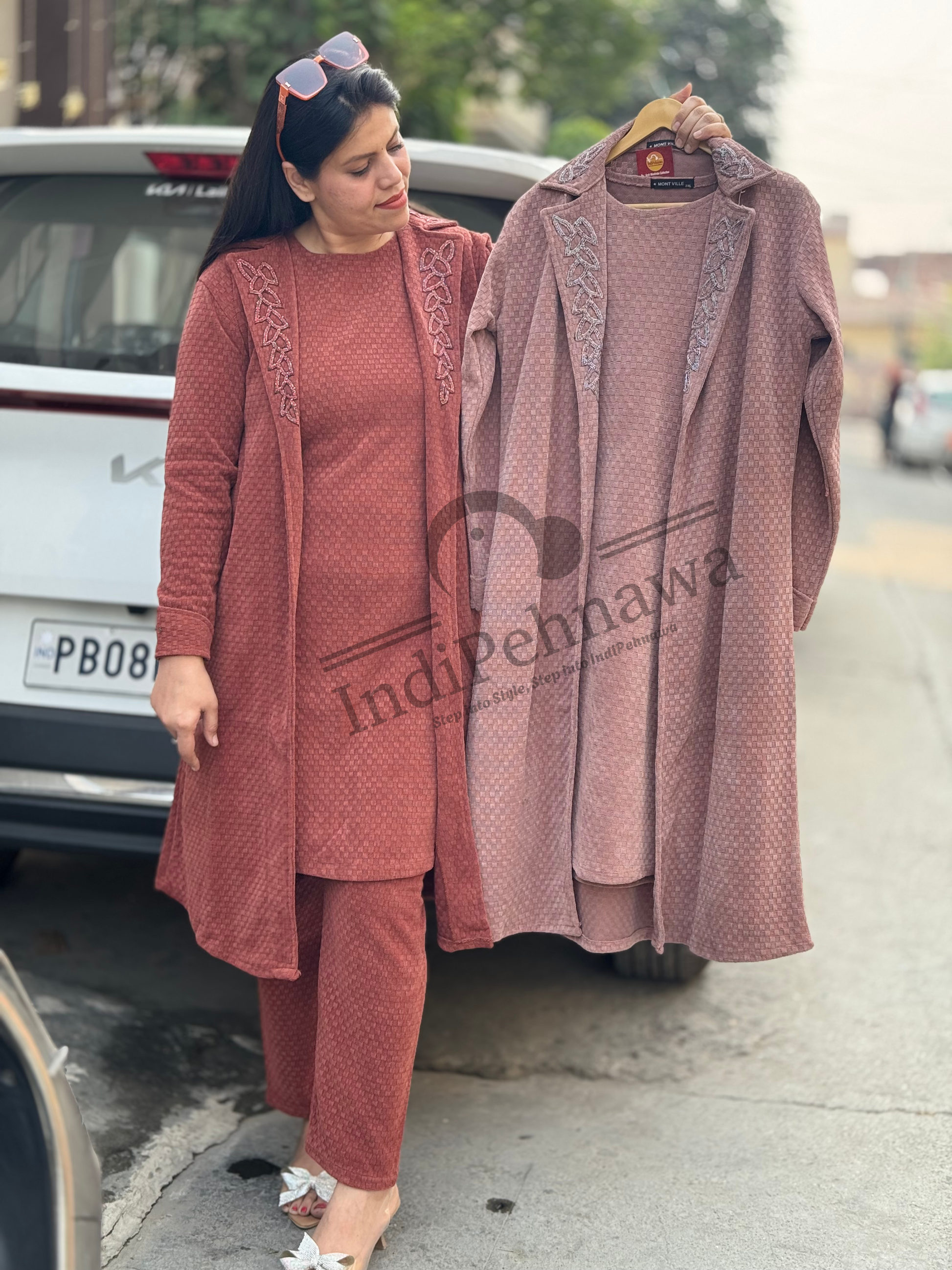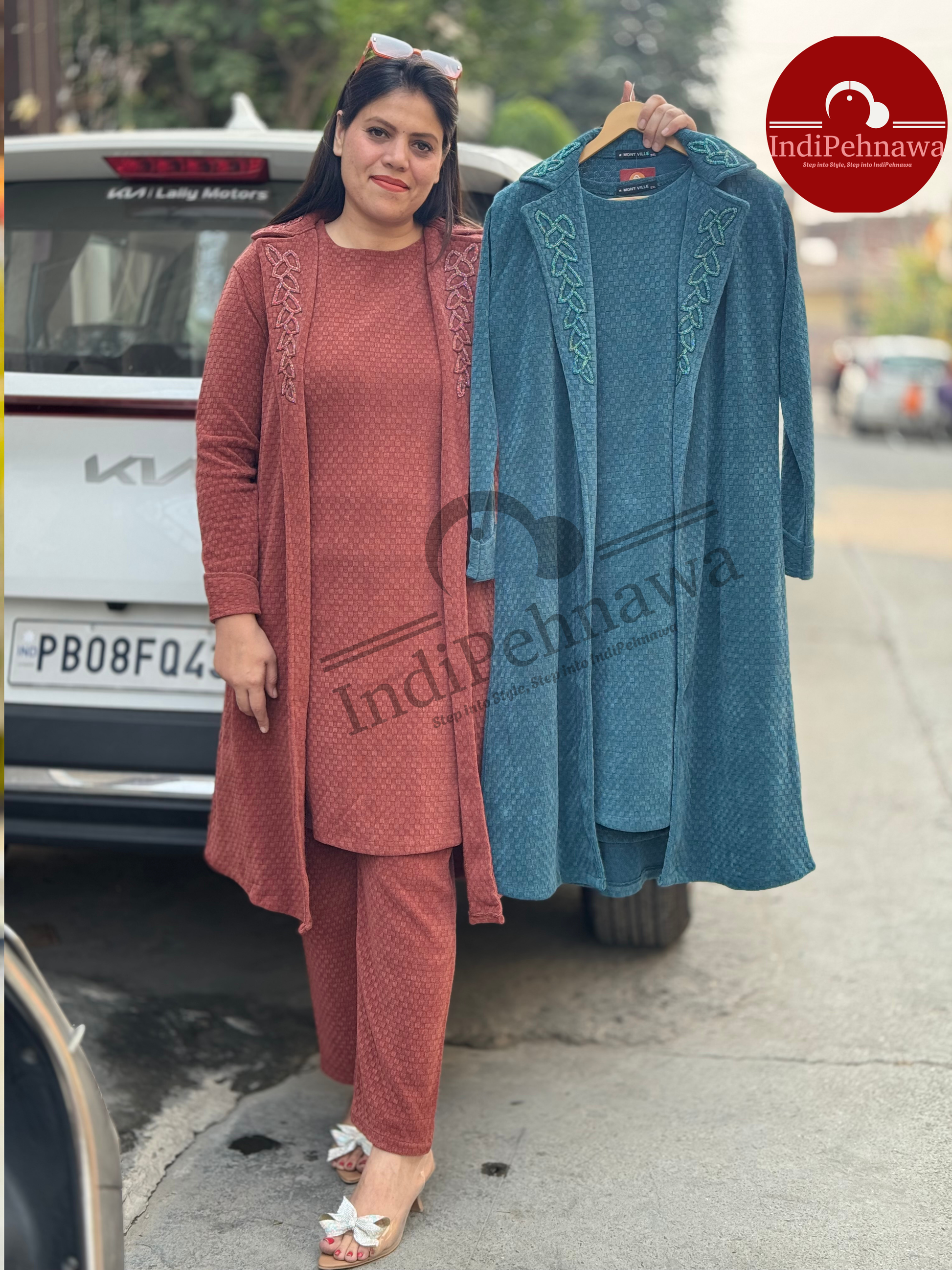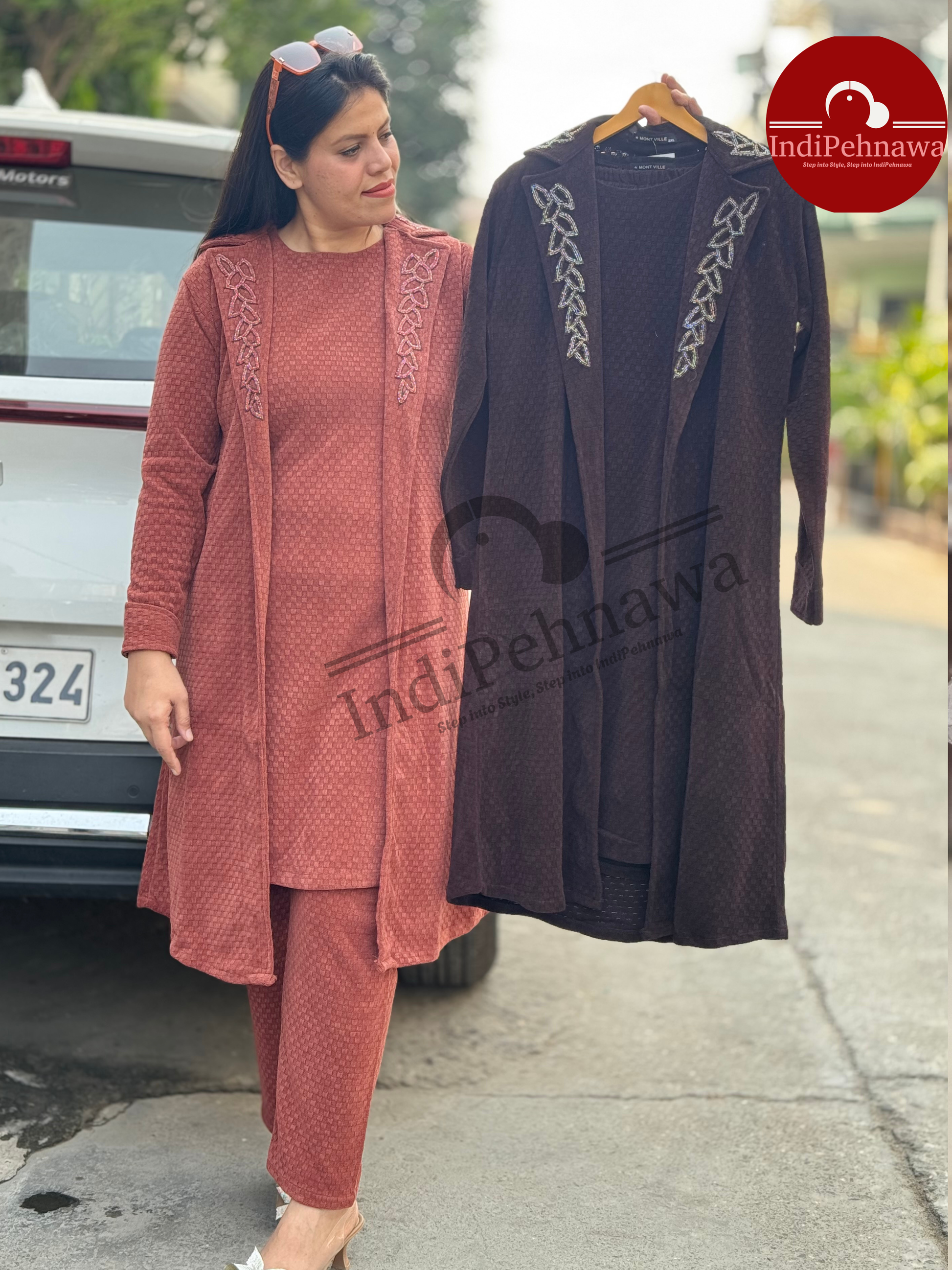 Elevate your wardrobe with this exquisite three-piece shrug ensemble crafted from premium channel wool. Featuring intricate hand-worked embellishments, each piece showcases meticulous artisanal detailing that sets it apart. The luxurious wool fabric drapes beautifully while providing warmth and comfort for year-round wear. Available in sizes up to 46, this versatile shrug collection offers the perfect blend of traditional craftsmanship and contemporary style. Ideal for layering over dresses, kurtas, or casual wear, these pieces are designed for those who appreciate quality and refined aesthetics.