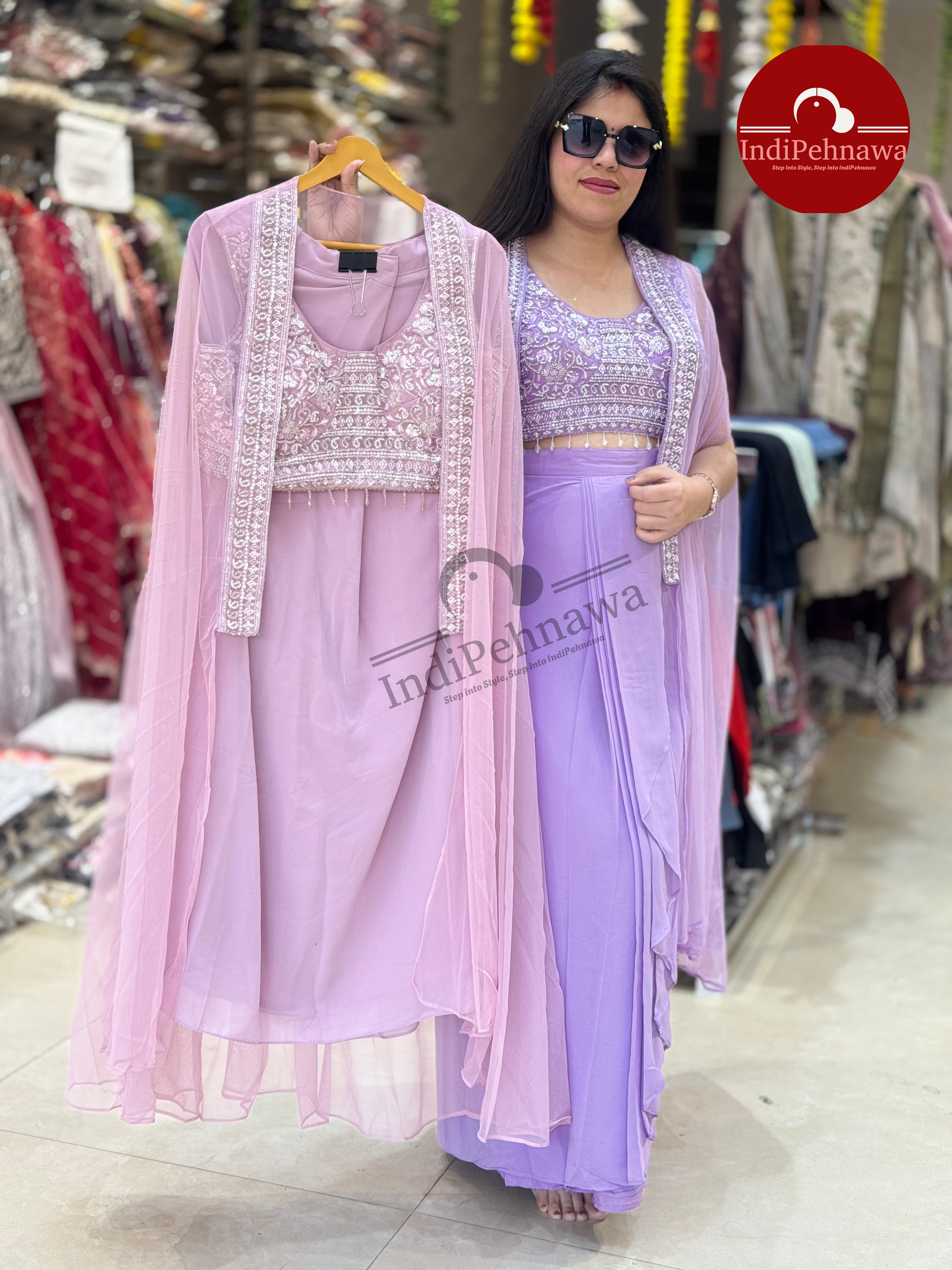 This Designer Shrug Choli combines traditional charm with a modern Indo-Western flair, perfect for parties and special occasions. Crafted from premium georgette fabric, it offers a graceful drape and comfortable fit. The three-piece set includes a stylish shrug, a choli, and a coordinating bottom, all available in sizes M to XXL with alteration options for a tailored look. Elevate your festive wardrobe with this elegant ensemble designed to blend sophistication and contemporary style effortlessly.