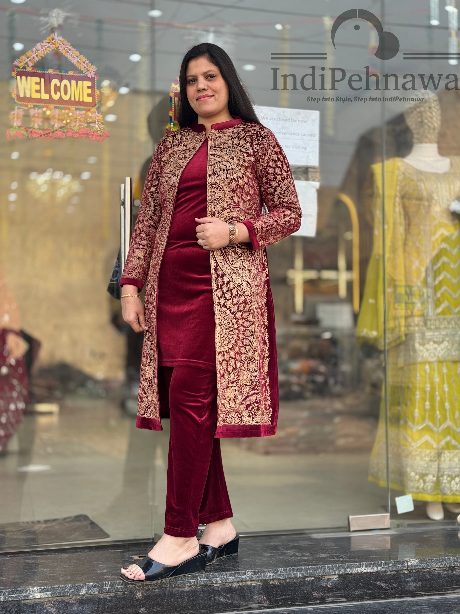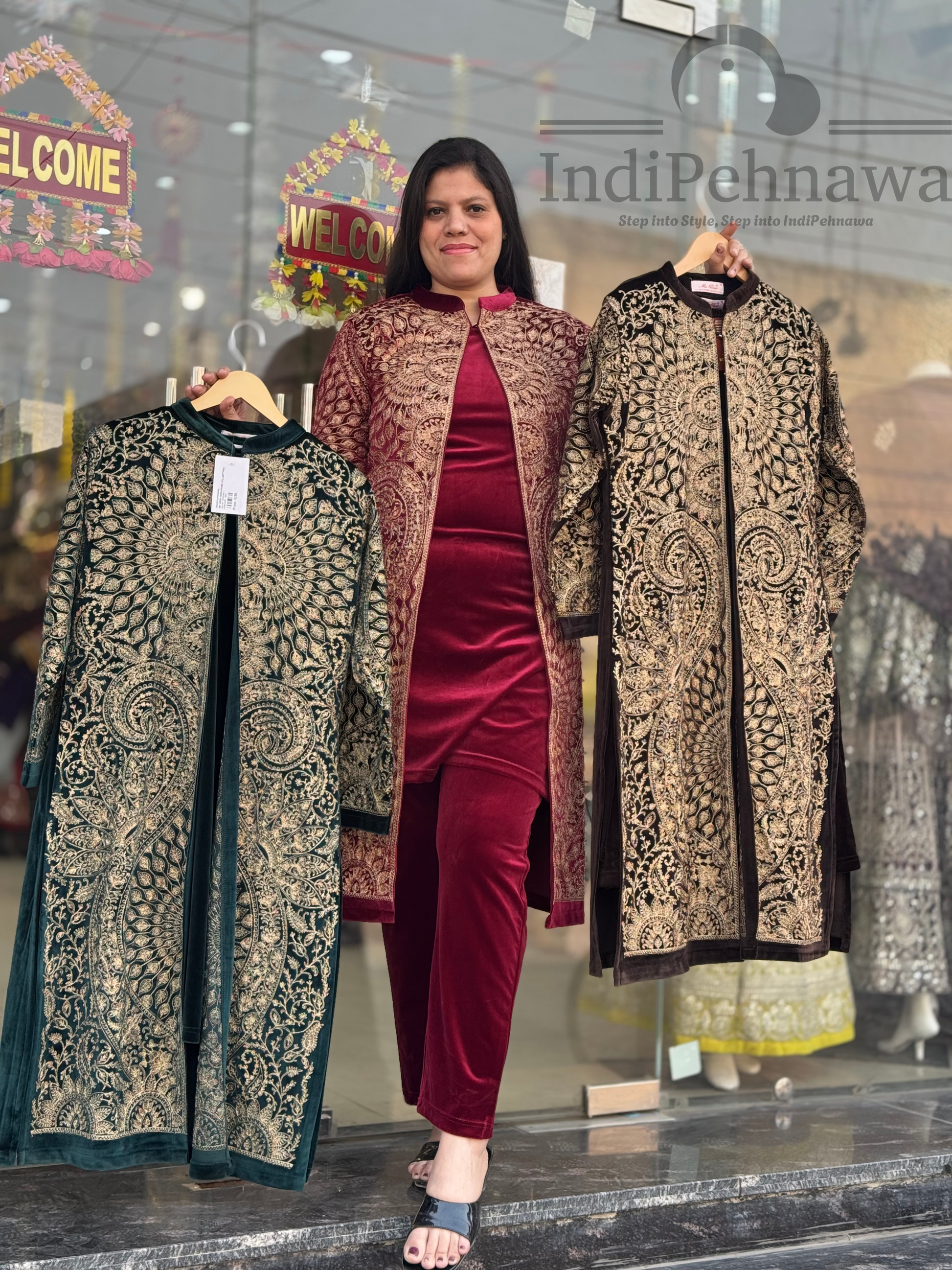 Upgrade your wardrobe with our Elegant 3-Piece Premium Cordset. Made with premium velvet for a luxurious feel. Sizes ranging from M to 3XL ensure a comfortable fit. The intricate thread work on the long shrug adds a stylish touch. Comes with a shrug length of 45, inner length of 38, and bottom length of 40. This 3-piece set is the perfect combination of style and comfort.