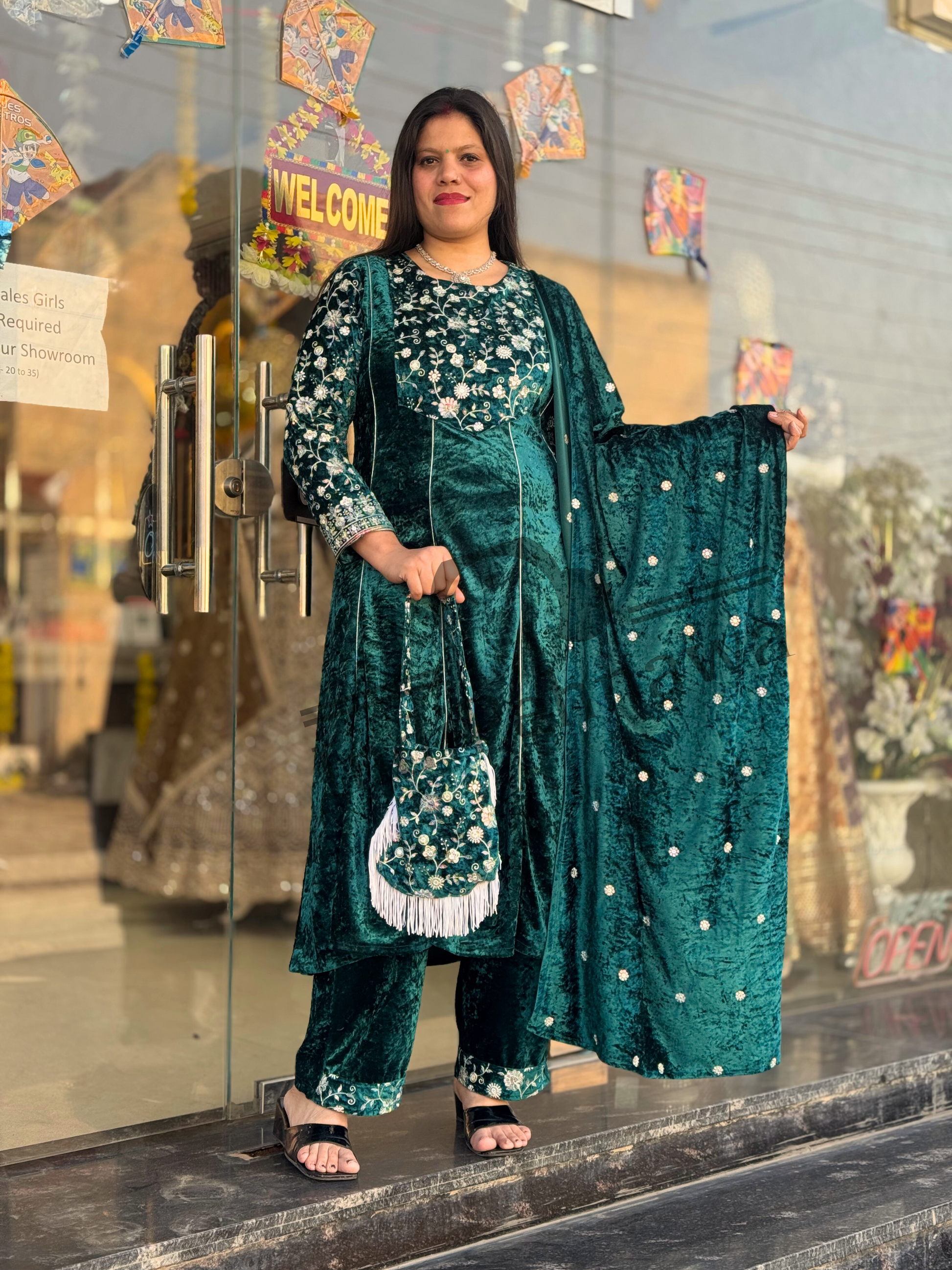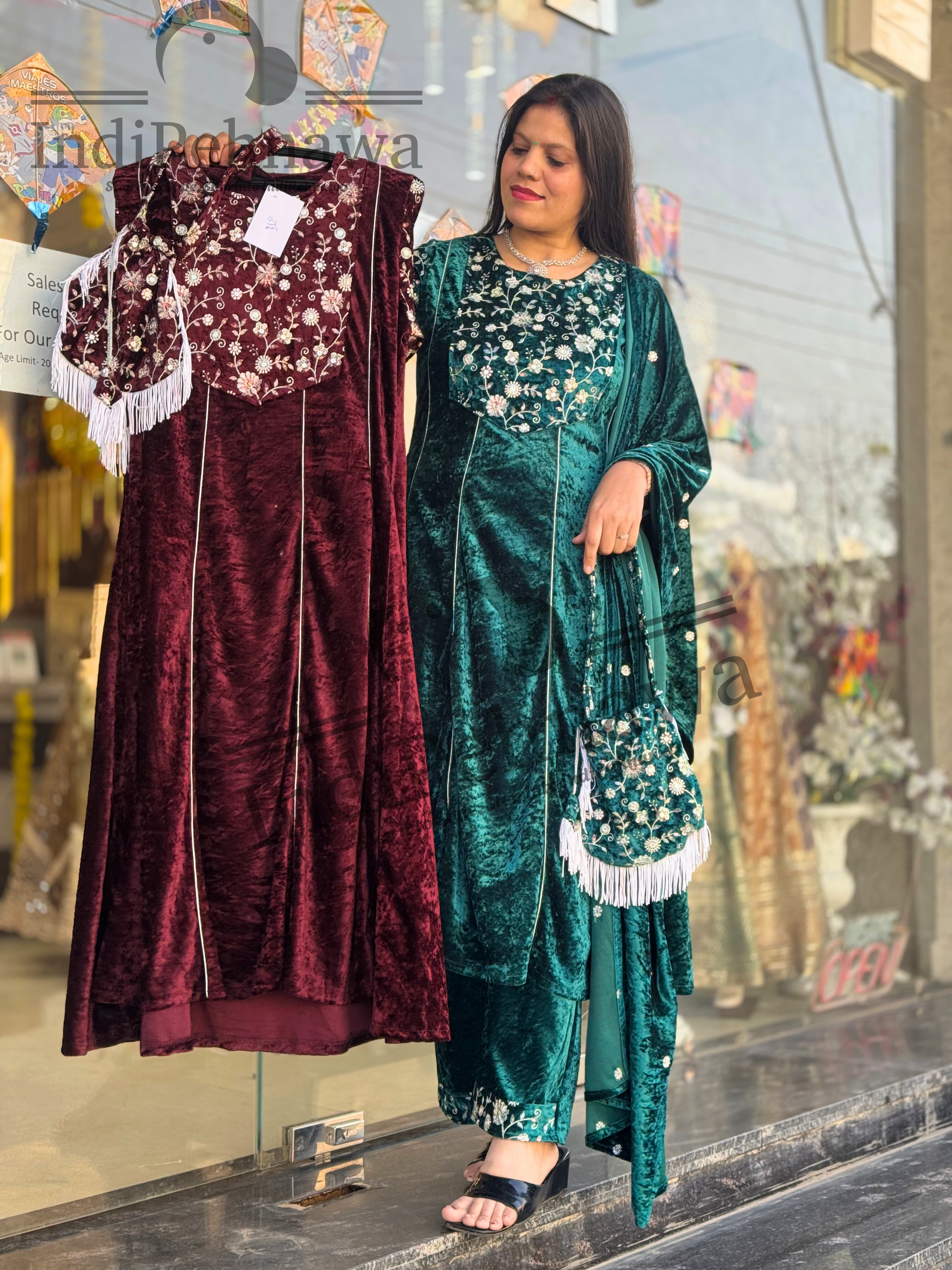 Elegant Anarkali Suit in Crushed Velvet with Potli Bag – Perfect for Festive Glam