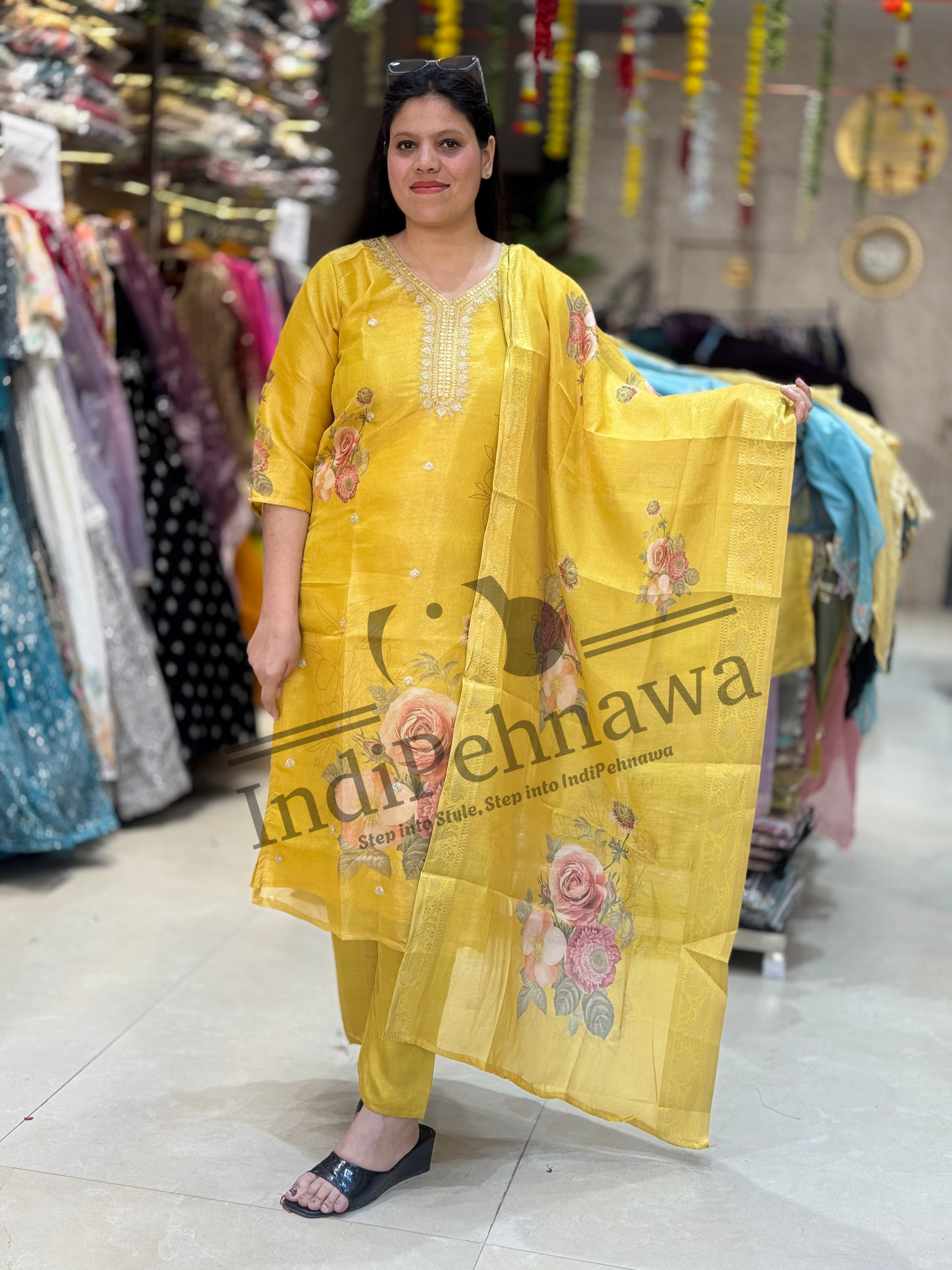 Elevate your wedding and festive look with our Elegant Banarasi Silk Suits. Made from high quality Banarasi Silk fabric, these suits feature exquisite floral prints and intricate thread work on the shirt. Available in sizes M to XXL with a shirt length of 45 and bottom length of 38, these suits are perfect for any celebration.