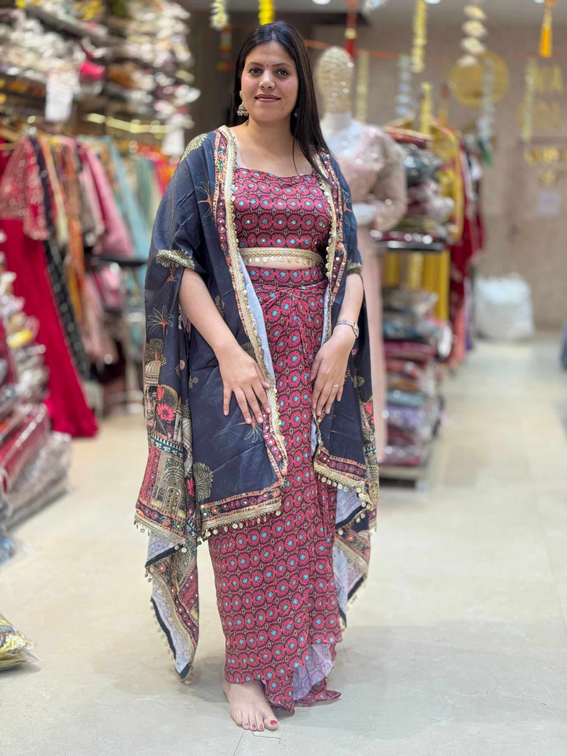 ELEGANT CROPE TOP LACHA SKIRT WITH CAPE DRESS