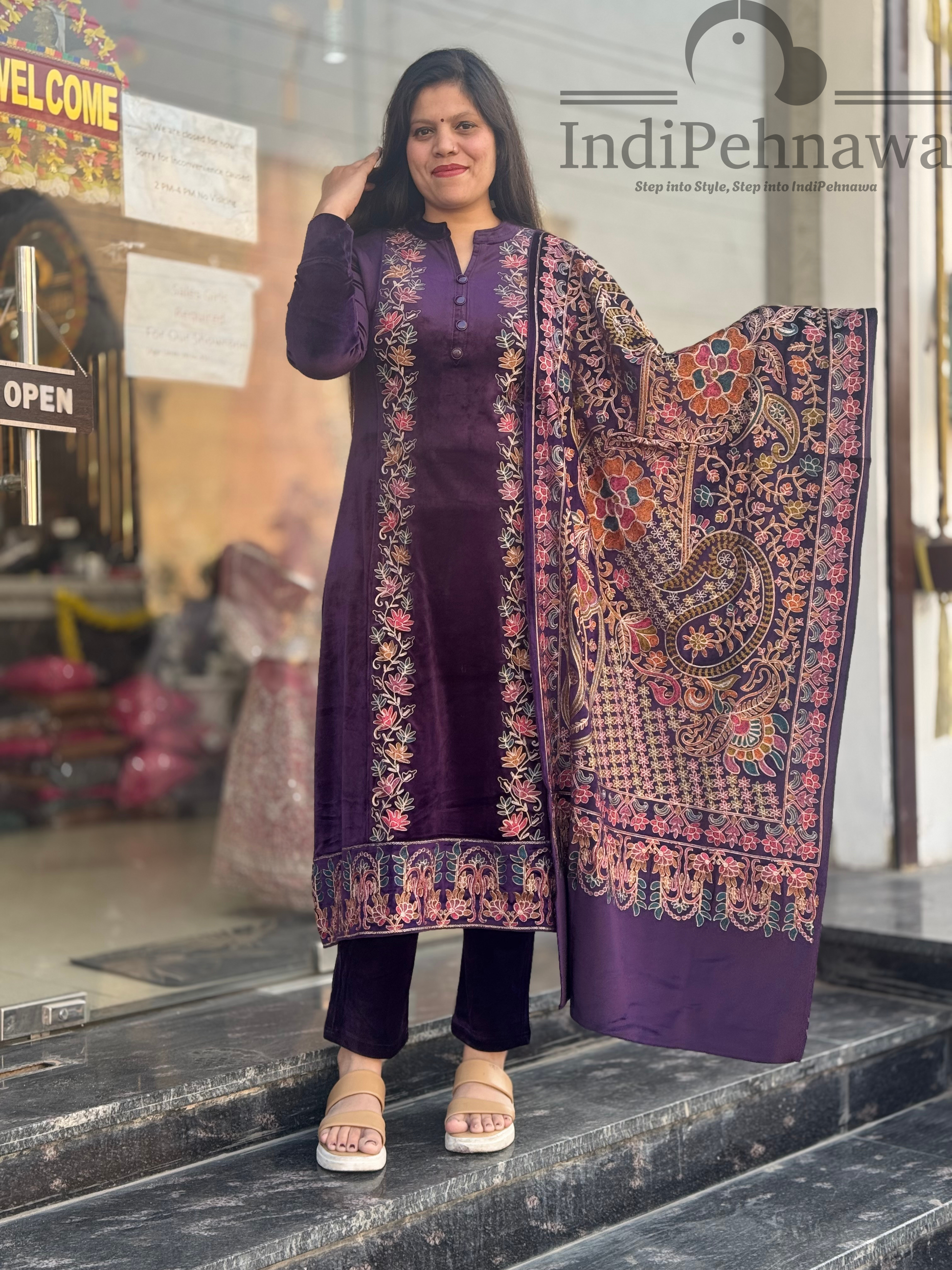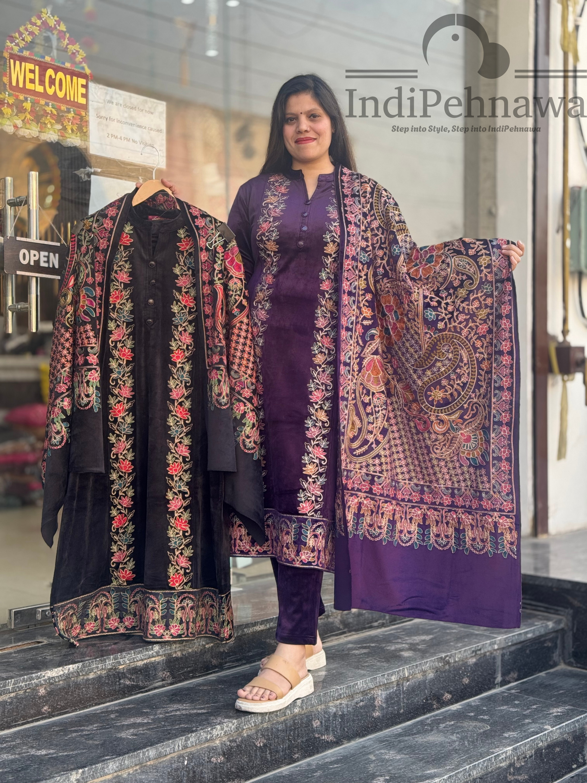 Elegant Velvet Suit with Exquisite Hand Embroidery & Full-Length Shawl