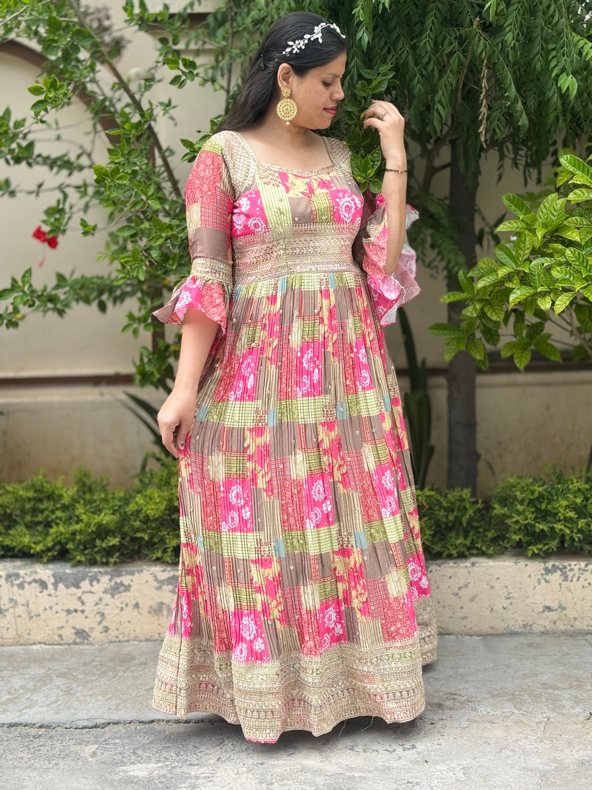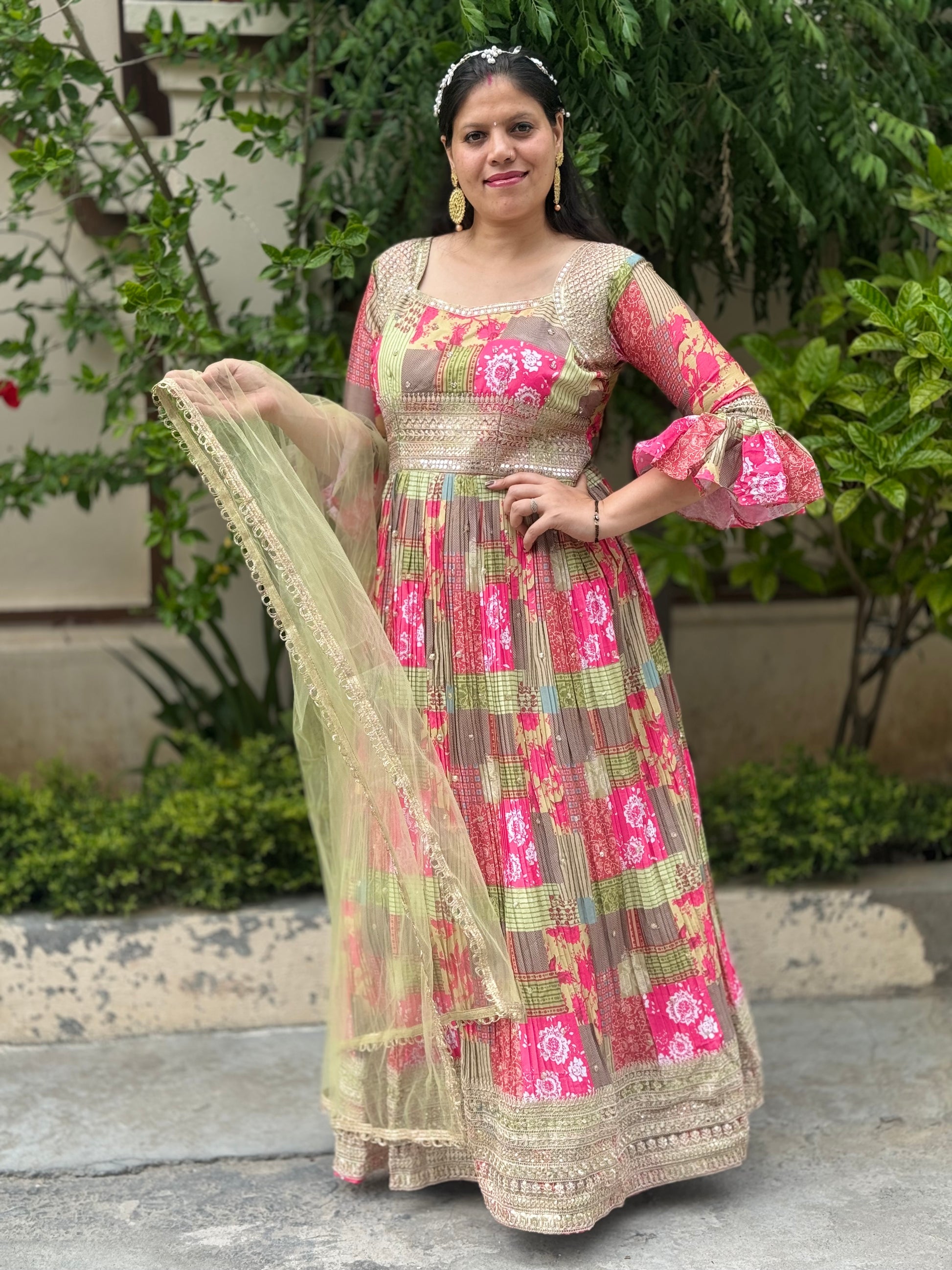 Be the center of attention in this stunning Flourescent Green Chinon Lehnga! Made with pure Chinon fabric, this gown is sure to turn heads with its full heavy work and 60-inch length. With sizes ranging from M to XXXL, alterations may be needed for the perfect fit. Don't miss out on this elegant piece.