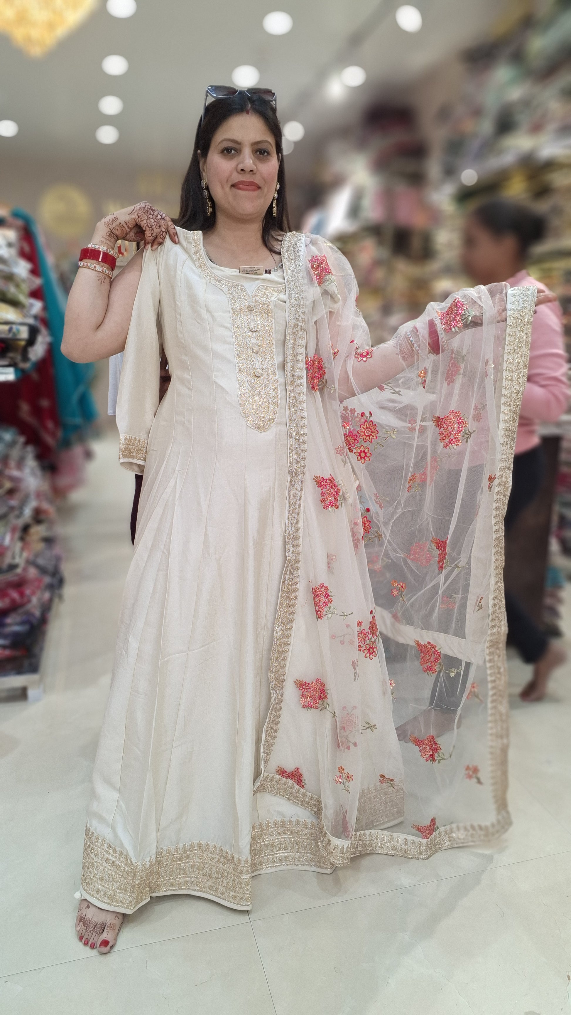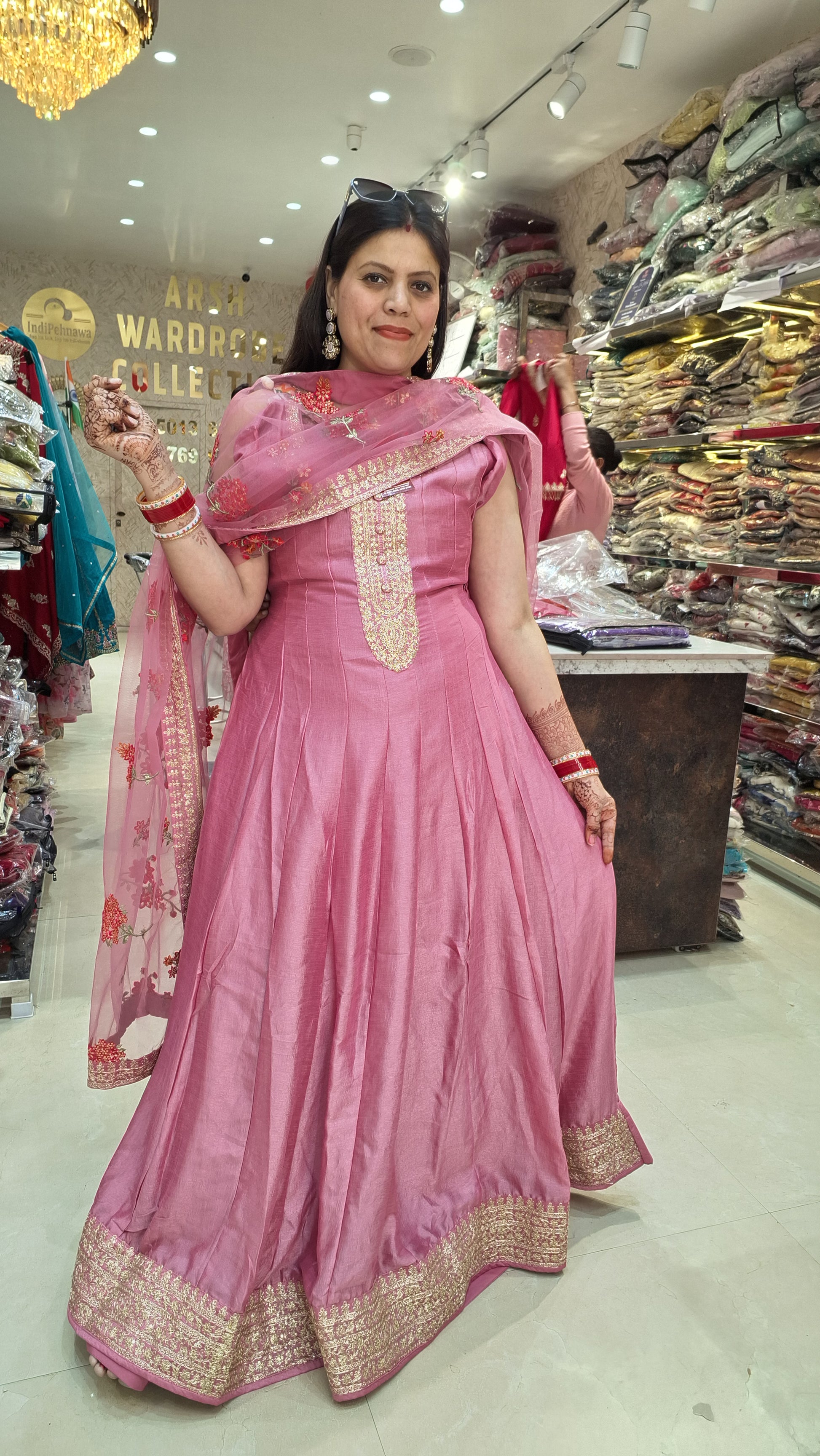 FULL FLAIR PARTY WEAR GOWN WITH NECK AND BOARDER GOTA PATTI DESIGN WITH NET DESIGN FLOWER DUPPTA