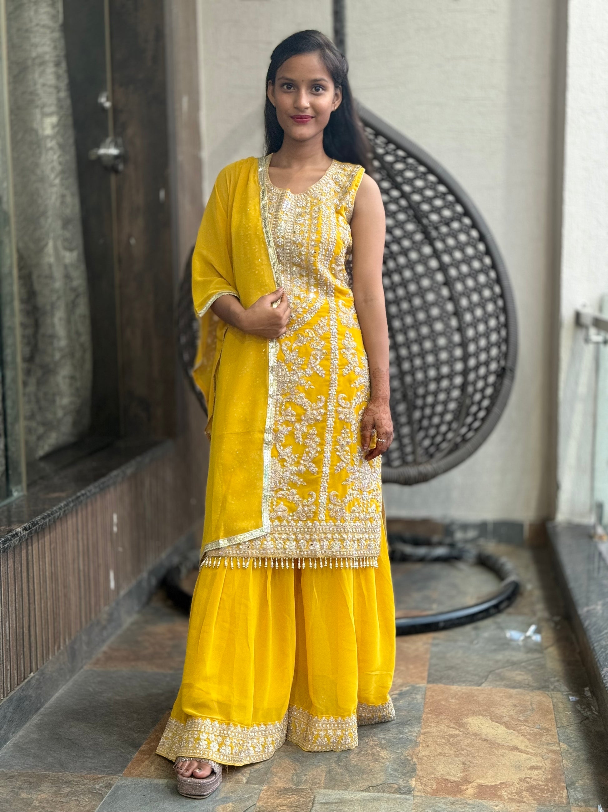 Upgrade your ethnic wardrobe with our Haldi Special Yellow Mirror Work Sharara! Crafted with heavy georgette and intricate mirror work, this set comes in a range of sizes, from S to XL. Plus, the top length of 38 and bottom length of 39 ensure a perfect fit. Get ready to shine at any occasion with this stunning ensemble.