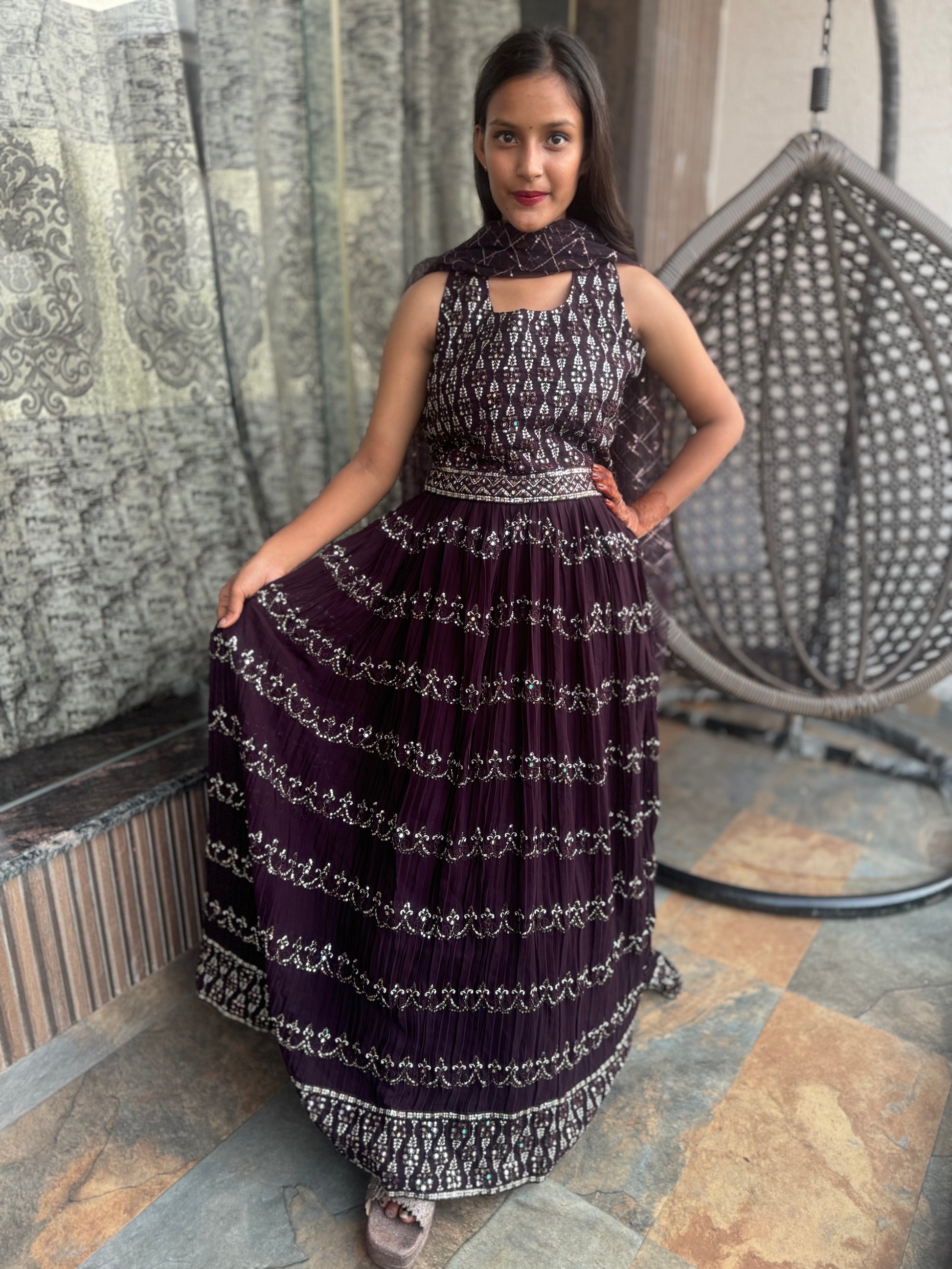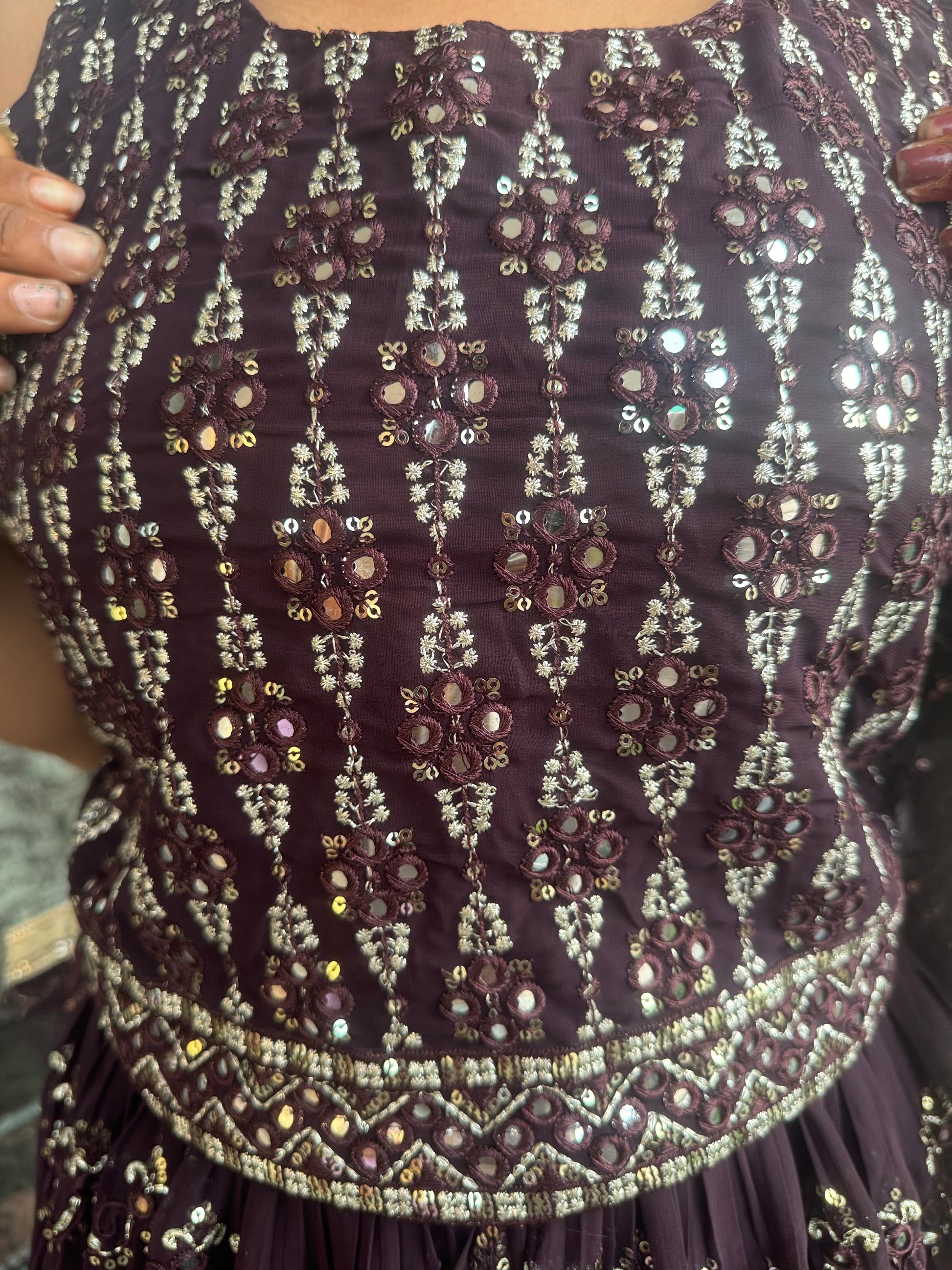Elevate your style with our Heavy Wine Georgette Lehnga. Available in sizes S to XXXL, the top length is 18 inches and the lehnga length is 41 inches. Made of heavy georgette fabric with a detachable can-can, this lehnga is perfect for special occasions. Alterations may be needed for the choli.
