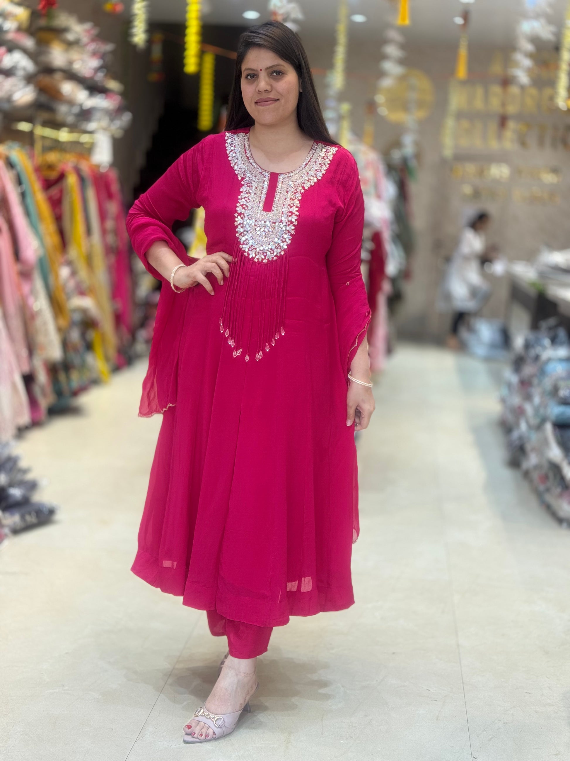 HOT PINK PURE SILK NECCK DESIGN WITH SILVER PEARL WORK ANARKALI