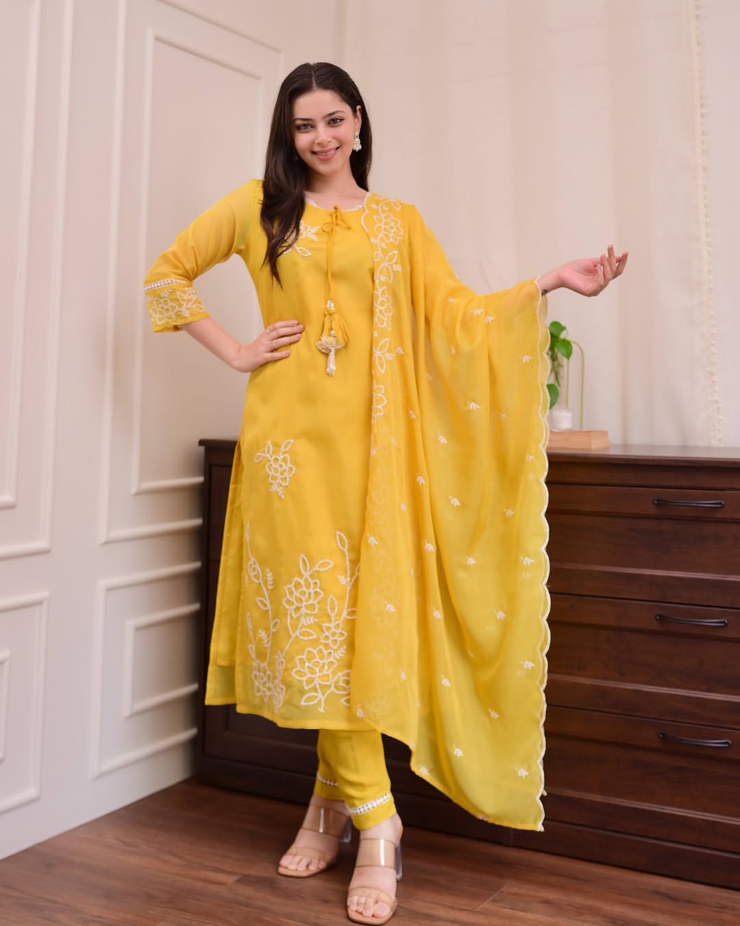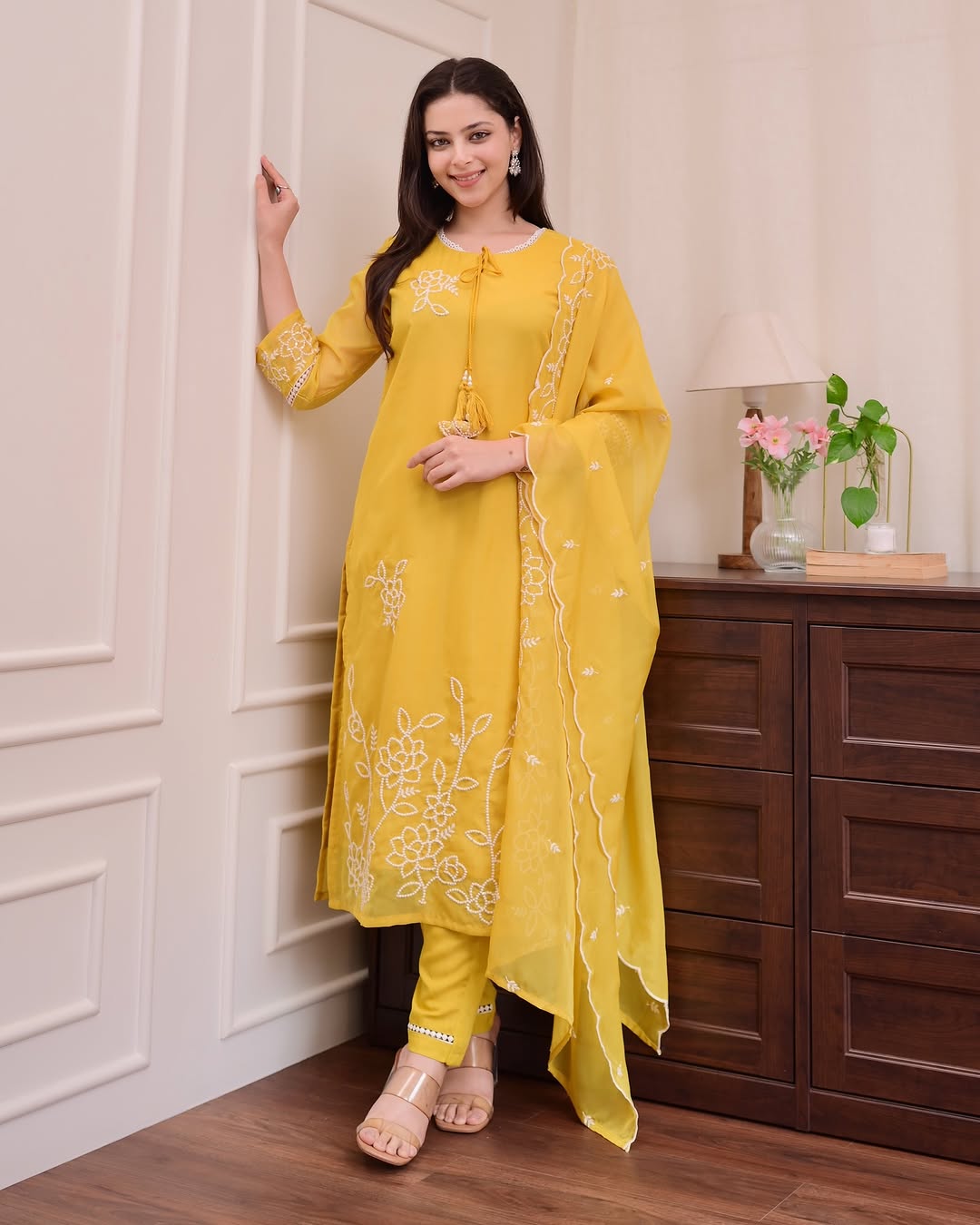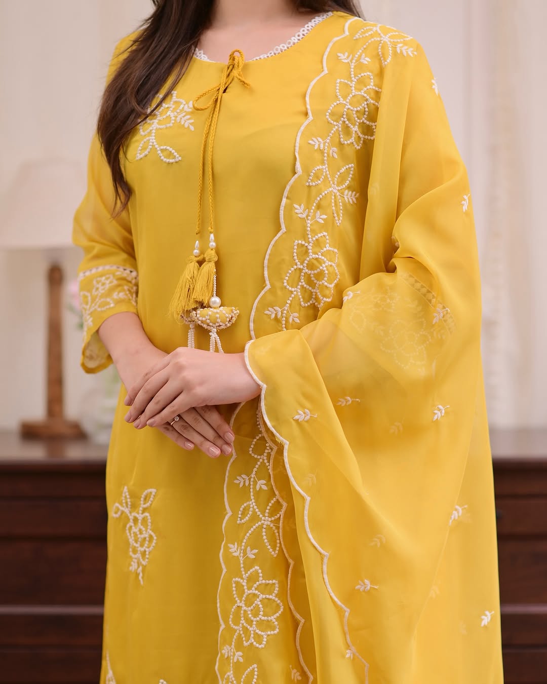 Pent pure shantoon with lace organza DUPPTA SUPERB designer yellowish colour size m to xxl avail