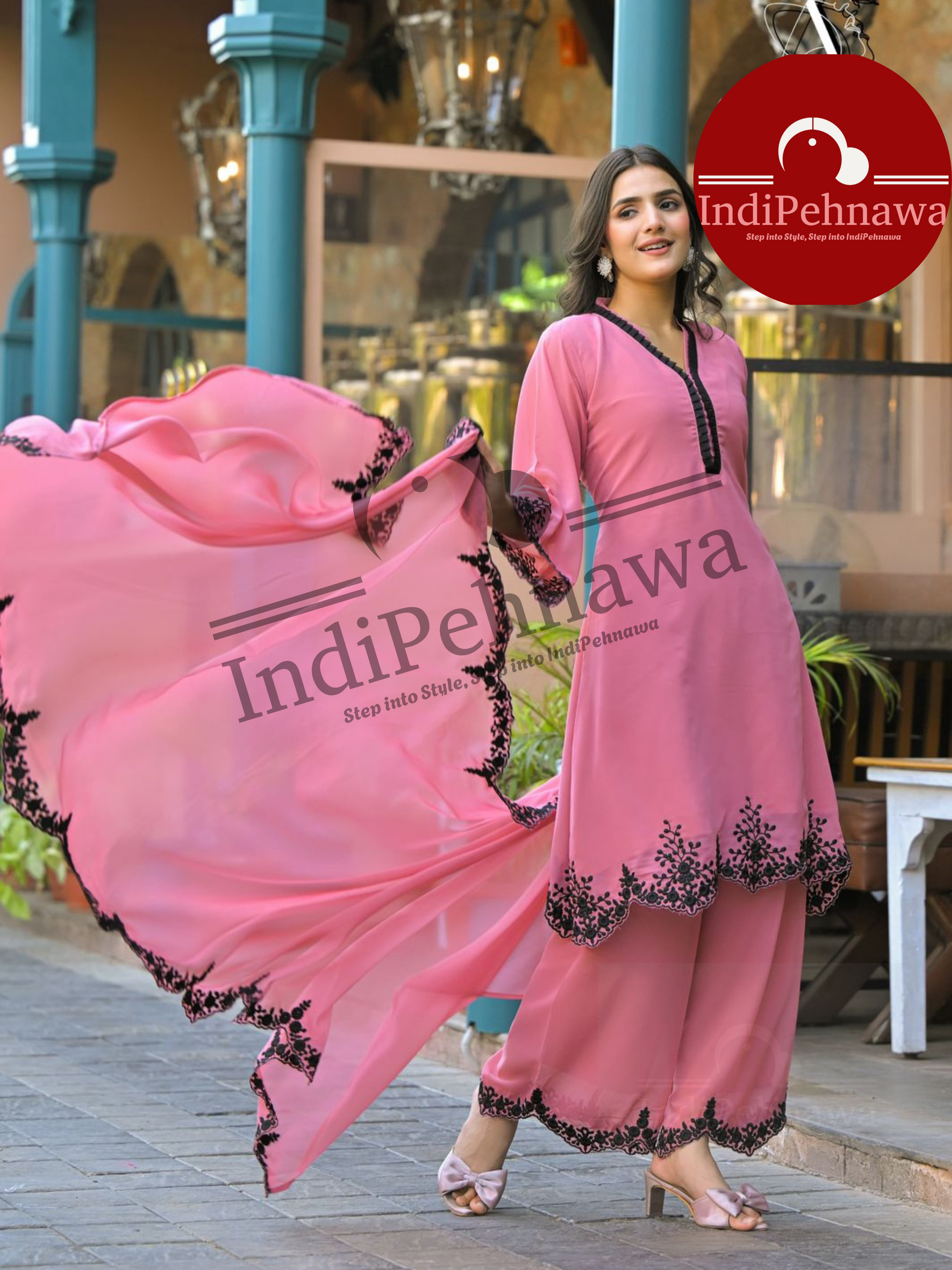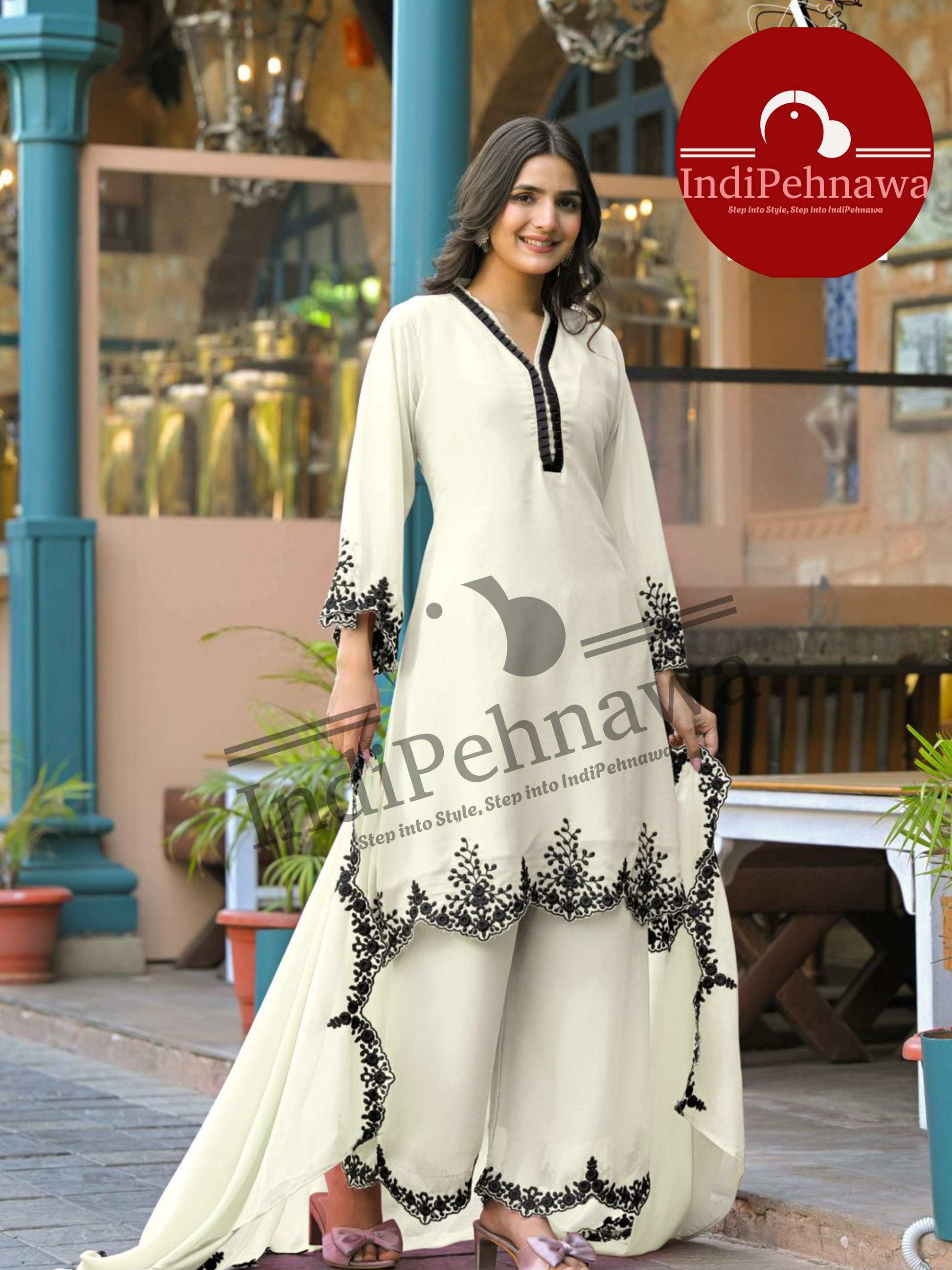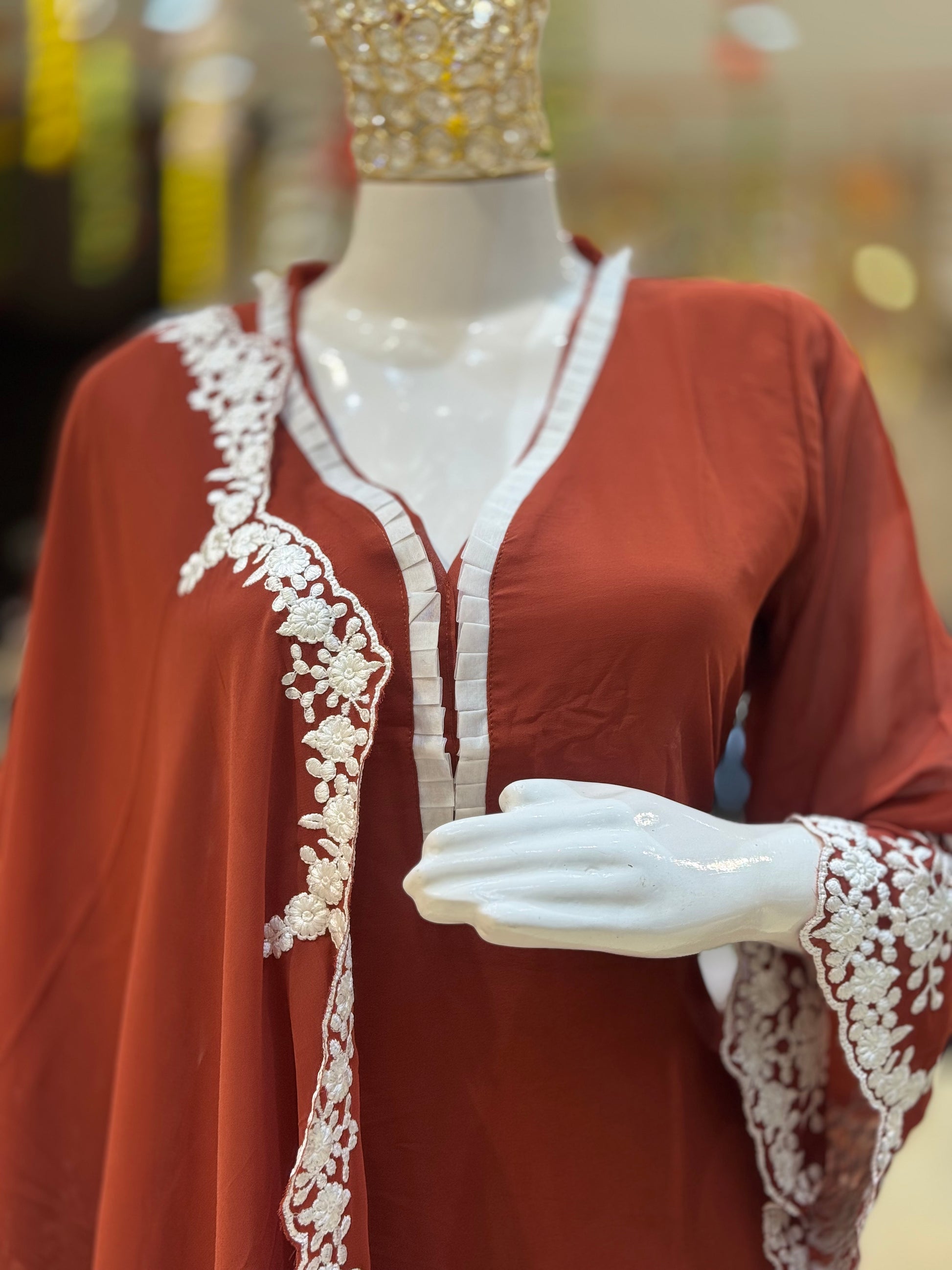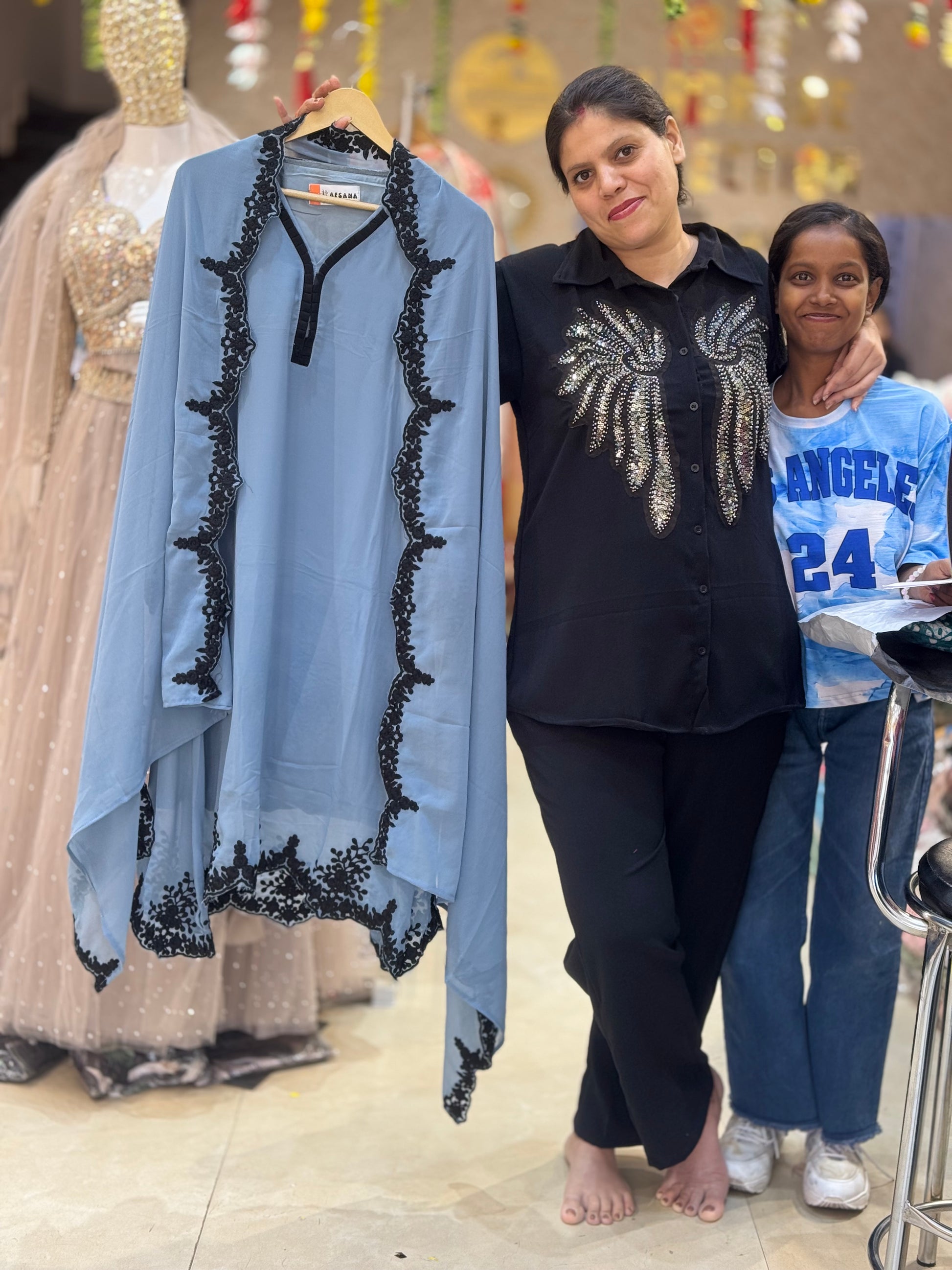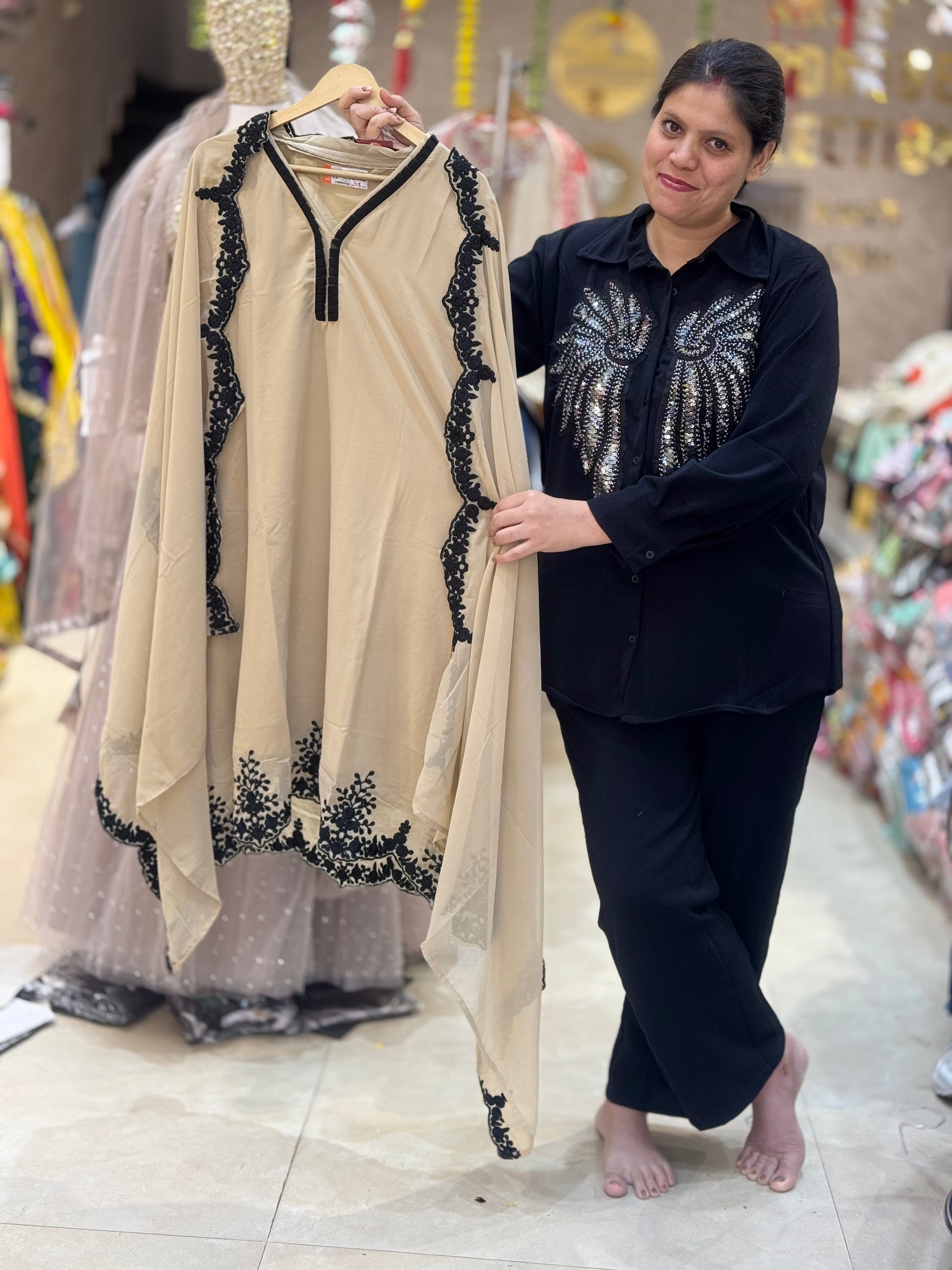 Stylish and elegant georgette 3 pc set , Size m to xxxl, febric georgette with linning, bottom type Jaffa. Full blackthread work on suit or Duptta’s