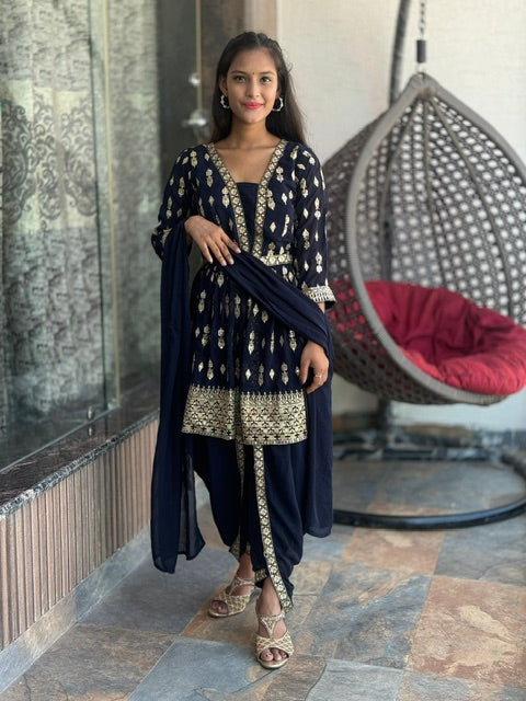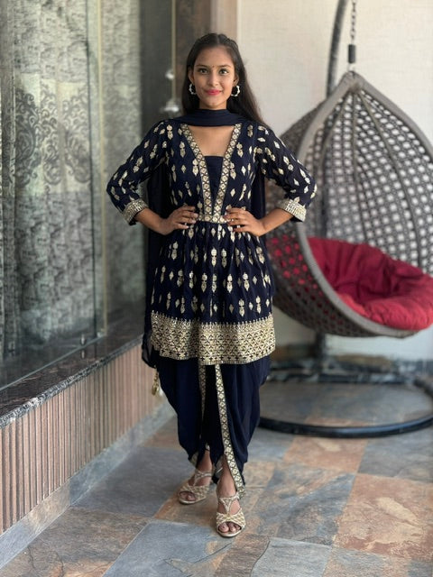Introducing the elegant INDIPEHNAWA DHOTI STYLE (2001), available in sizes S to XL. Made from high quality georgette fabric, this traditional Pakistani-style outfit features stunning tilla work on both the front and back of the shirt. With a length of 35 inches for the shirt and 40 inches for the bottom, this outfit also comes with a lining attached for your convenience. Experience the beauty and comfort of this unique design today.