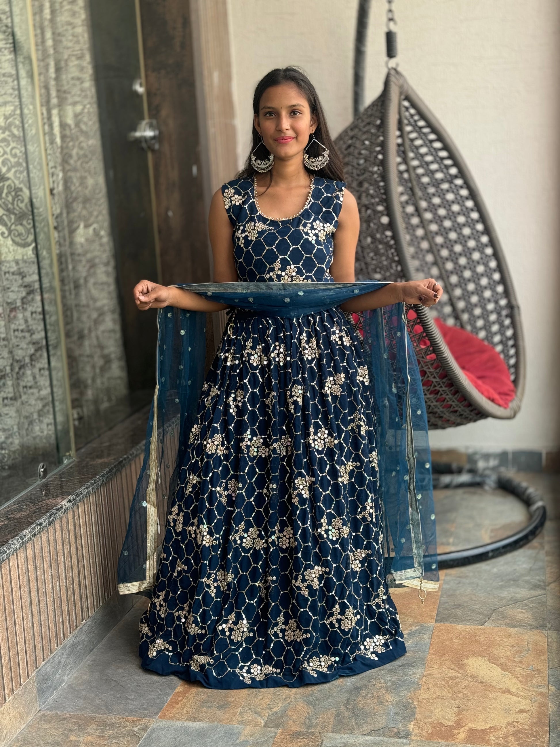 This elegant and stylish lehnga, article no. 5790, features a georget fabric with full heavy thread work and paper mirror work. The duppata is made of net with golden lace for added glamour. Available in sizes S to XL, with a top length of 18 and lehnga length of 40. Can-can and lining are also attached for a perfect fit.