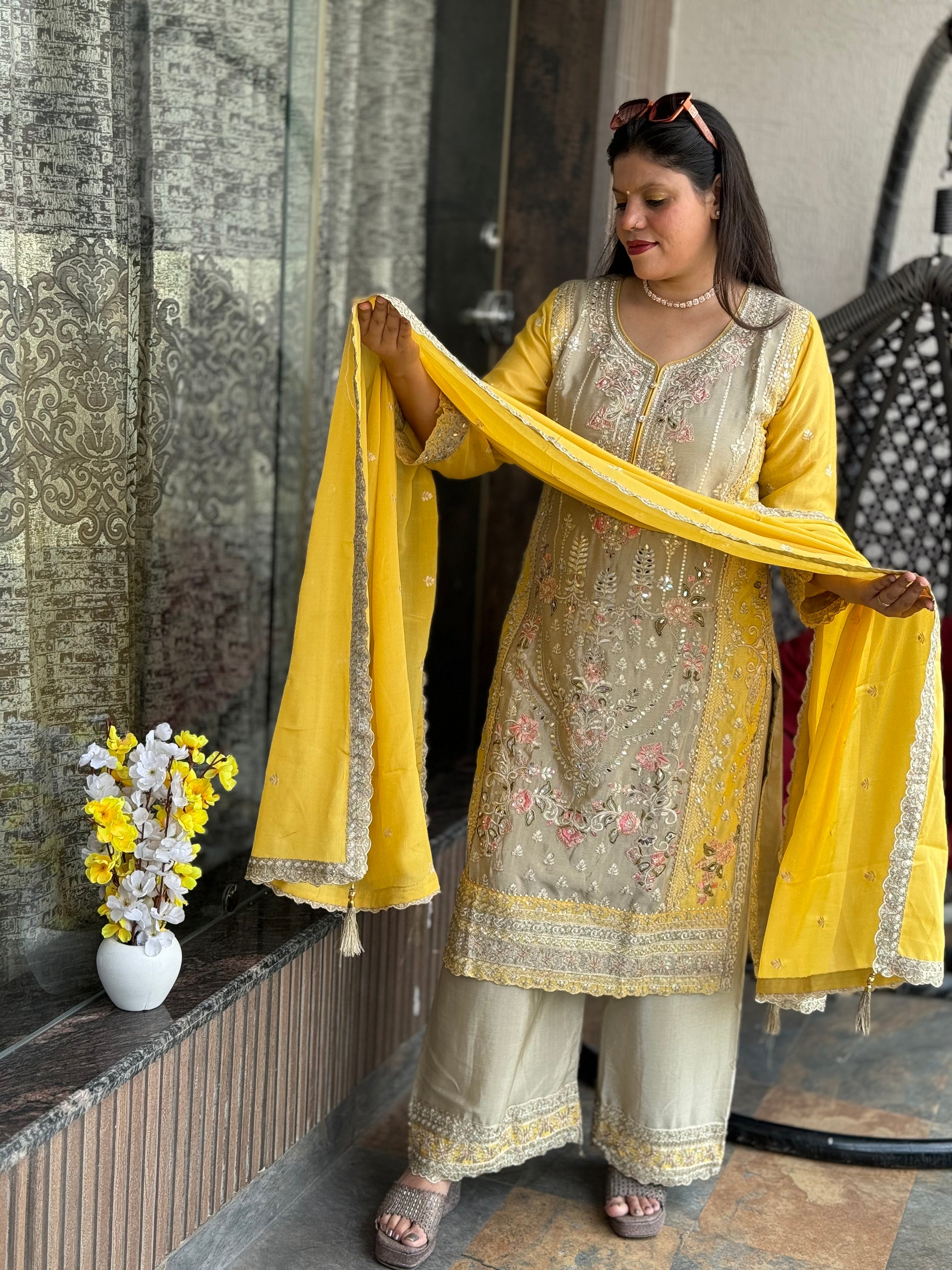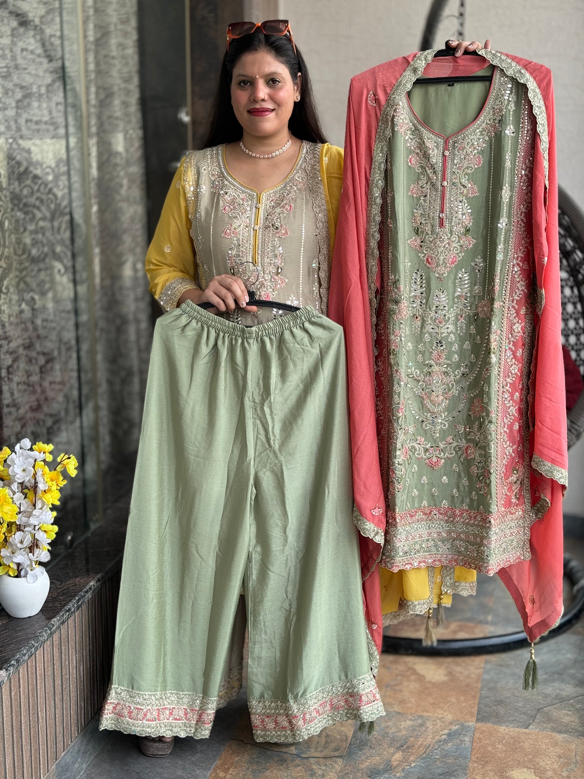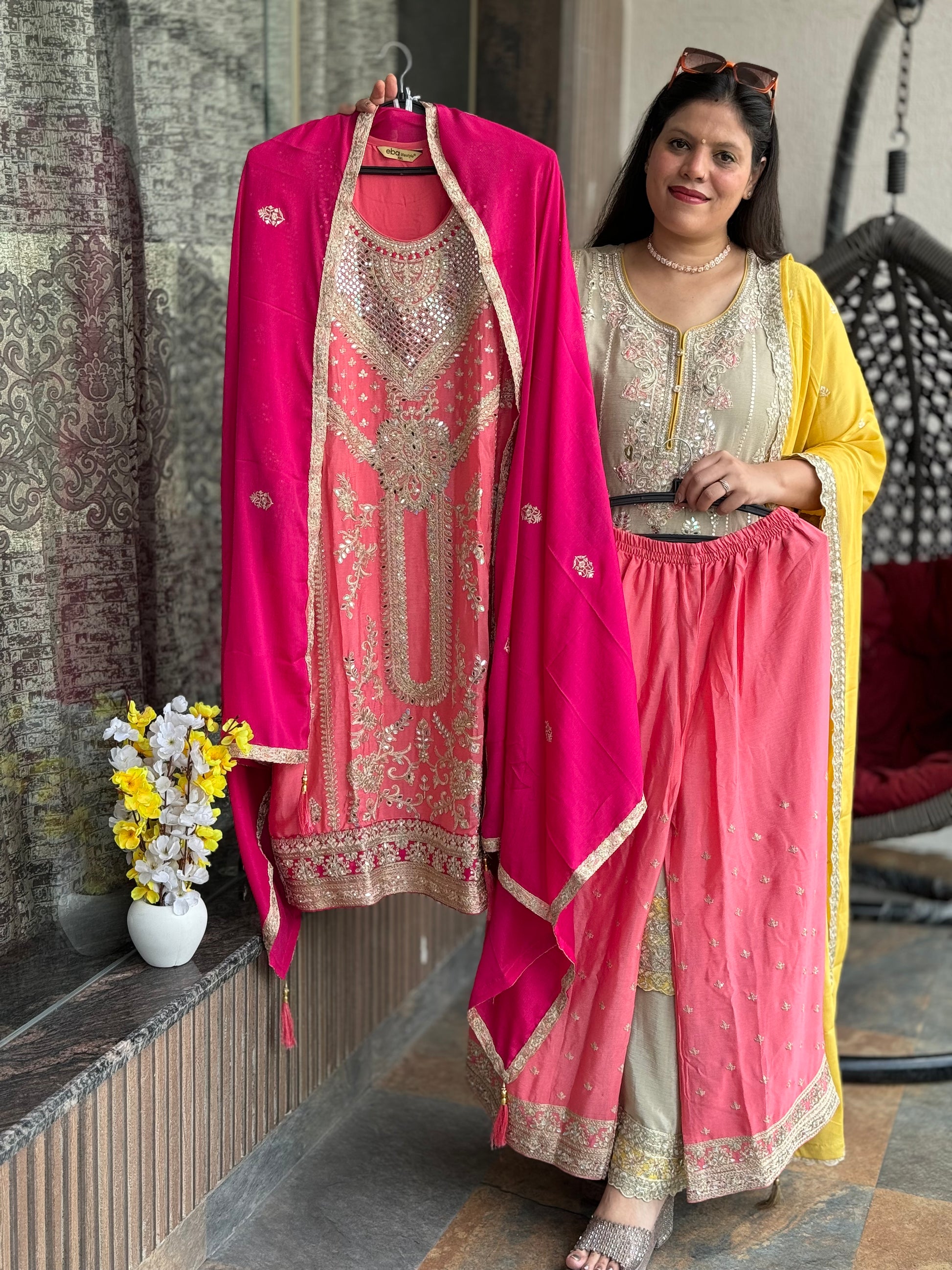 Looking for a stunning outfit for the upcoming festival season? Look no further! Our "INDIPEHNAWA FESTIVAL SPECIAL SUIT SET" has got you covered! Made from high-quality CHINON fabric, it boasts a length of 45 inches for the shirt and 41 inches for the bottom. This set also features beautiful ZIRCON, MIRROR, and THREAD work, as well as a fully-lined design and a 4-sided heavy lace on the dupatta. Available in sizes M to XXXL.