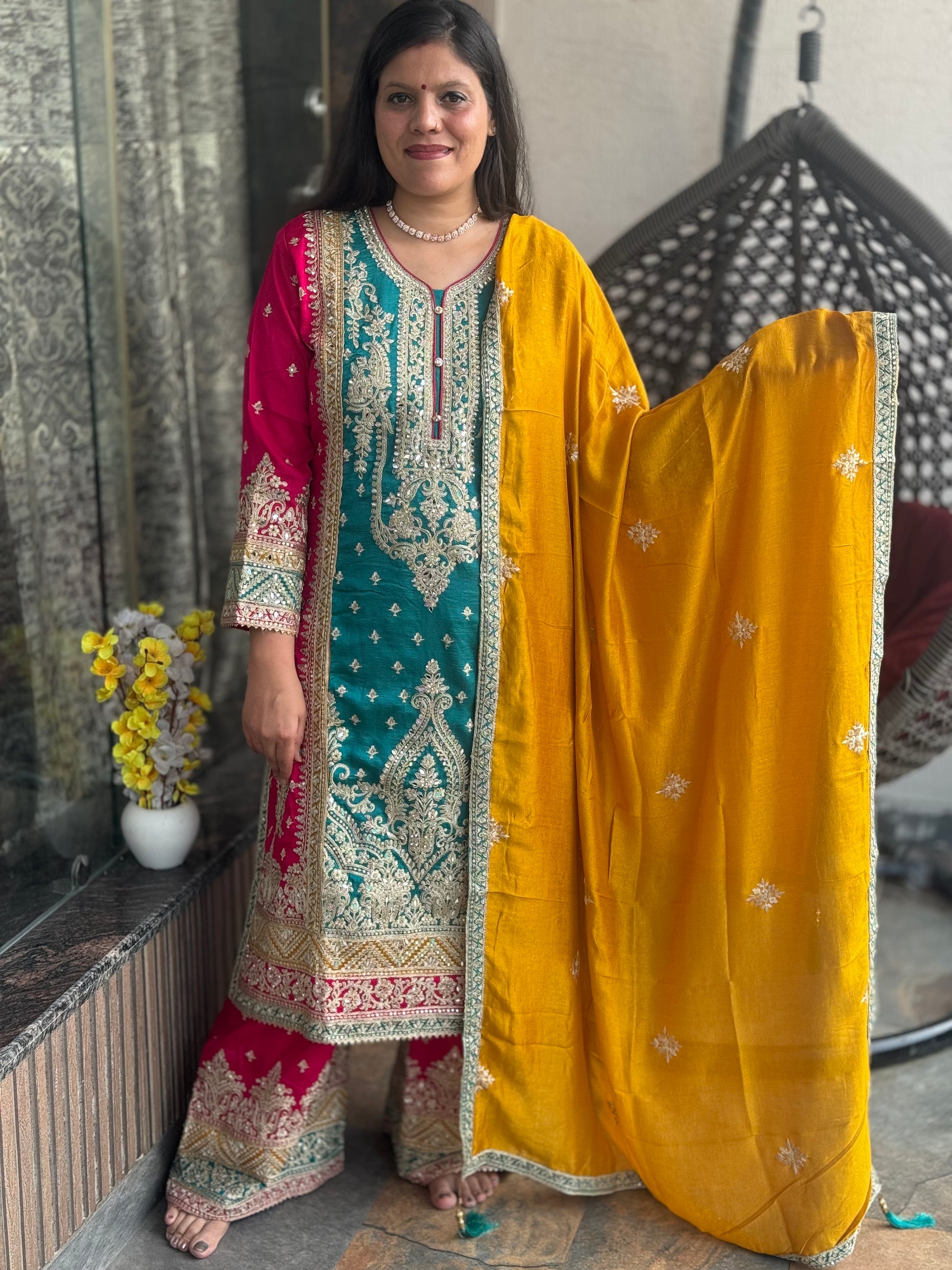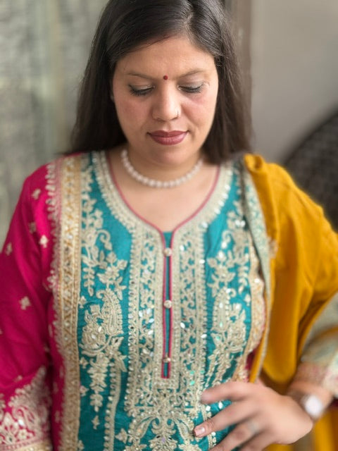 This INDIPEHNAWA HEAVY MIRROR AND MULTI COLOURED HOT SELLING PAKISTANI SUIT is made from heavy premium chinon with lining, providing a comfortable and stylish fit for sizes M to XXL. The shirt and bottom feature full heavy size mirror work, while the dupatta is adorned with four side heavy embroidery. Perfect for adding a touch of elegance to any occasion.