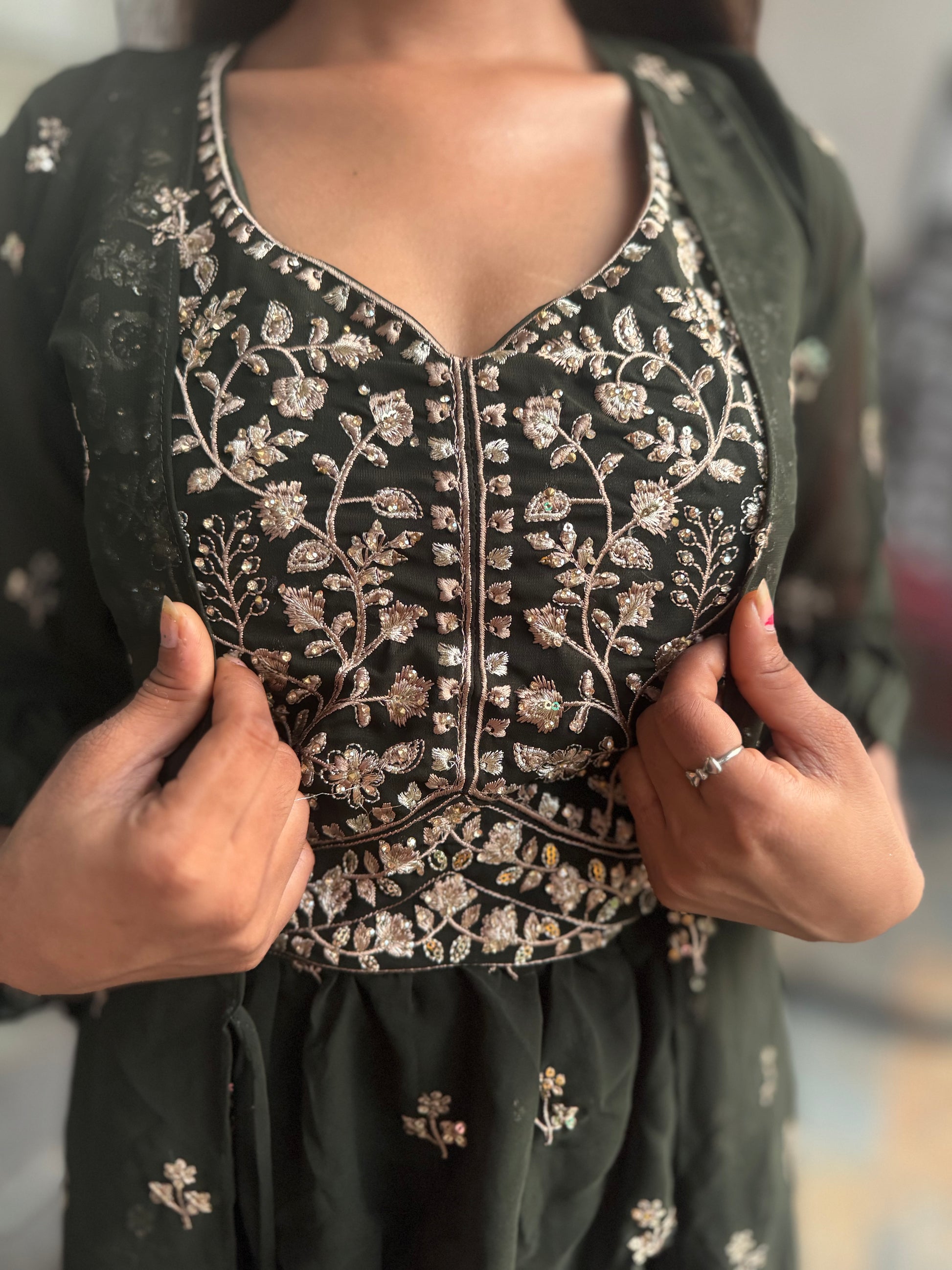 Upgrade your wardrobe with our INDIPEHNAWA INDO-WESTERN 3 PIECE PATHANI SET. Sizes S to XL can easily be altered to fit, providing a perfect fit every time. Made from high-quality georgette fabric, featuring intricate full hand work, and lengths of 21 for the top, 38 for the bottom, and 45 for the shrug, this set will make you look stylish and feel comfortable.