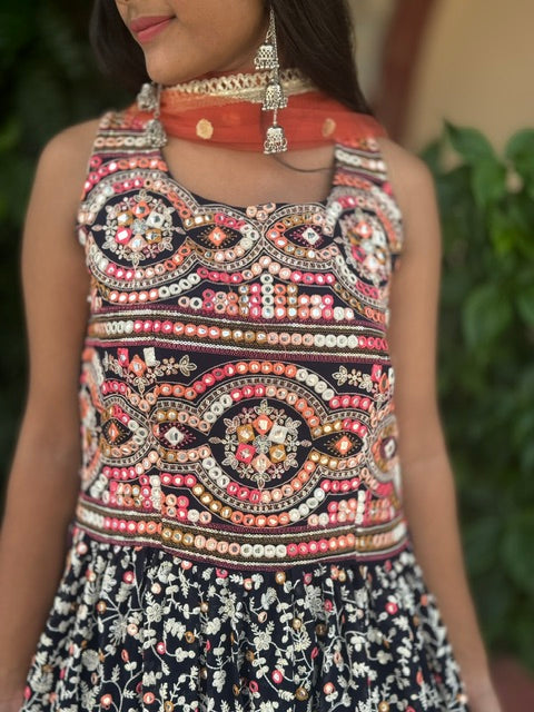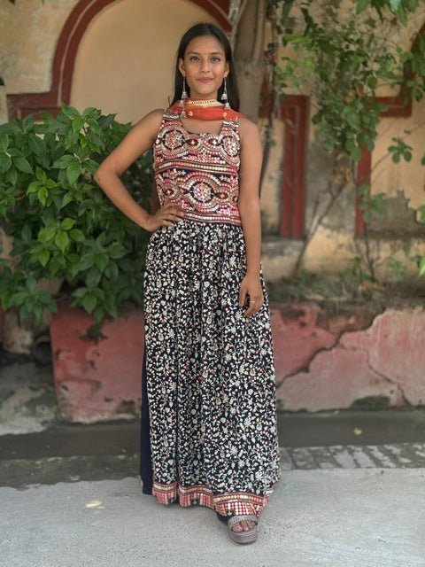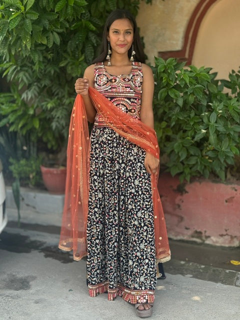 Elevate your ethnic wardrobe with our Indipehnawa Lukhnawi Naira Cut. Available in sizes S to XL, this georgette shirt features full thread work and measures 52 inches in length. Its bottom is 42 inches and comes with a heavy divider plazo and lining attached. Alterations may be needed for a perfect fit.