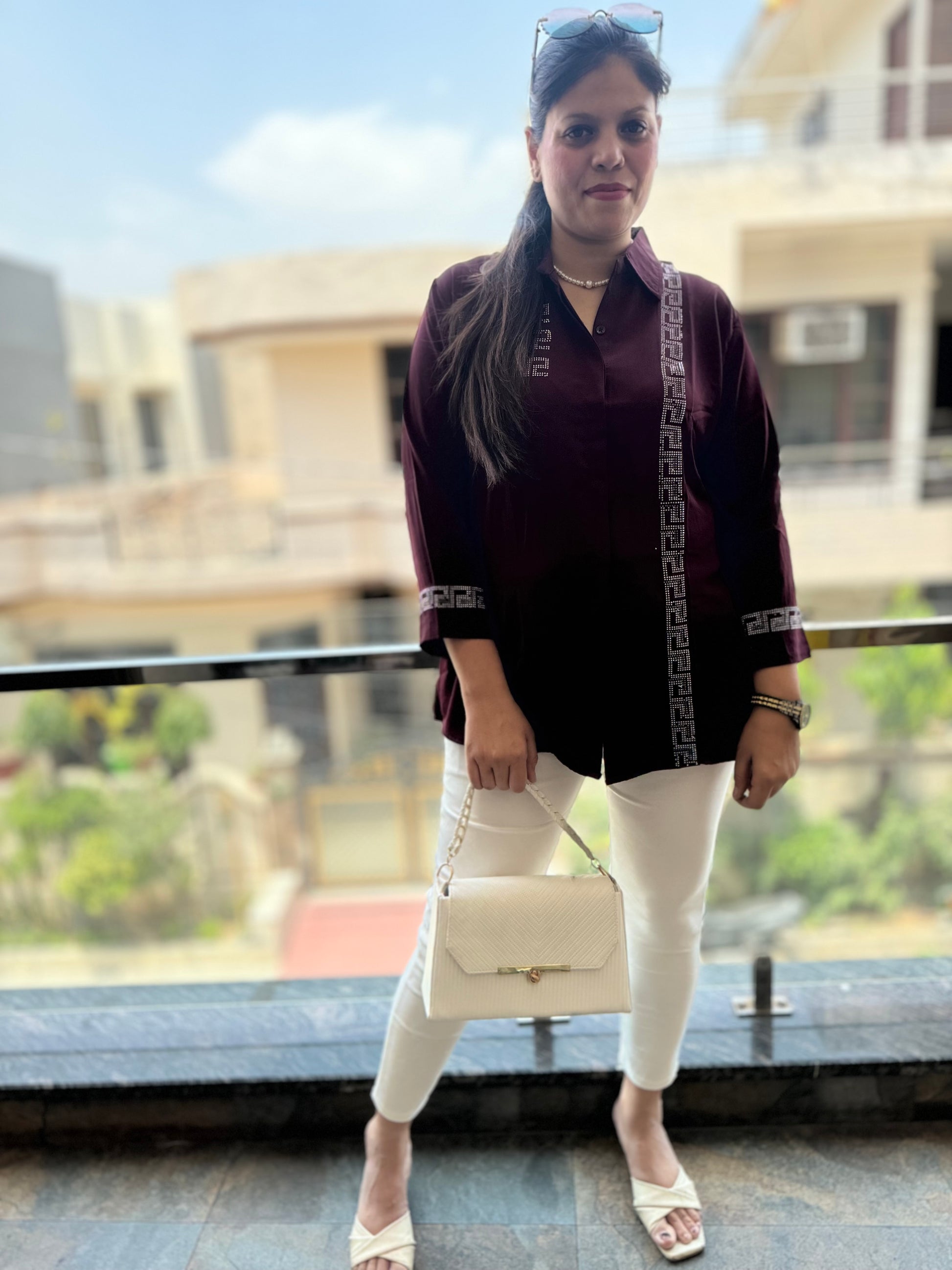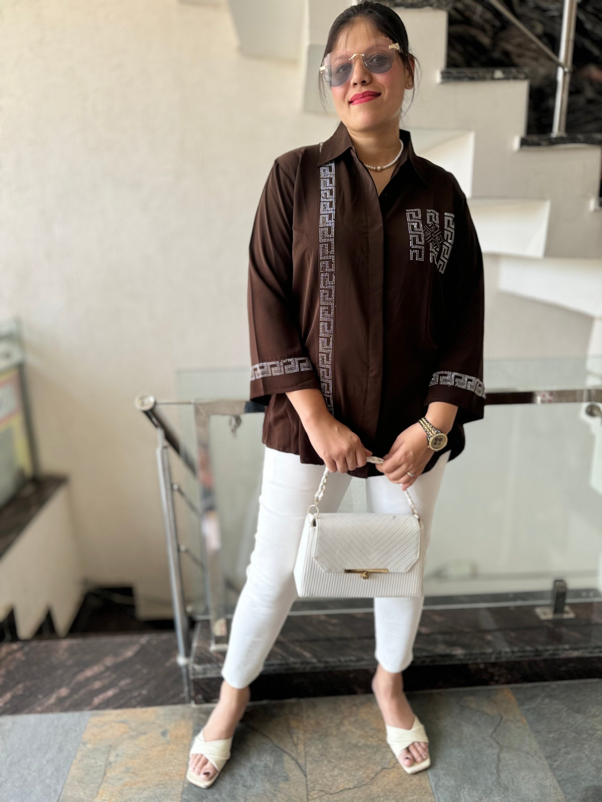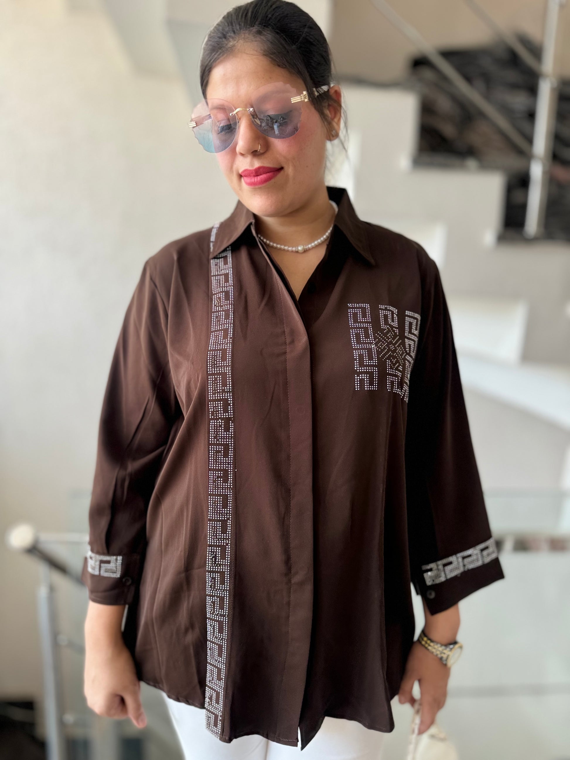 The IndiPehnawa Trendy Sirvoski Shirt is made of lightweight Crepe Cotton material, providing all-day comfort. It comes in M to 4XL (Free Size), offering a perfect fit for all body types. With a shirt length of 30 inches, this shirt is both stylish and versatile.