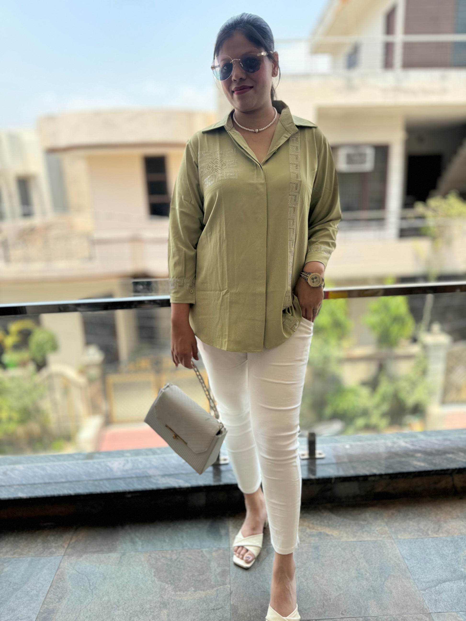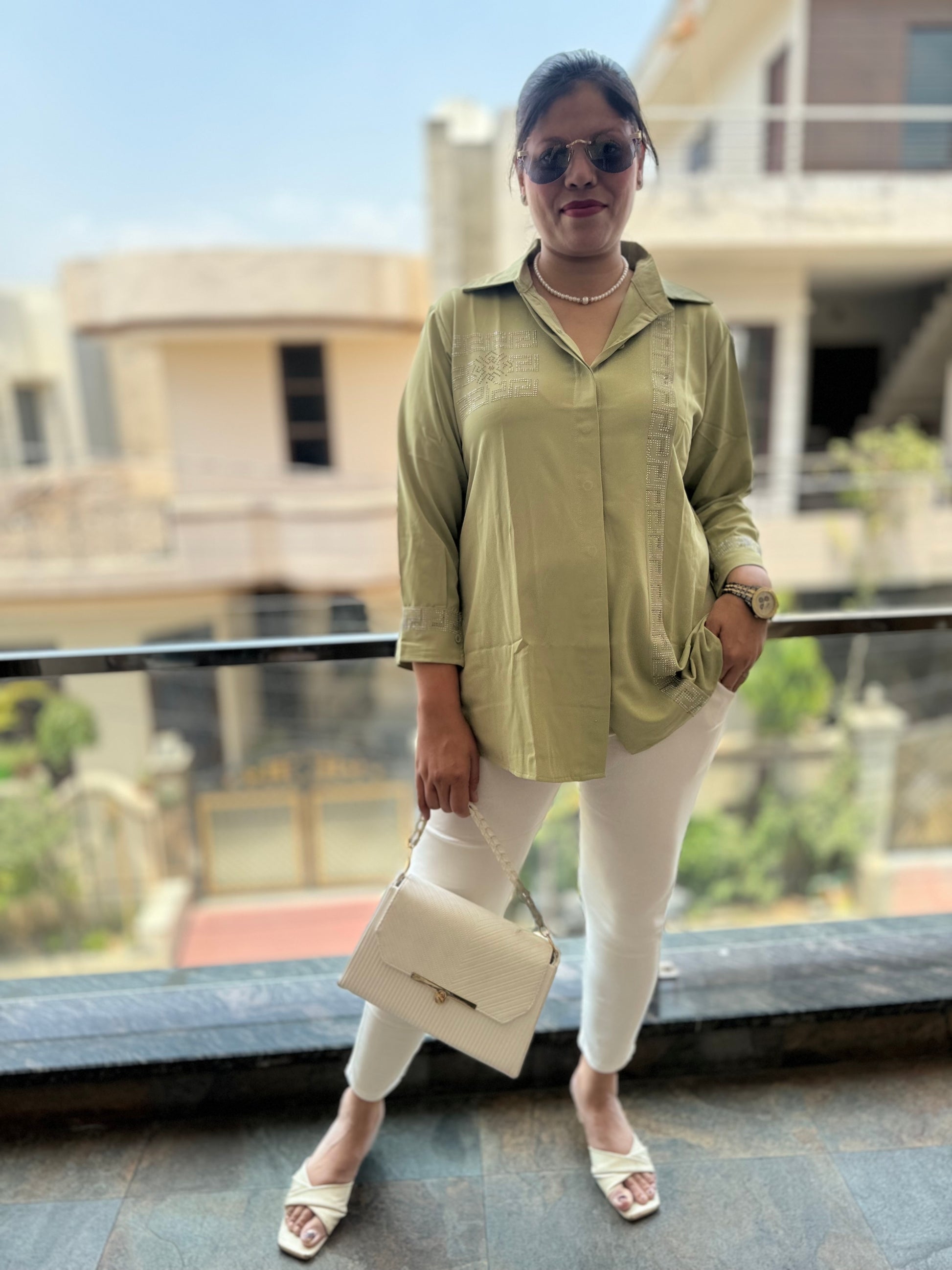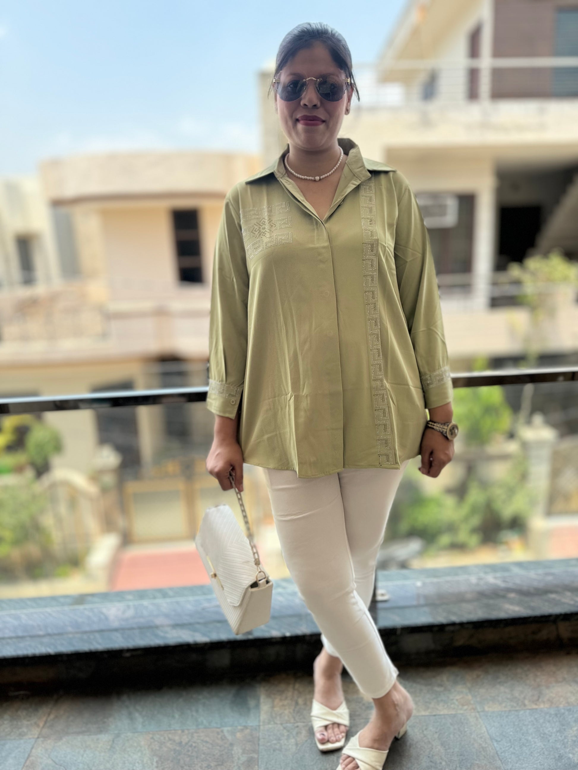 The IndiPehnawa Trendy Sirvoski Shirt is made of lightweight Crepe Cotton material, providing all-day comfort. It comes in M to 4XL (Free Size), offering a perfect fit for all body types. With a shirt length of 30 inches, this shirt is both stylish and versatile.