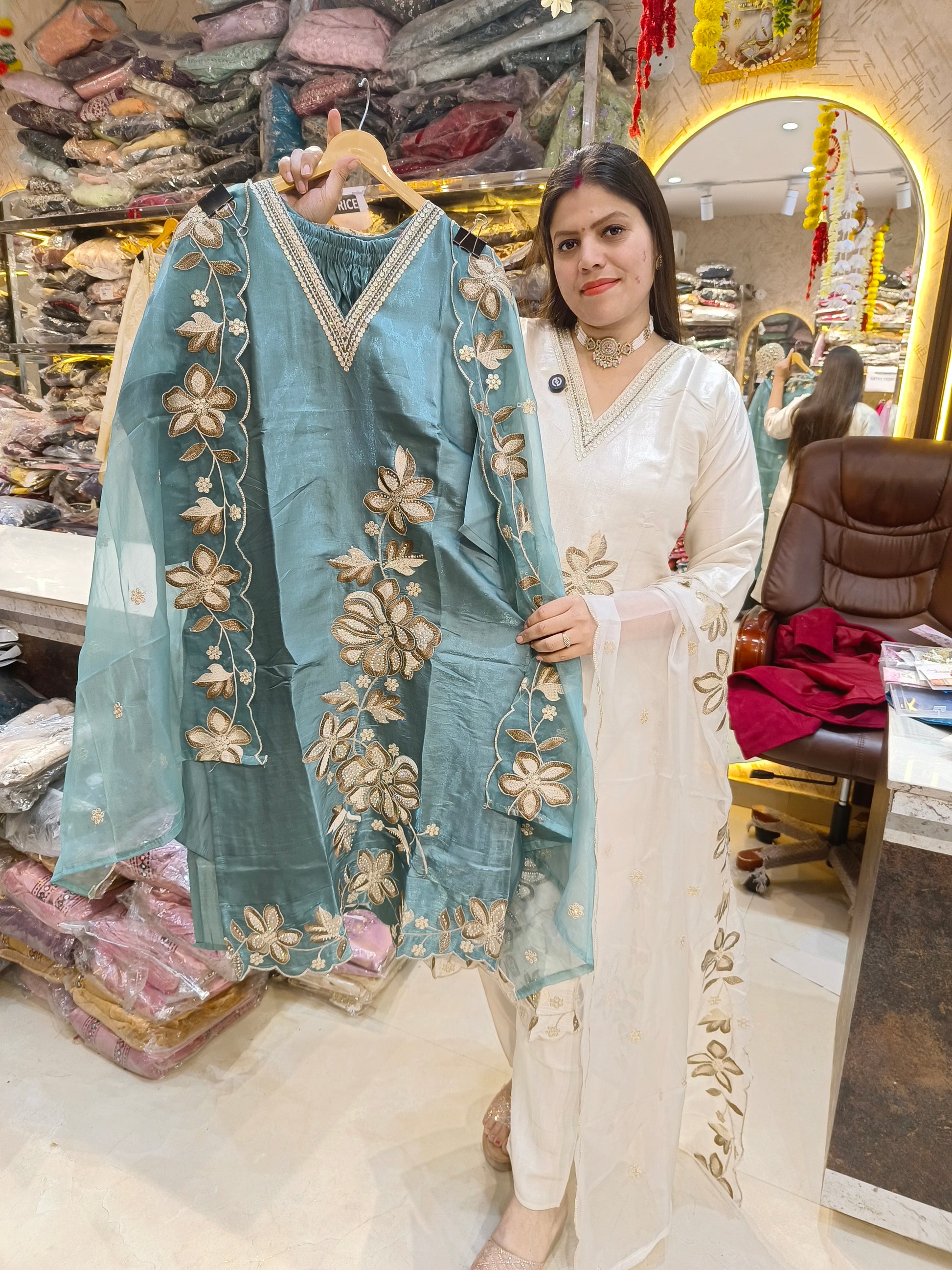 IVORY GOLD NECK DESIGN PREMIUM RASHIAN SILK SUIT