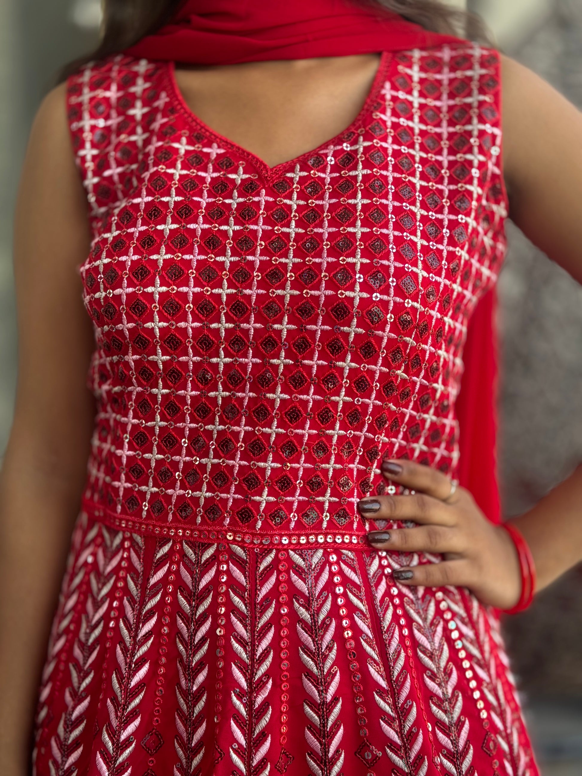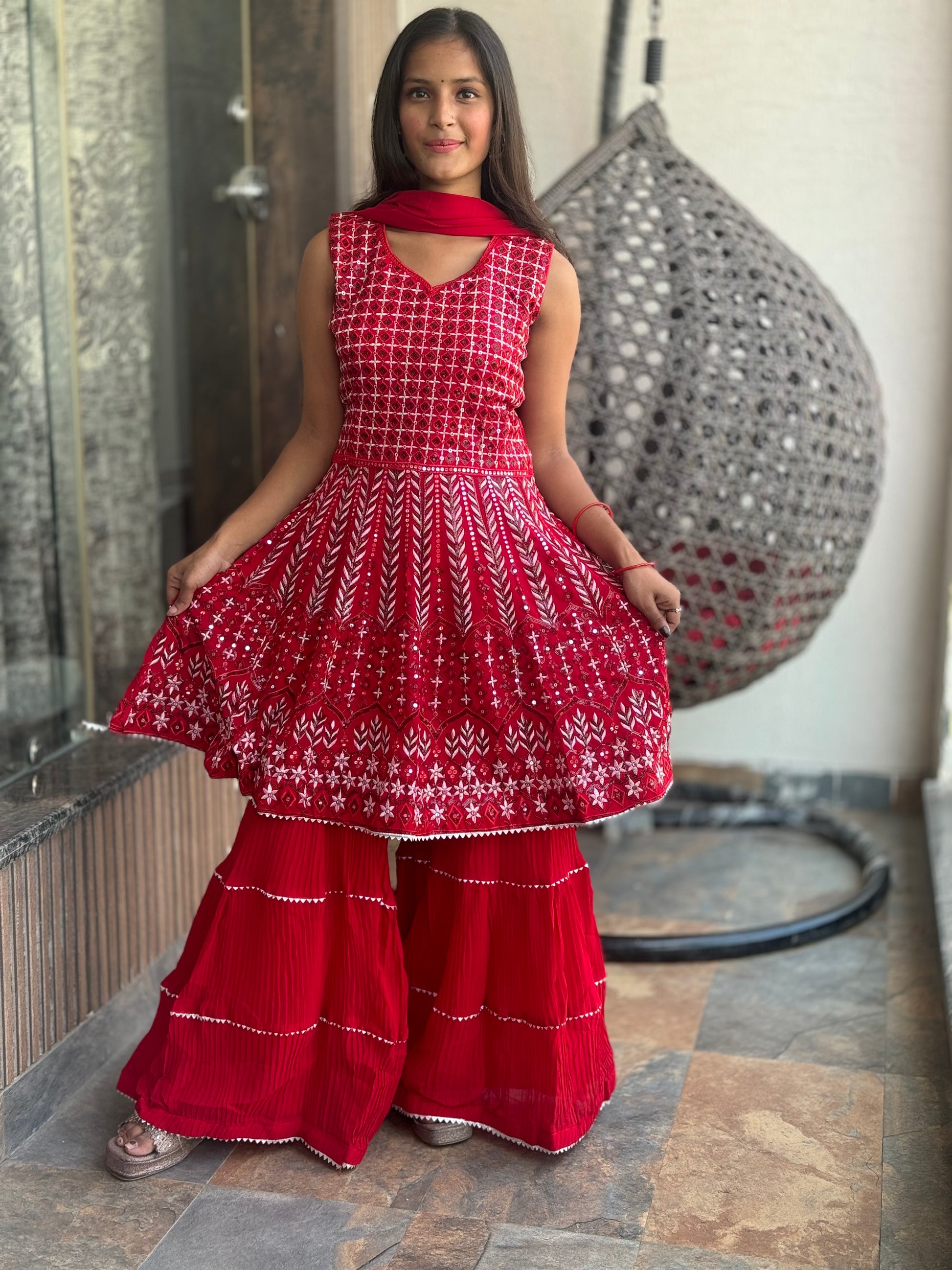 Celebrate Karwa Chauth in style with our Special Sharara! Available in sizes M to XXL (shirt may need to be altered), this outfit features multi-thread work on the shirt and a heavy georgette sharara with lining. The shirt length is 36 inches and the bottom length is 43 inches. Complete the look with a four-sided lace dupatta. Made from high quality georgette fabric.