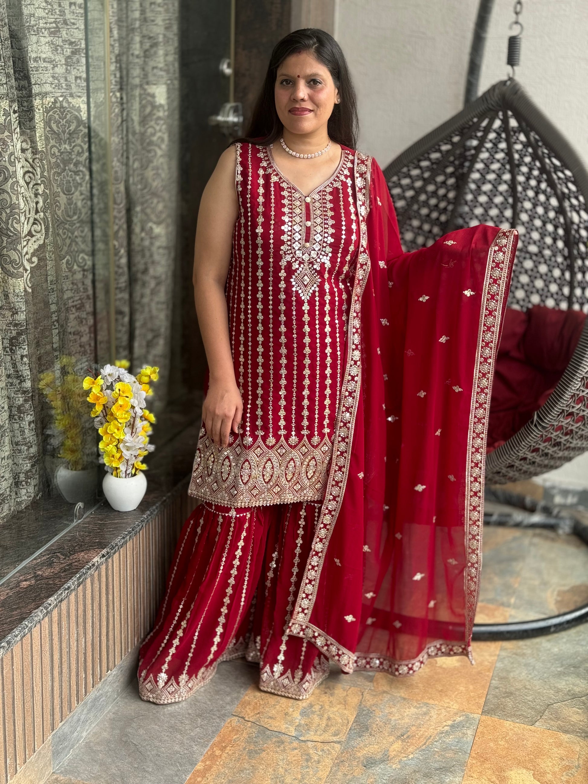 Get ready for Karwachauth in style with our premium range of Heavy Sharara Suits! Available in sizes M to XXXL, our georgette fabric features detailed heavy work on the shirt, sharara, and dupatta, with a full embroidery dupatta on all four sides. Shirt length is 38 inches and bottom length is 41 inches, and our heavy georgette dupatta completes the show-stopping look.