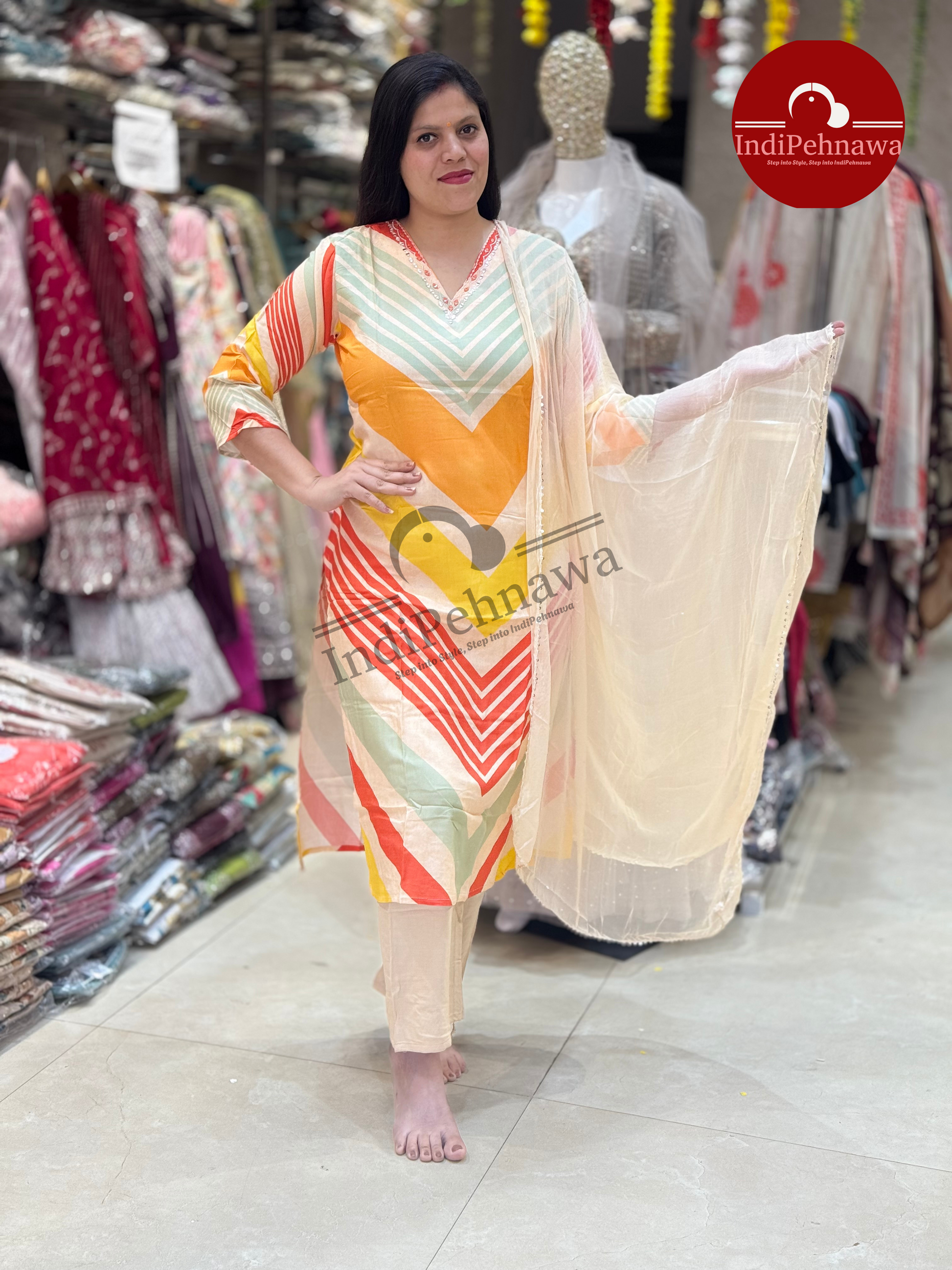 Elevate your wardrobe with this exquisite LEHRIYAA MULTI COLOUR SUIT featuring impeccable craftsmanship. The fully mirror-worked neck adds a touch of traditional elegance while the premium chiffon dupatta complements the vibrant multi-color design. Available in sizes M to XXL, this ensemble combines superior quality materials with expert tailoring for a perfect fit and sophisticated silhouette.