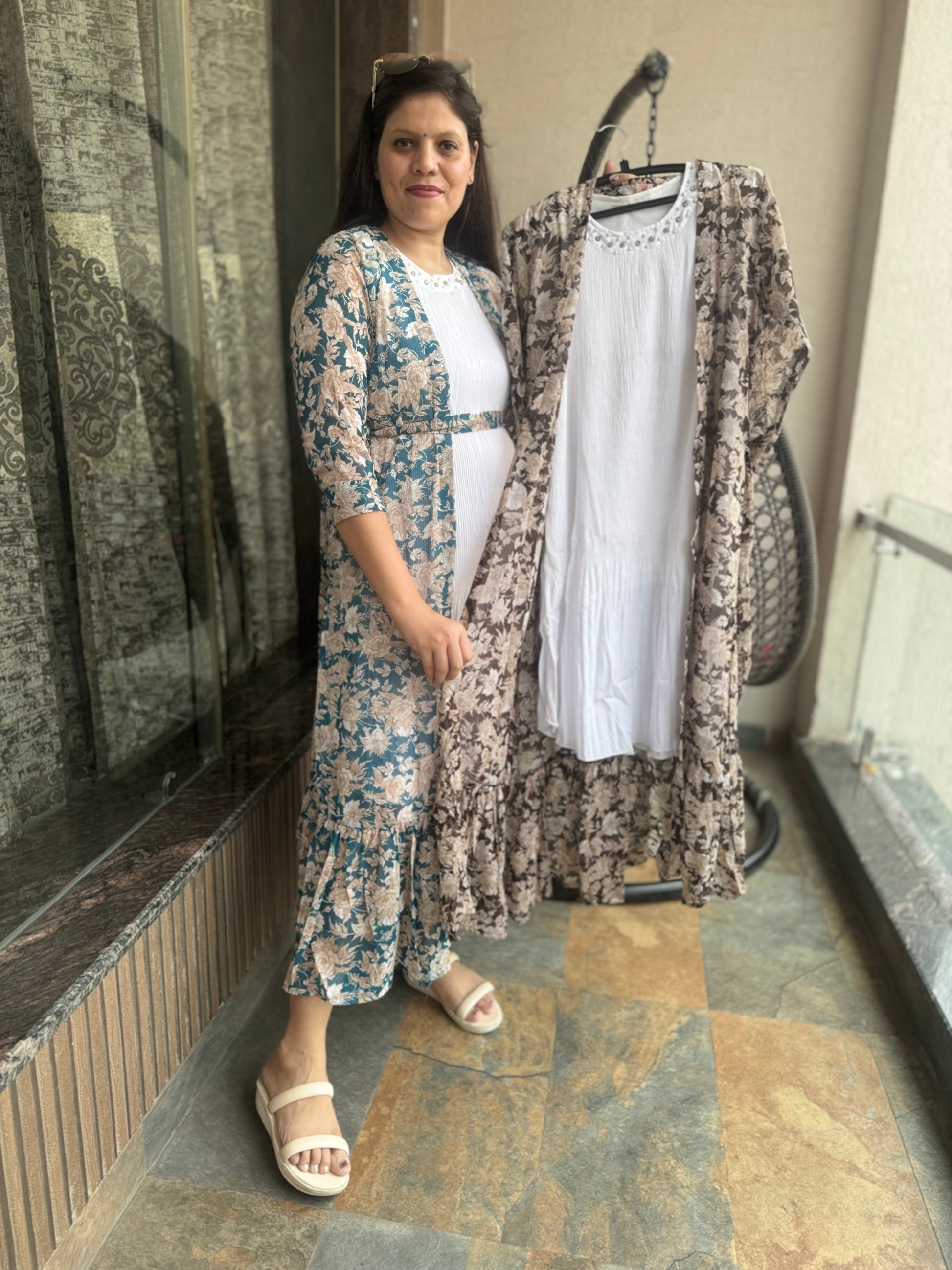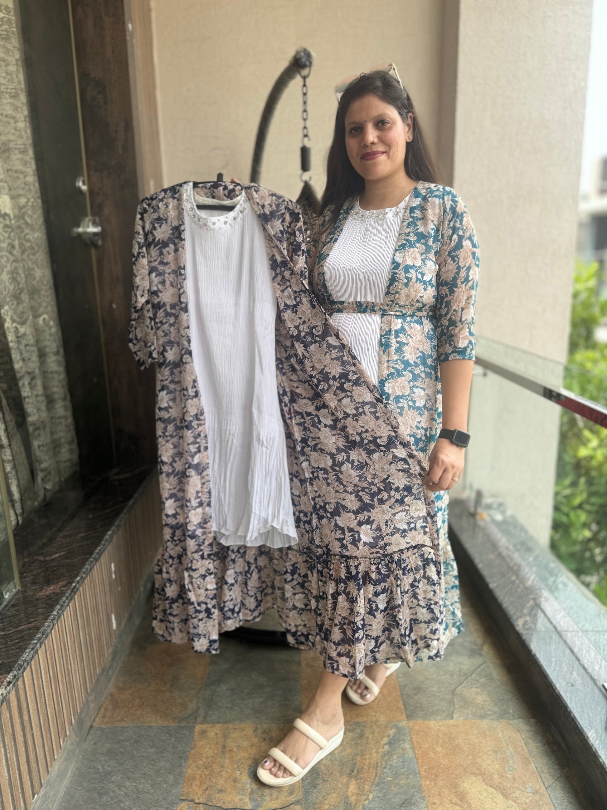 This versatile dress and shrug set, available in sizes S to XL(free size), is the perfect addition to any wardrobe. The dress length is 40 inches, while the shrug length is 50 inches, providing a flattering fit for all body types. Elevate your style with Georget fabric and effortless comfort.