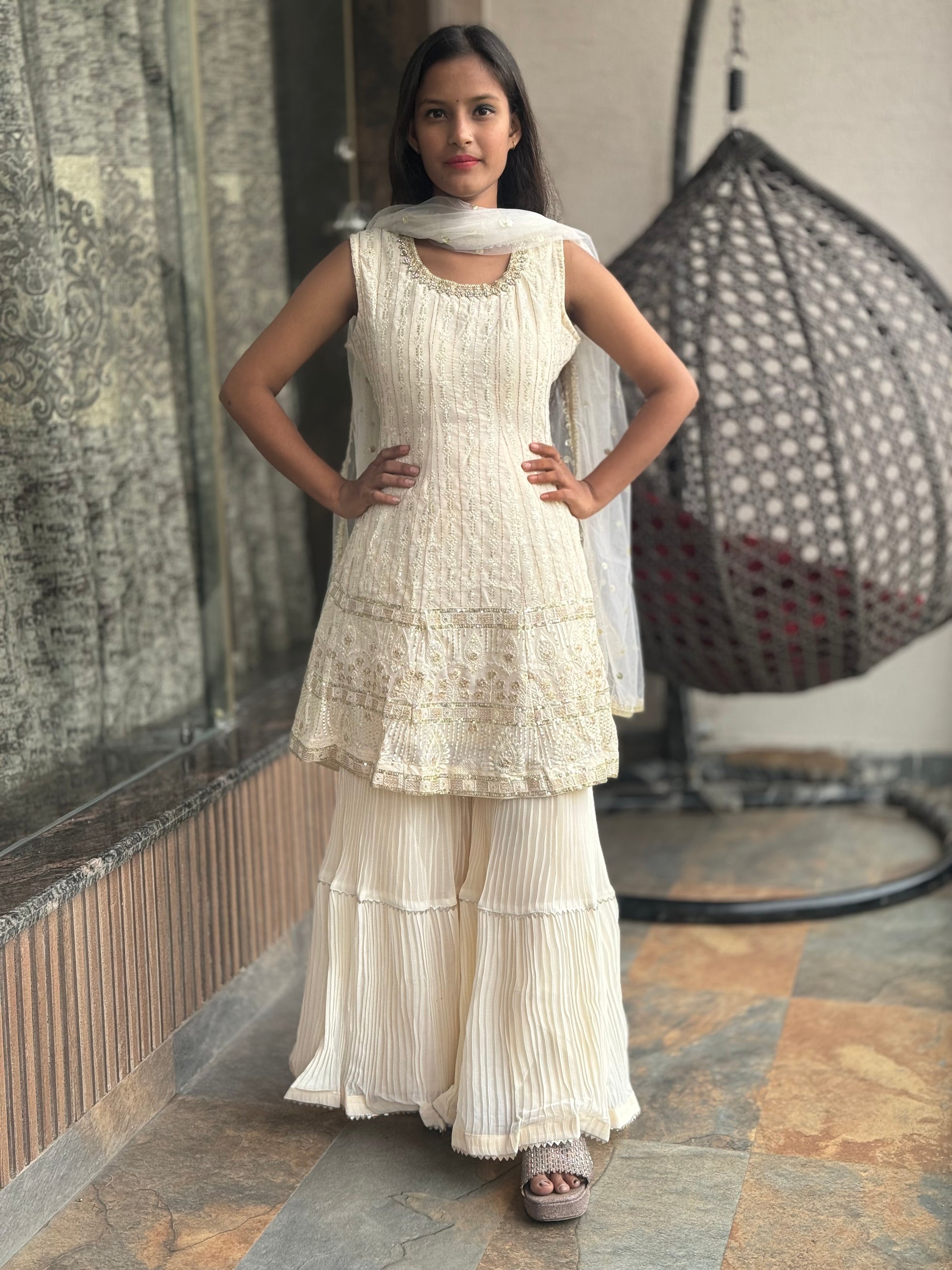 Get ready to make a statement with our LUKHNAVI HEAVY PEPLUM SHARARA! Available in sizes M to XXL (just need to alter the shirt), the shirt measures 33 inches and the bottom is 42 inches in length. Featuring full tilla work on either the front or back of the shirt, this heavy peplum sharara is sure to turn heads and make you stand out in the crowd.