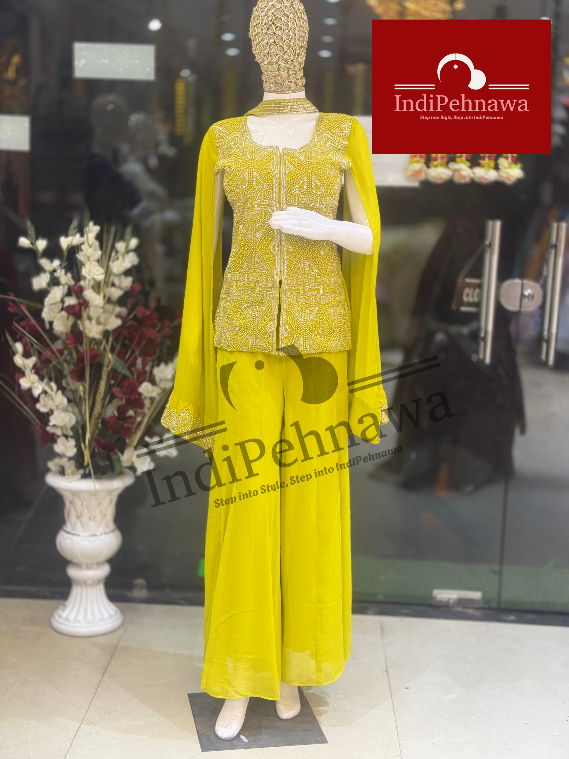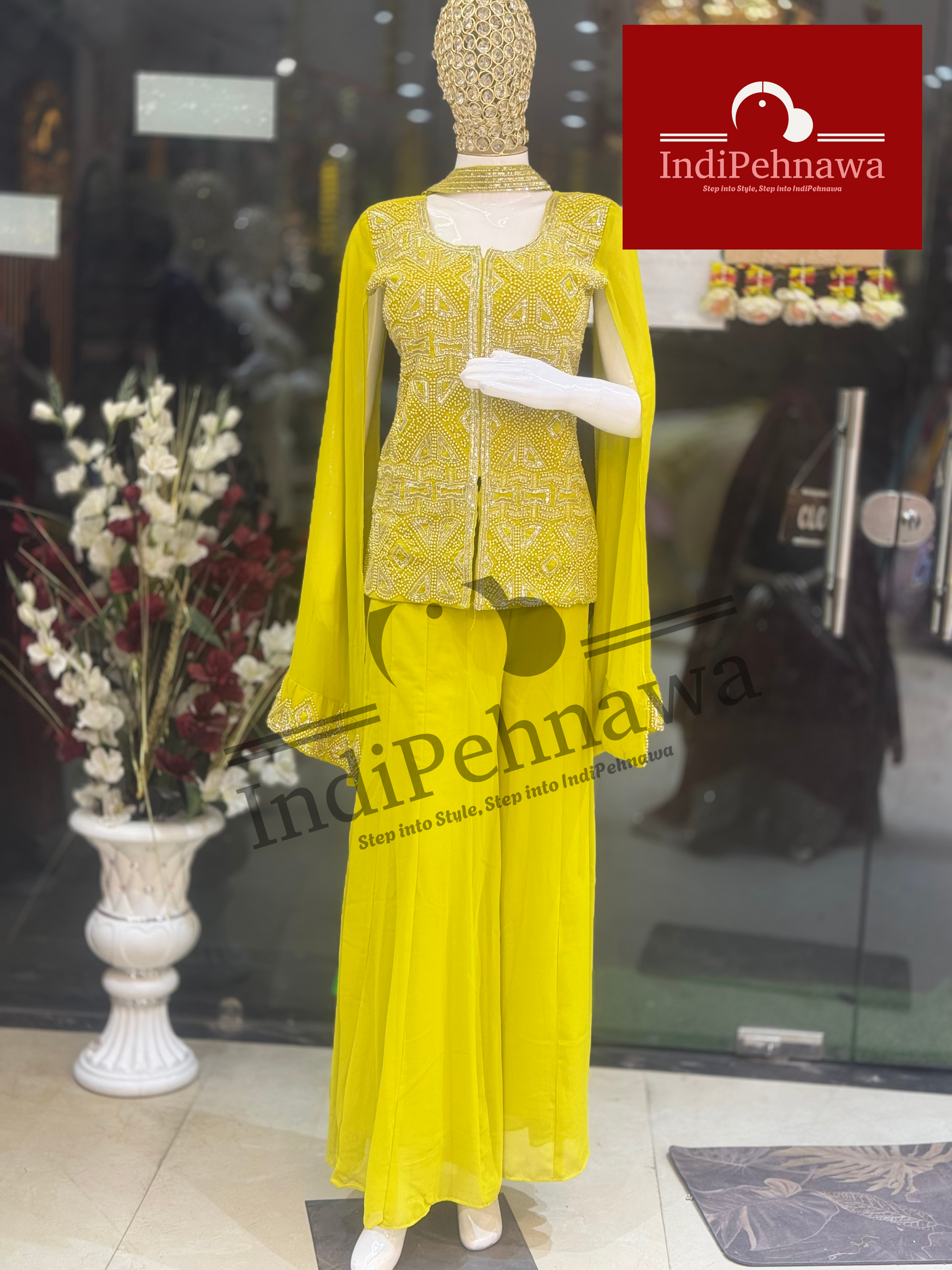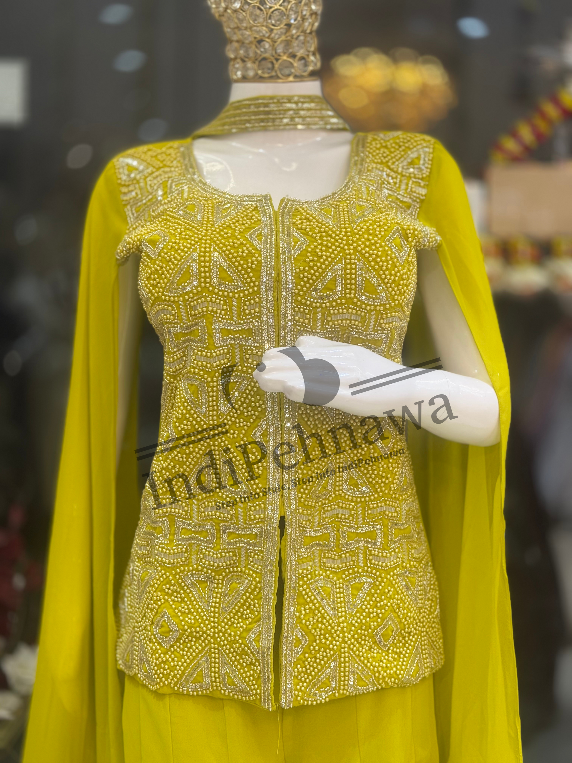 Expertly handcrafted from luxurious georgette fabric, this stunning set is adorned with full pearl and handiwork on both the shirt and duppata. The shirt measures 25 inches in length, while the bottom length is 42 inches. Perfect for sizes M to XL, this set can be easily altered for a perfect fit. Elevate your style with the elegant neck piece style duppata.