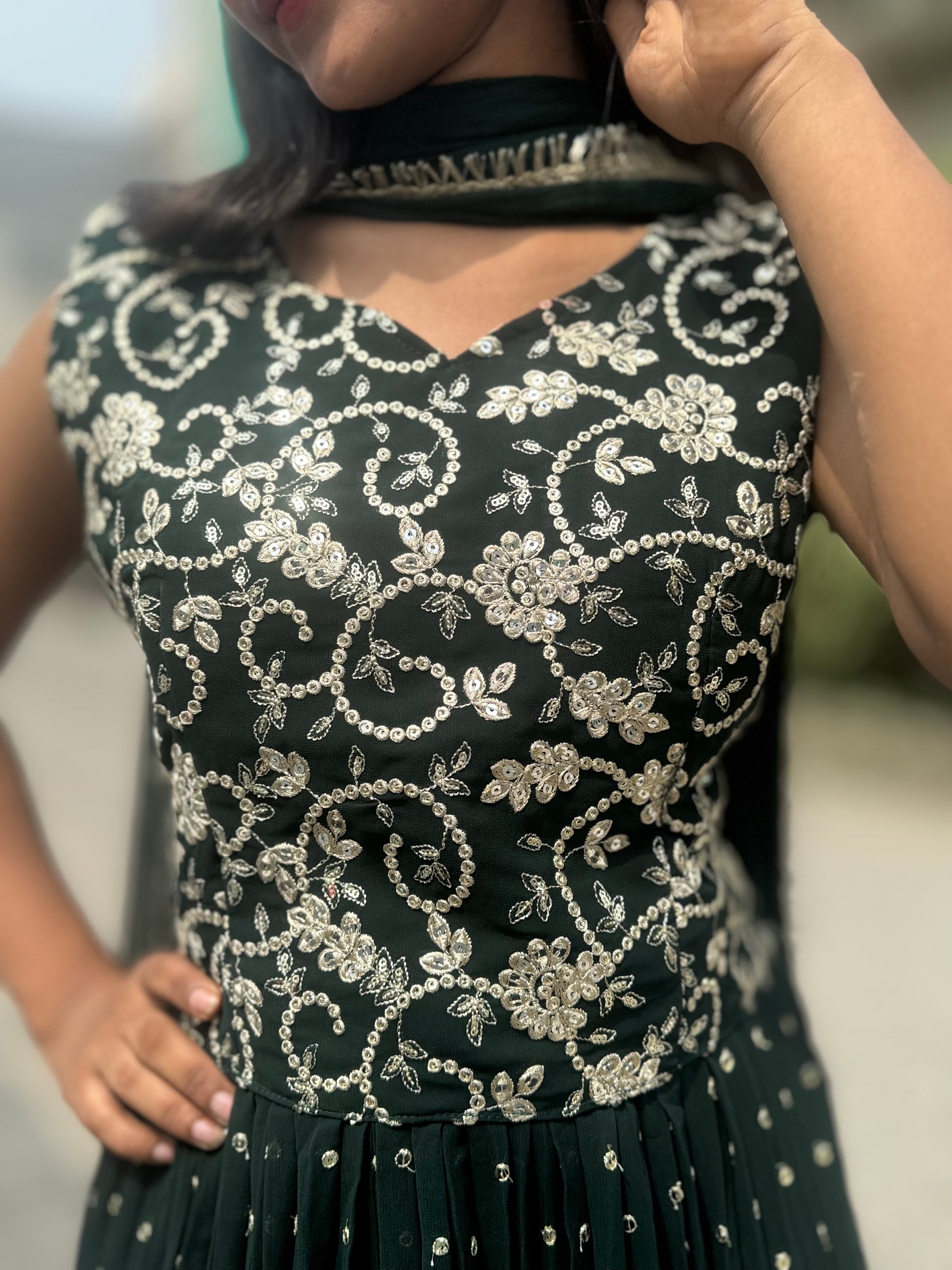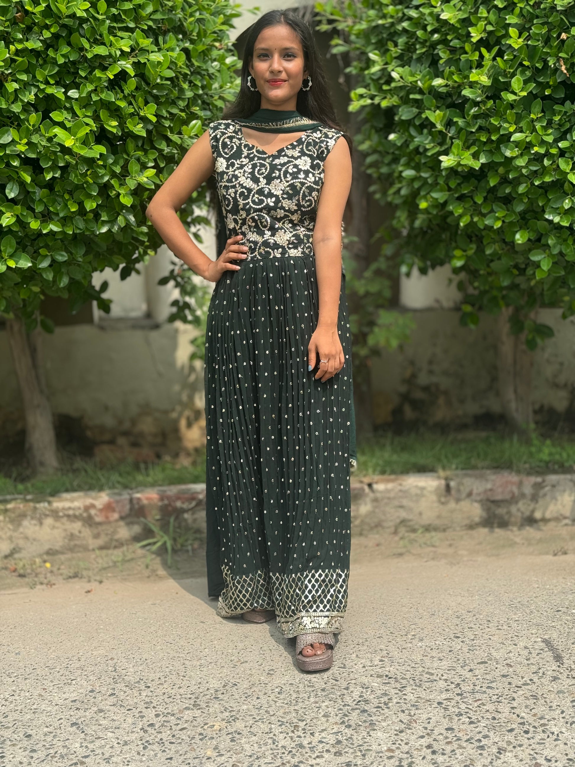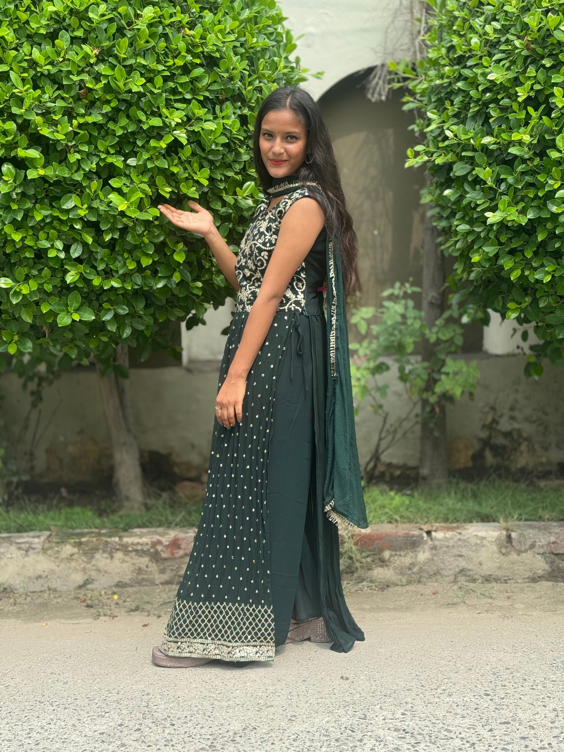Get ready to turn heads with our MEHNDI SPECIAL HEAVY FRONT WORK NAIRA CUT outfit. The gorgeous georgette fabric and full golden thread work on the shirt exude elegance and luxury. The heavy divider plazo with attached lining adds volume and comfort, and the shirt length of 42 inches complements the bottom length of 56 inches. Available in sizes S to XL, it may require minimal alteration to the choli. Order now and make a statement at any event.