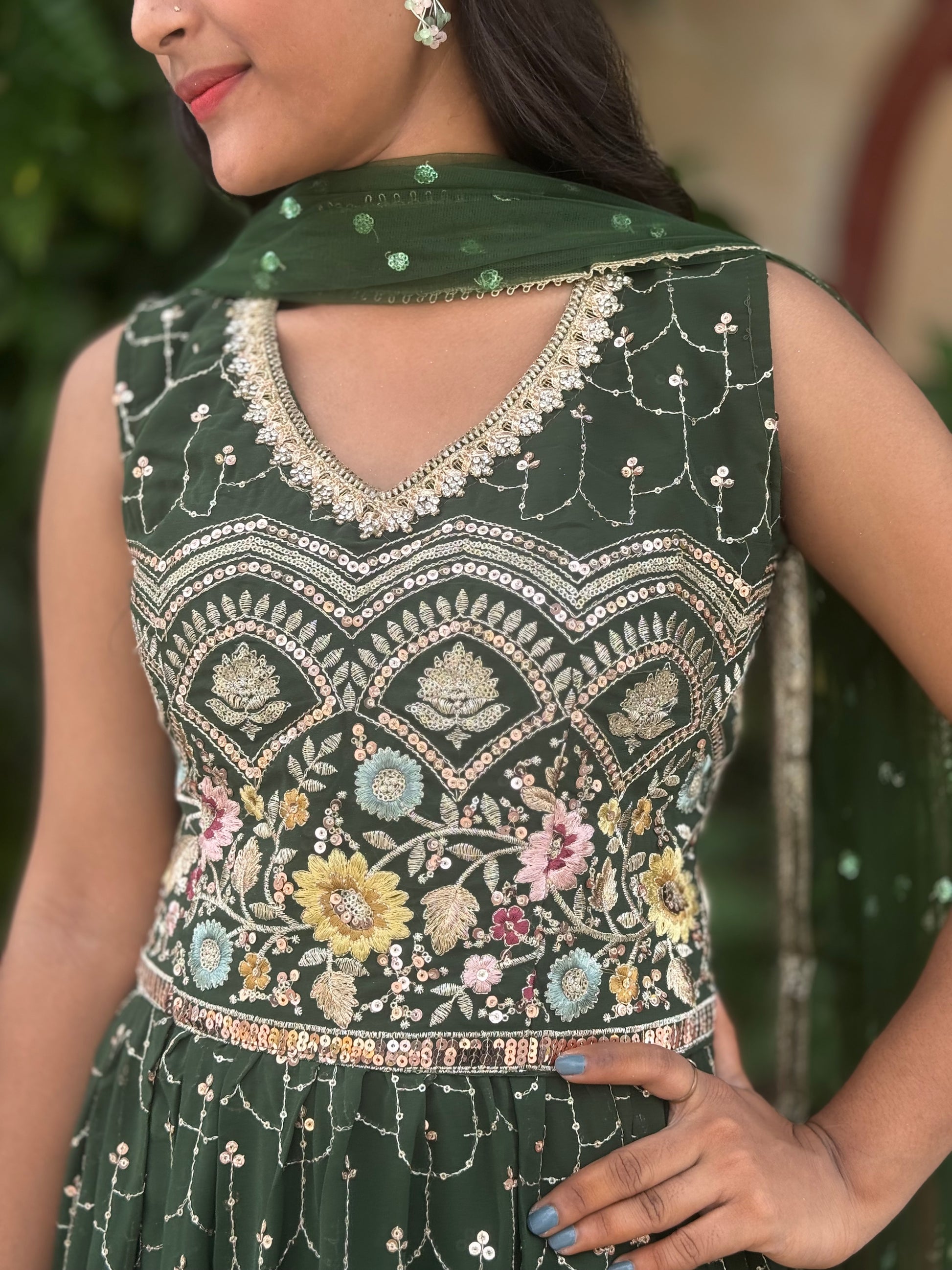 Meet our stunning MULTY FLOWER WORK NAIRA CUT shirt in sizes S to XL. Made with lightweight georgette fabric, this top is perfect for any occasion. The full zircon work on the neck and multy colour thread work on the naira cut bring a touch of elegance to this piece. Alterations may be necessary for the perfect fit.