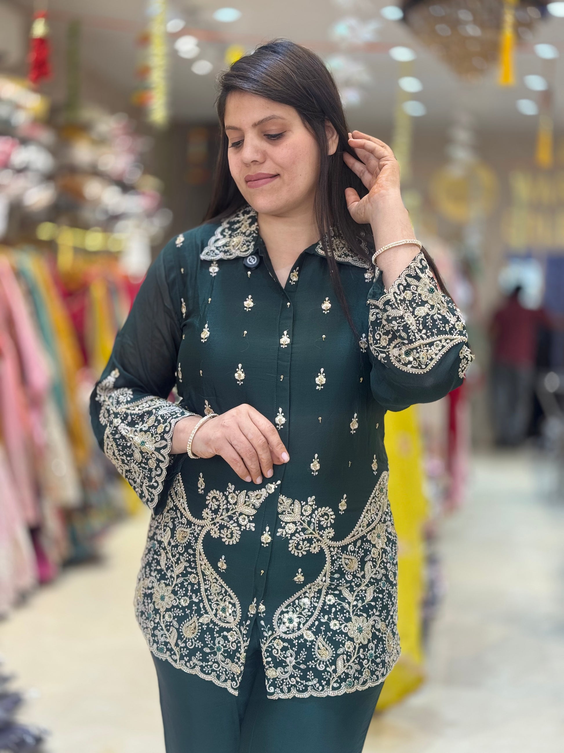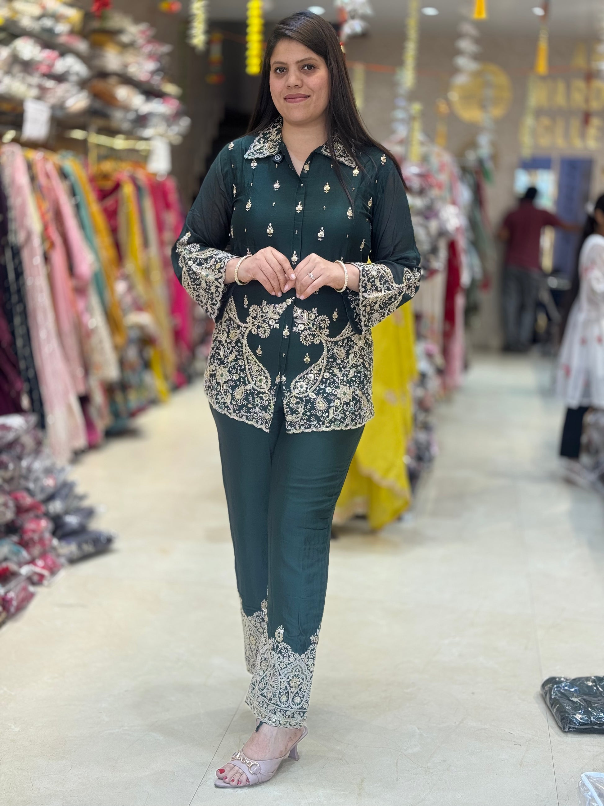 OLIVE GREEN PURE CHINON SILK FULL THREAD AND PEARL WORK CORDSET