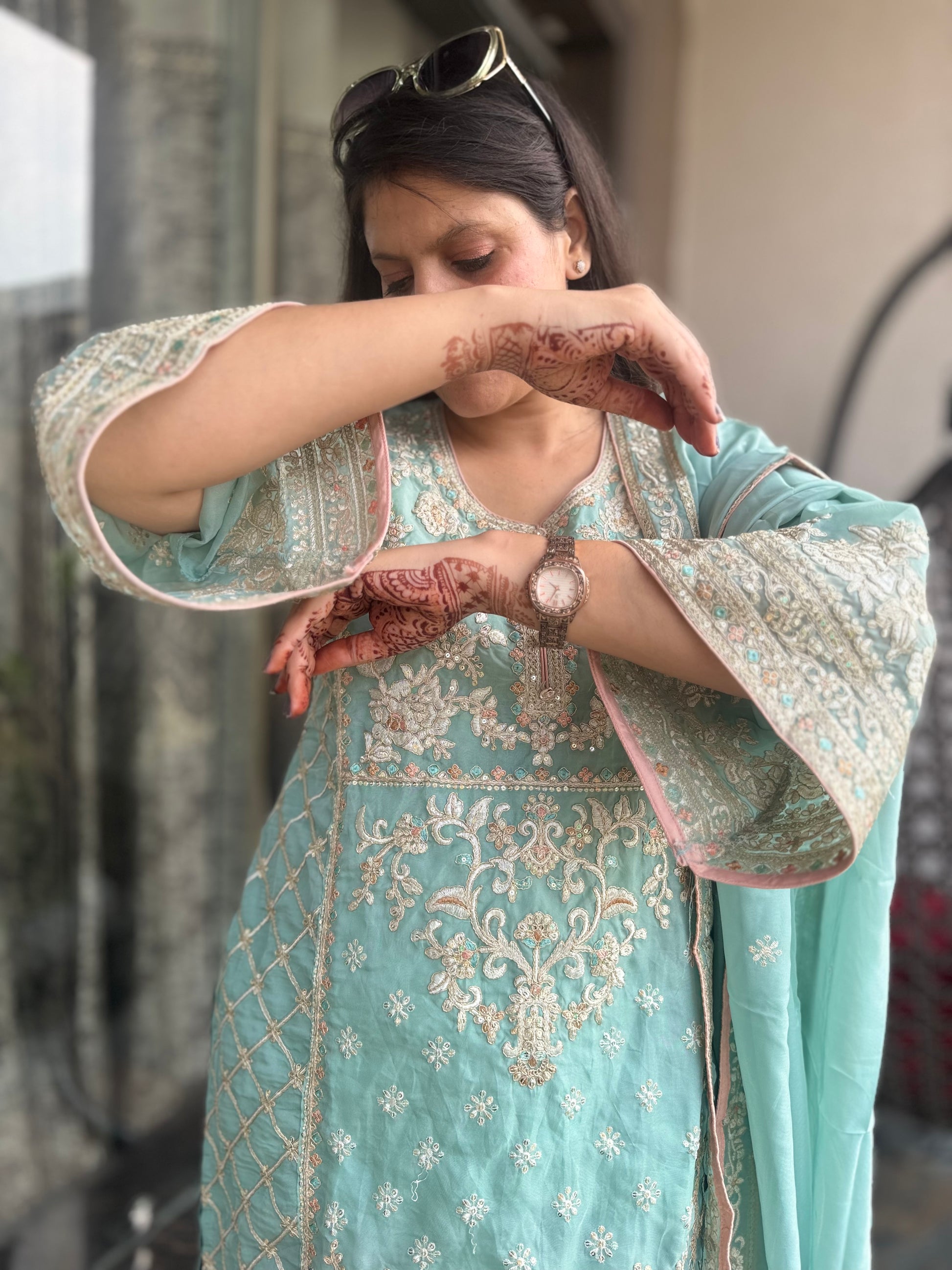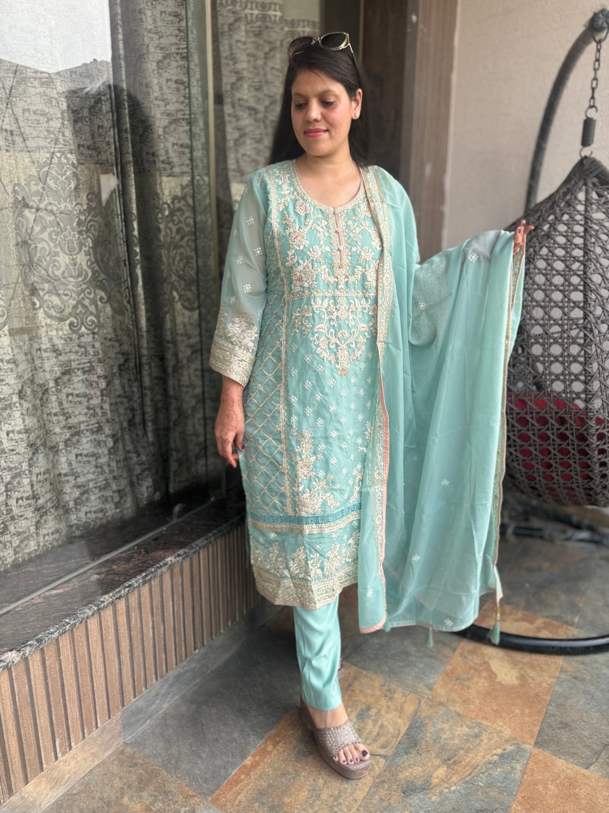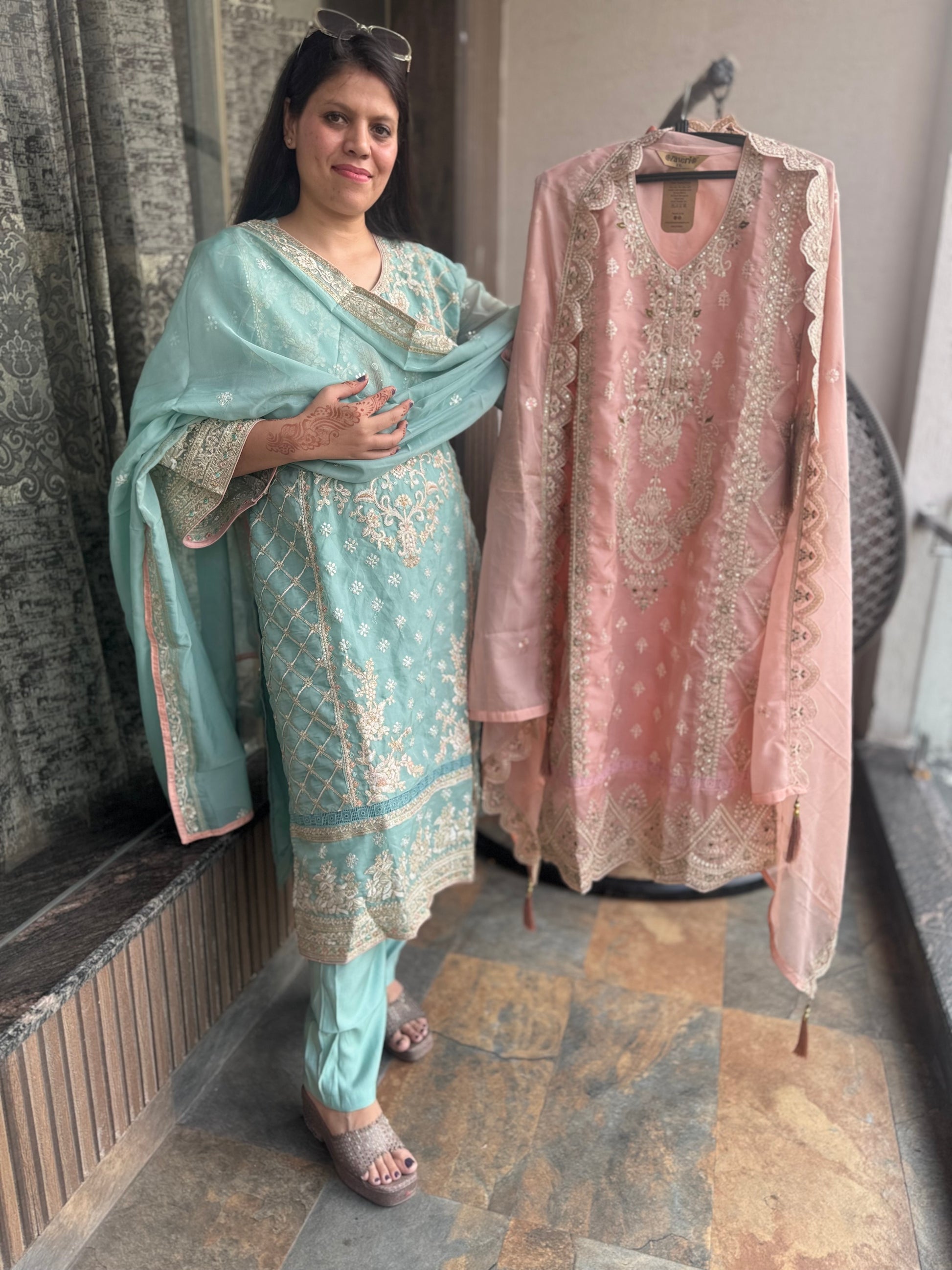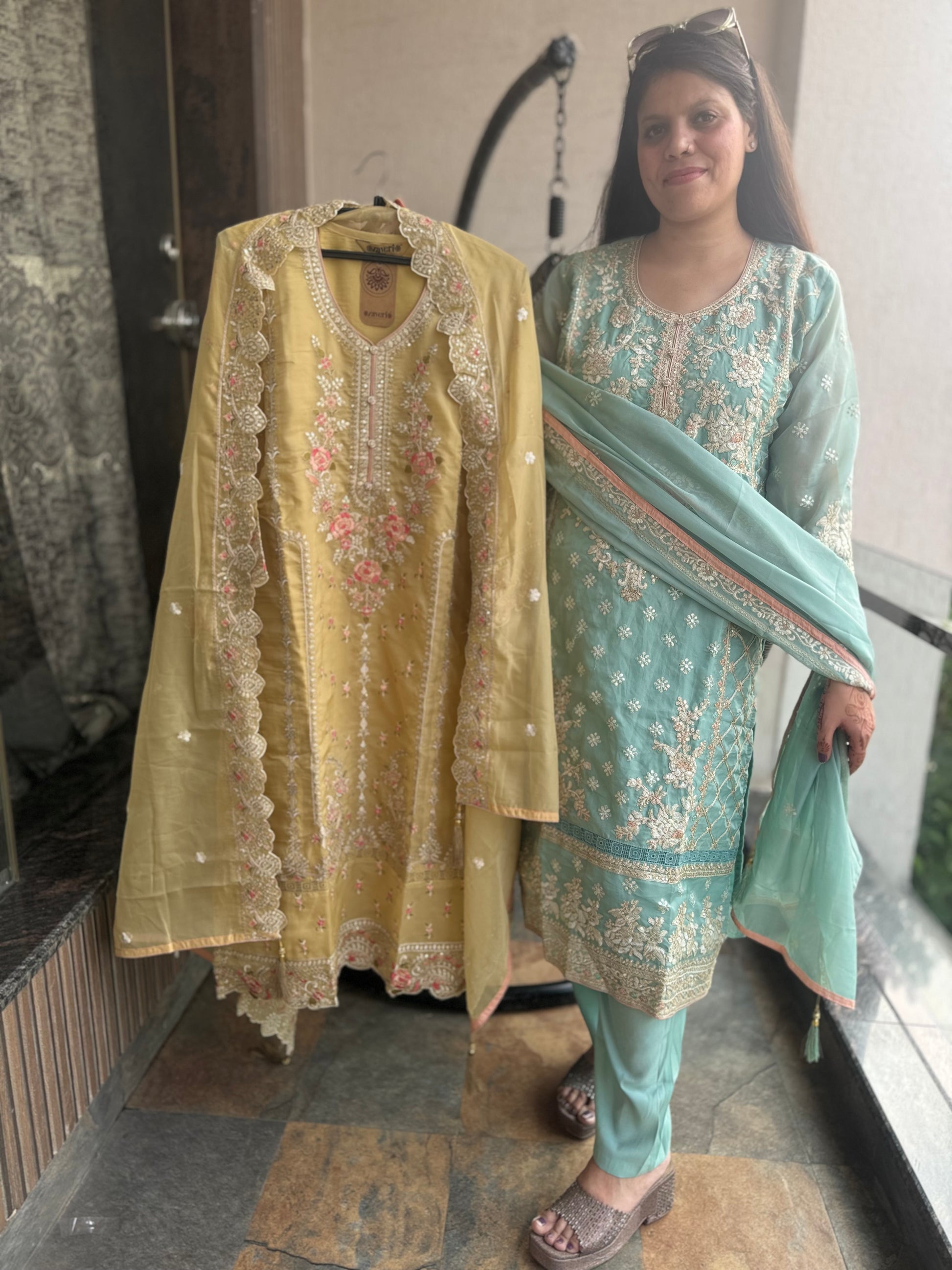Elevate your wardrobe with our Organza Pakistani Suit (Style No 1115). This stunning piece in M to 3XL sizes features an Organza fabric with lining for a luxurious and comfortable feel. The shirt length is 45 inches and the bottom length is 40 inches, making it a flattering fit for any body type. Stand out in style and elegance with this beautiful suit.