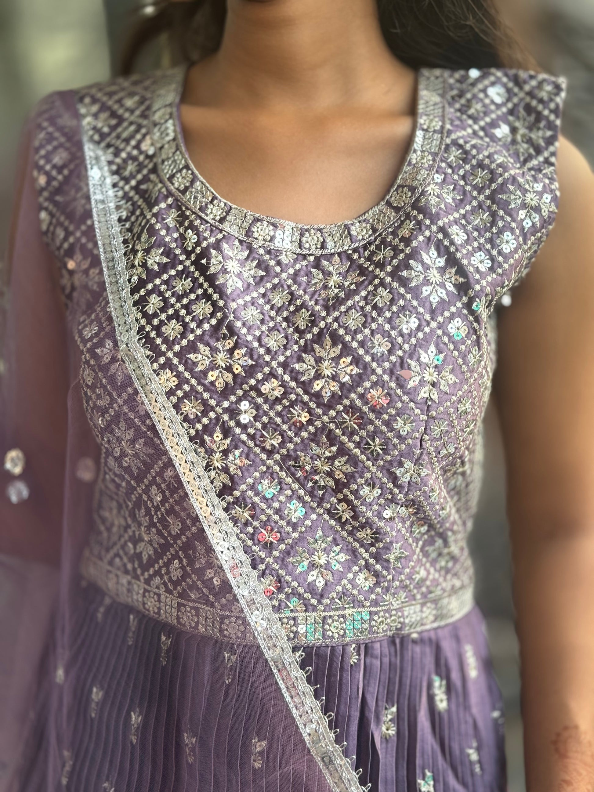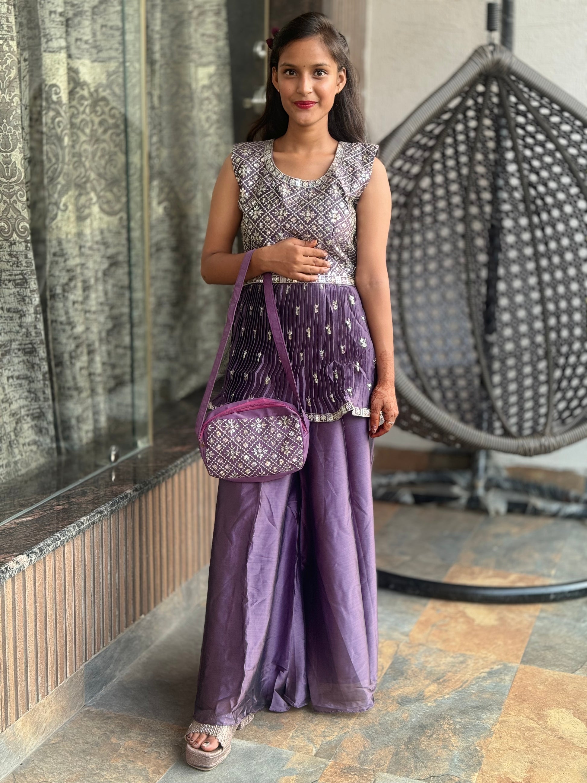 Add elegance and style to your wardrobe with the Peplum Divider with Purse! Made from luxurious chinon fabric, this set offers a comfortable fit in sizes S to XL. Enjoy the ultimate style and convenience with a matching purse and embroidered net dupatta. Get the complete look with top length of 28 and bottom length of 40.