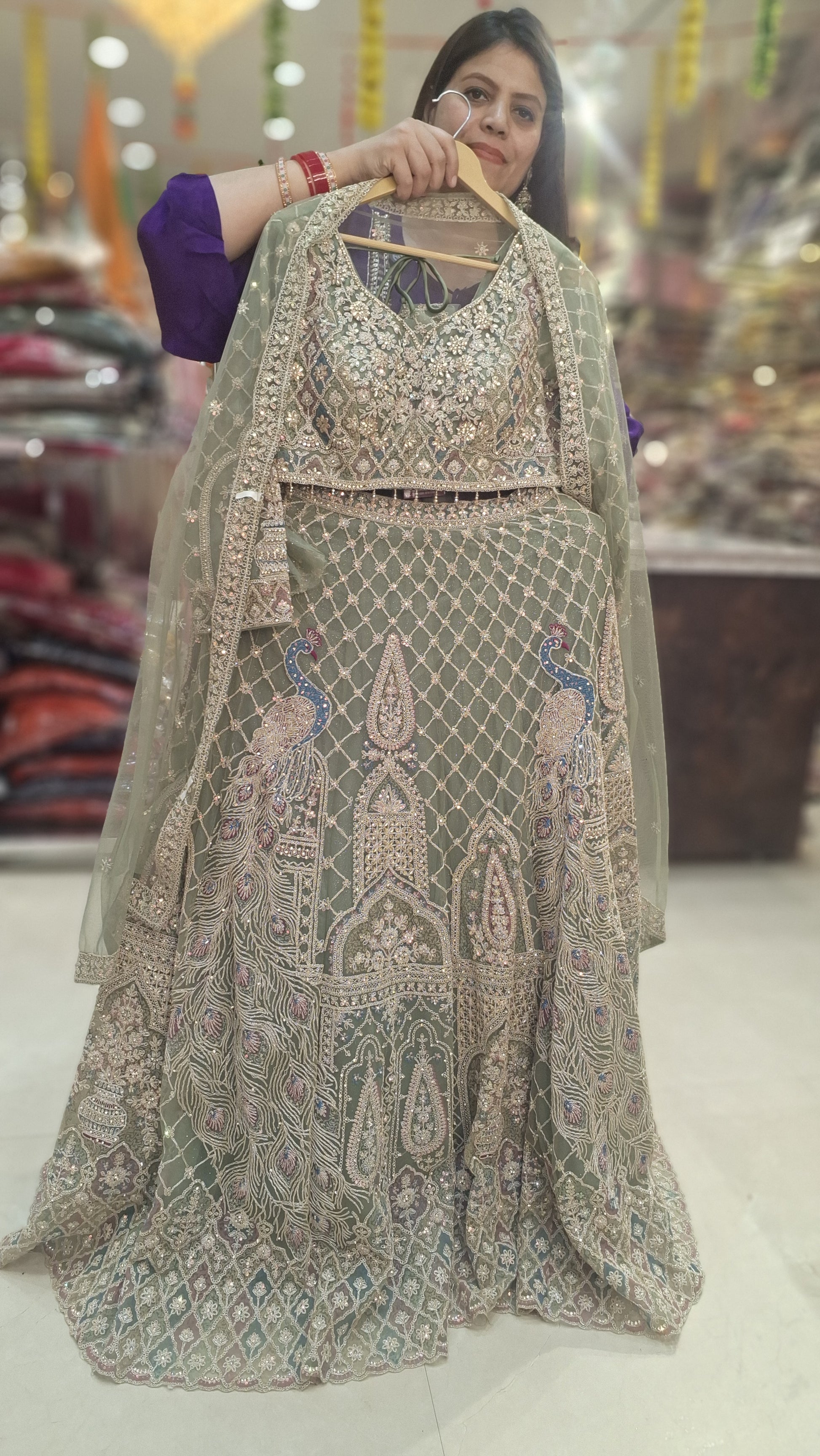 PISTA GREEN NITED THREAD AND MIRROR WORK HEAVY LEHNGA