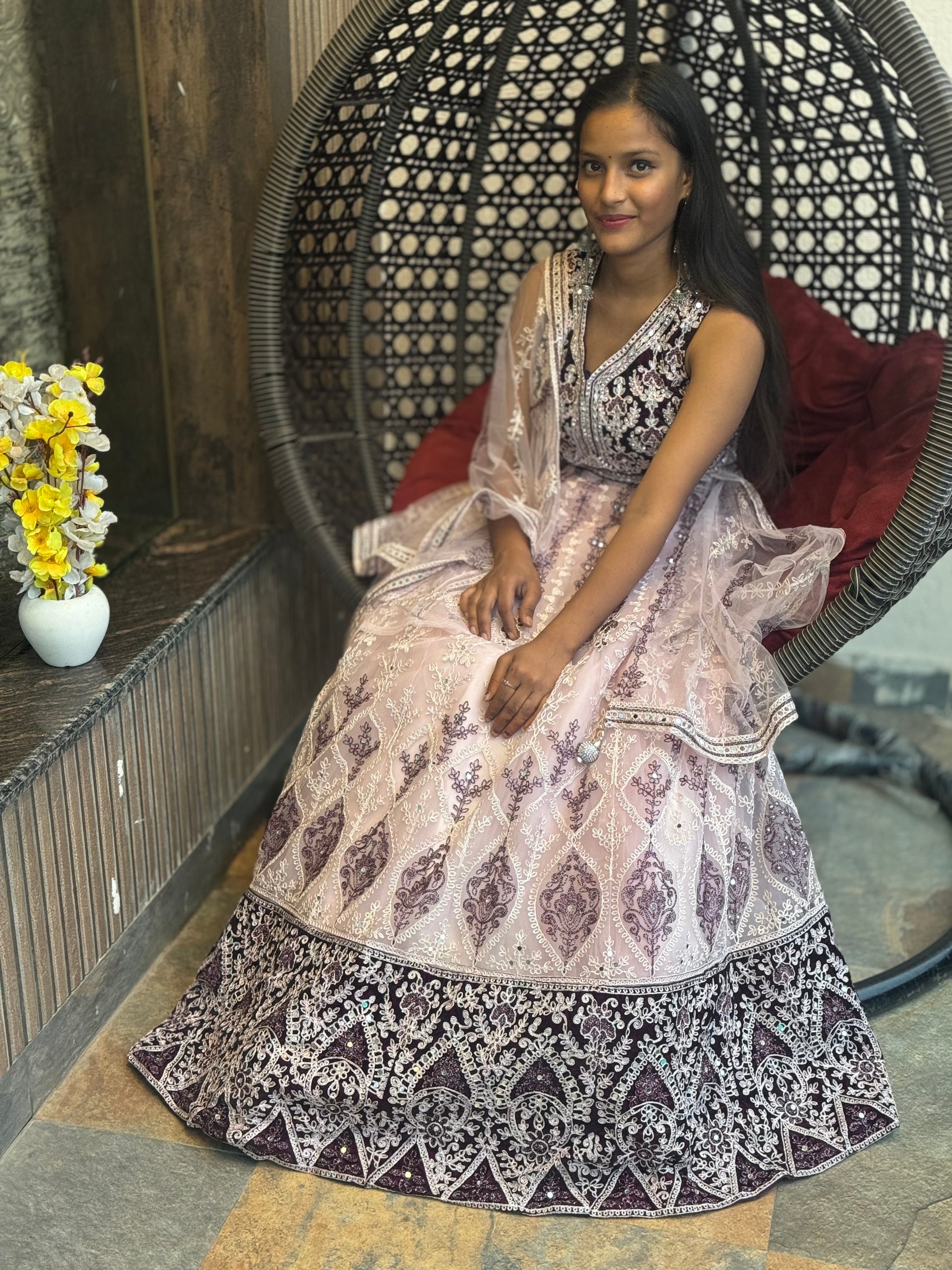 Upgrade your wardrobe with our PREMIUM DOUBLE SHADE MIRROR LEHNGA! Perfect for sizes M to XL, this stunning outfit features a 15-inch top length and 46-inch bottom length. Made from high-quality net fabric, the lehnga boasts a beautiful double tone in wine and pink, adorned with heavy embroidery and mirror work. Complete with a fully can-can and a heavily embroidered dupatta, this lehnga will make you stand out at any event.