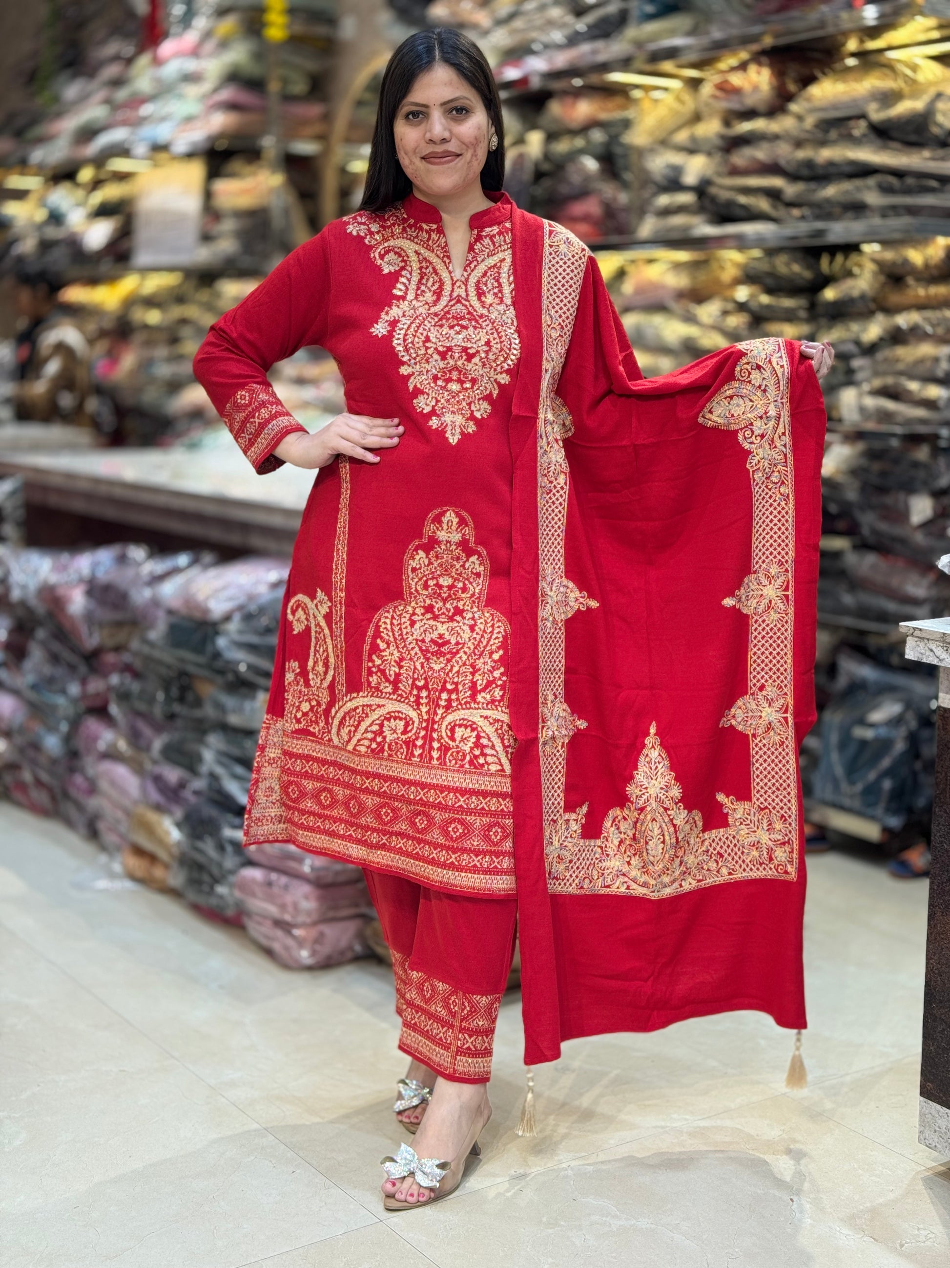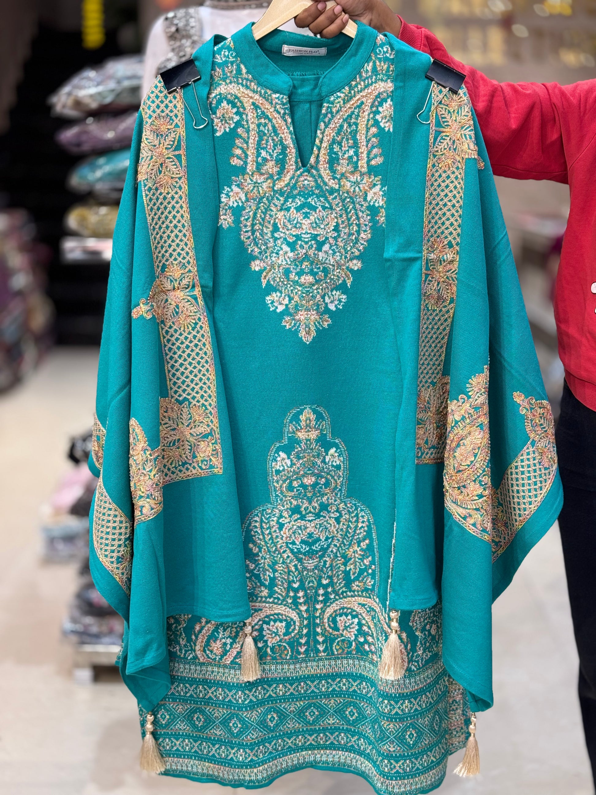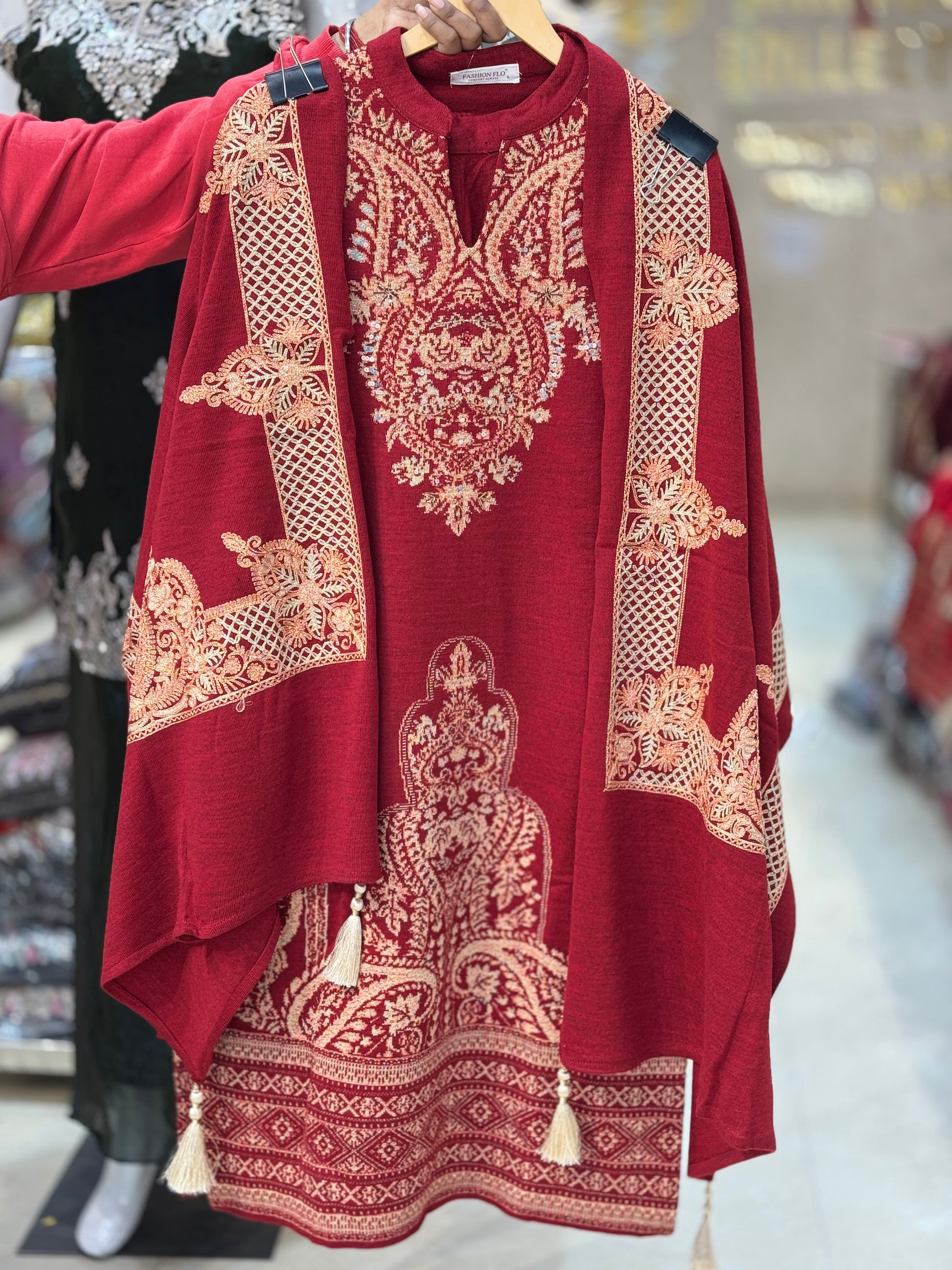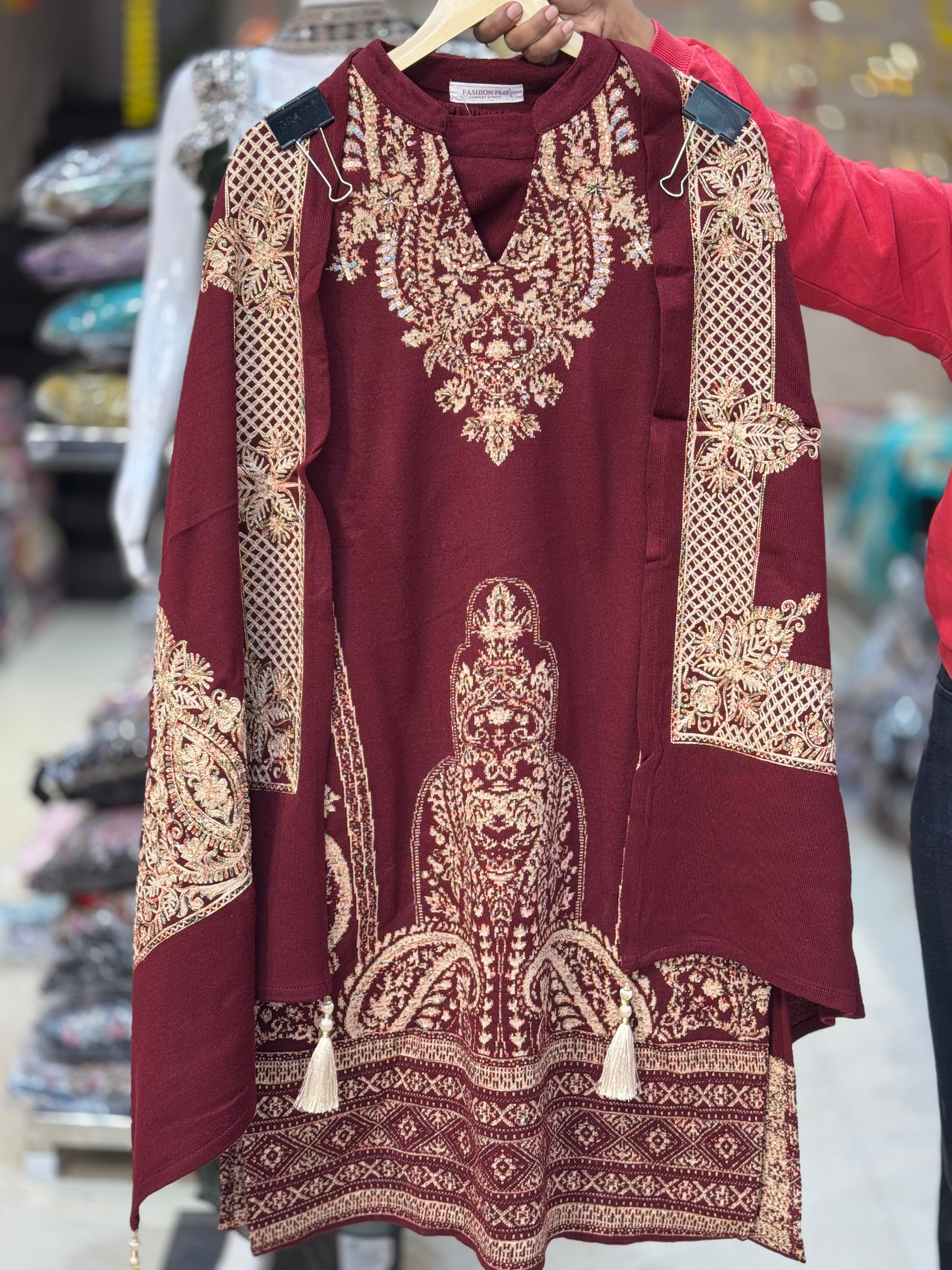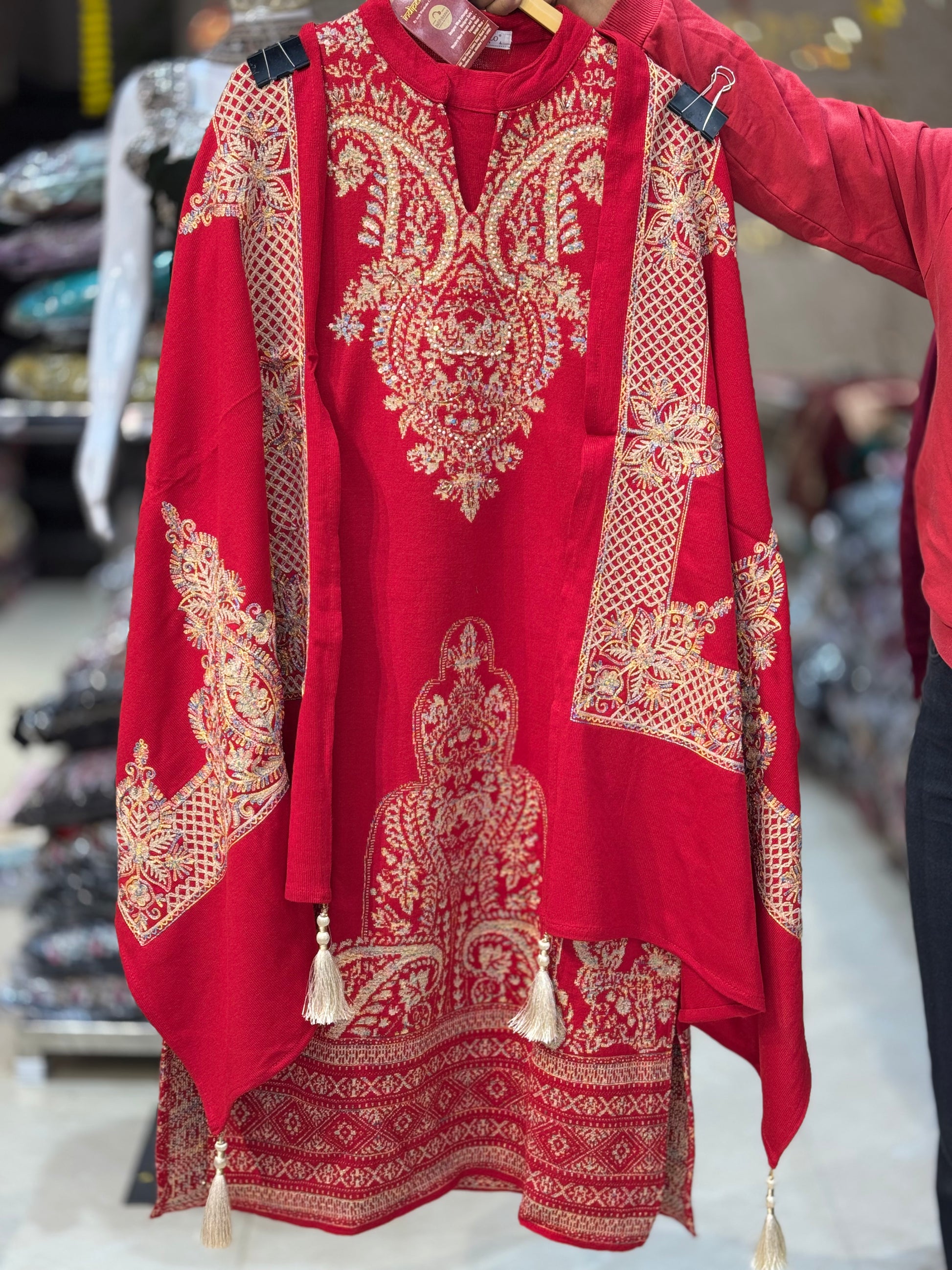 Elevate your festive wardrobe with this premium party-wear woolen ensemble, meticulously crafted for discerning tastes. Featuring exquisite hand-embroidered detailing at the neckline, this piece showcases authentic Kashmiri craftsmanship throughout. The accompanying heavy embroidered shawl displays intricate full Kashmiri work, complementing the intricately adorned shirt. Constructed from dual-fleece premium wool, this garment offers superior warmth and luxurious comfort. Available in sizes M to XXL, it seamlessly blends traditional artistry with refined elegance, making it an ideal choice for special occasions and celebrations.