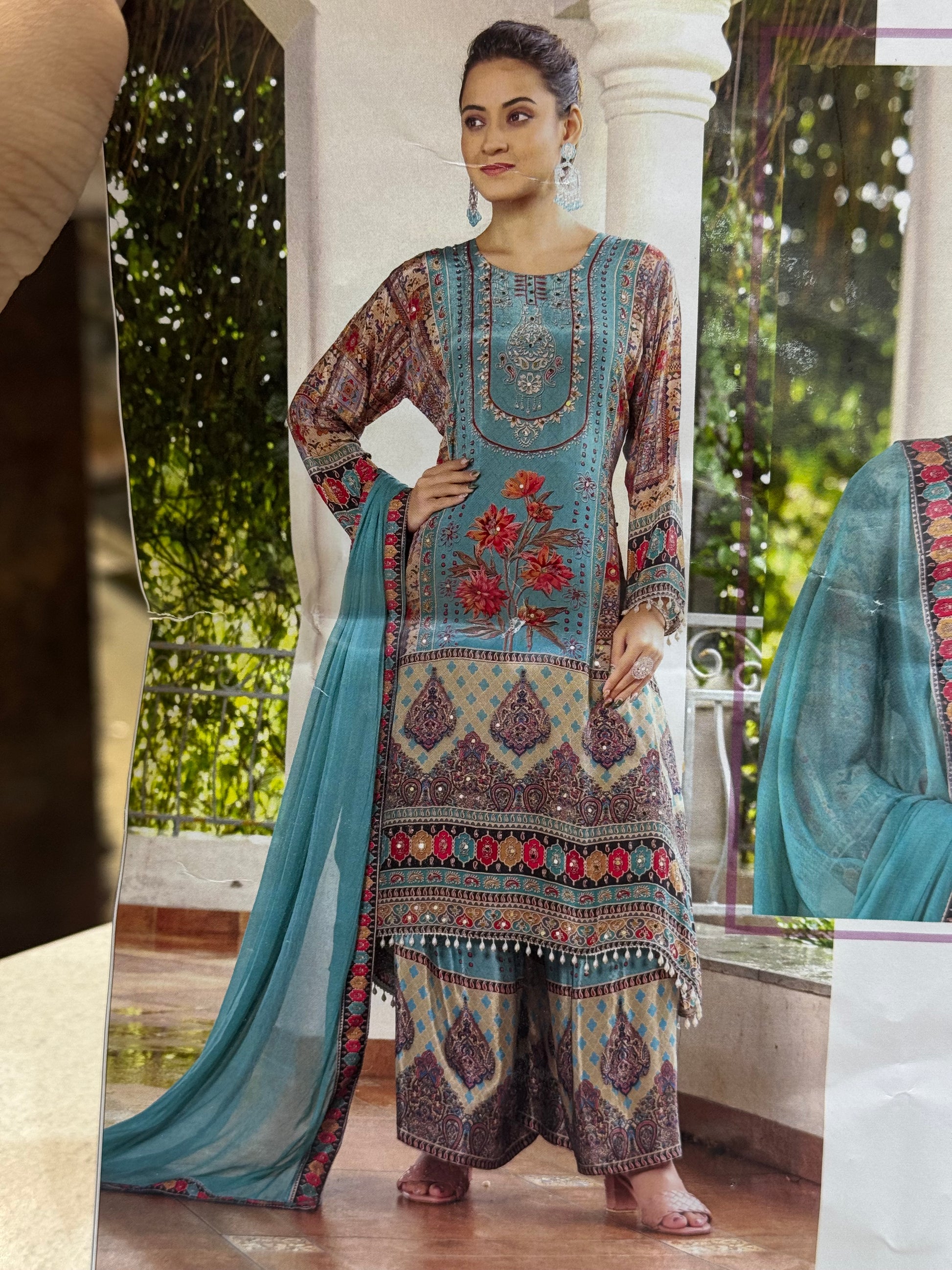 PREMIUM PURE CRAPE MIRROR WORK SKY SHADE SUIT