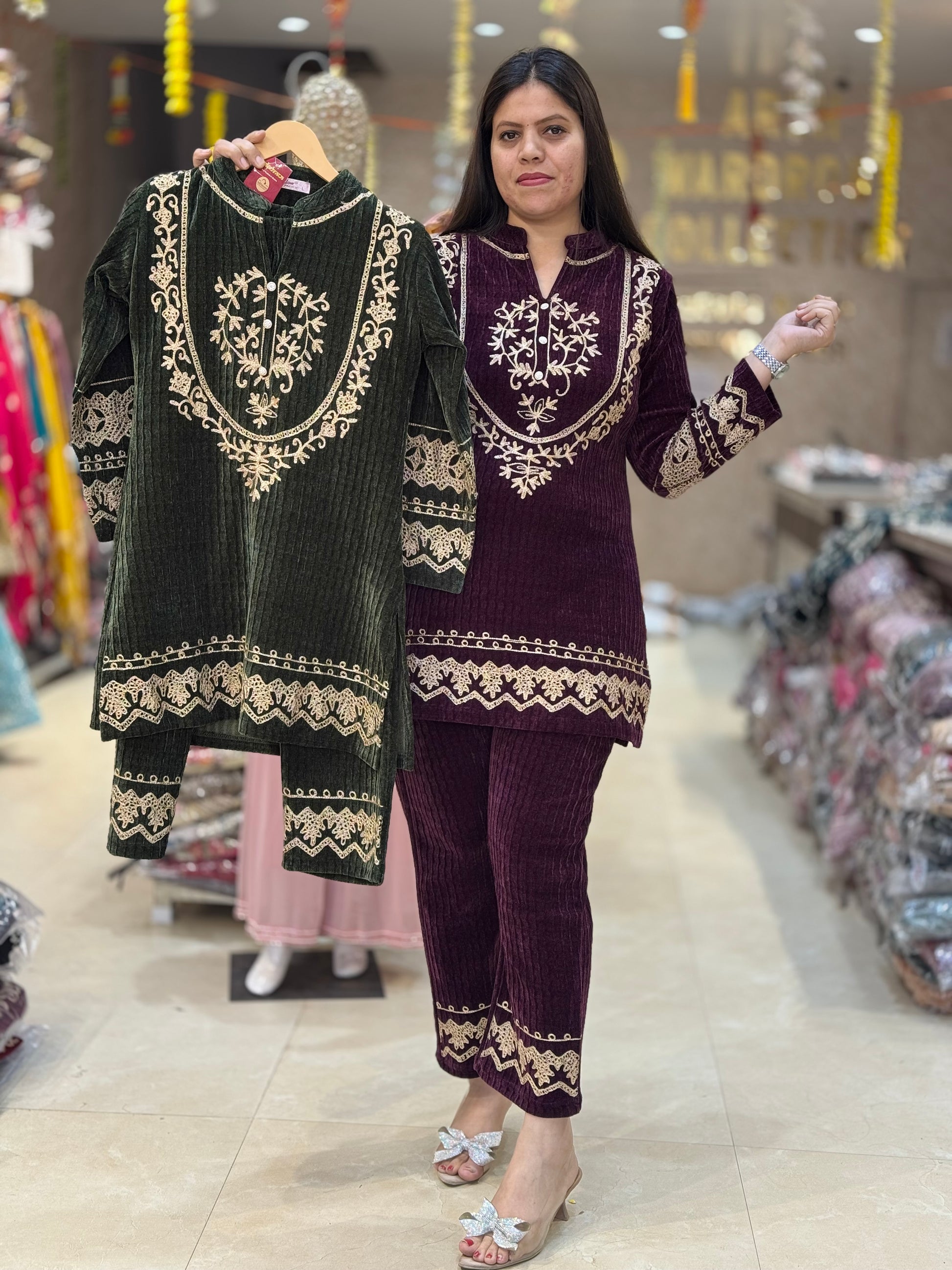 PREMIUM VELVET GOLDEN THREAD WORK DESIGN ON NECK AND BORDER CORDSET