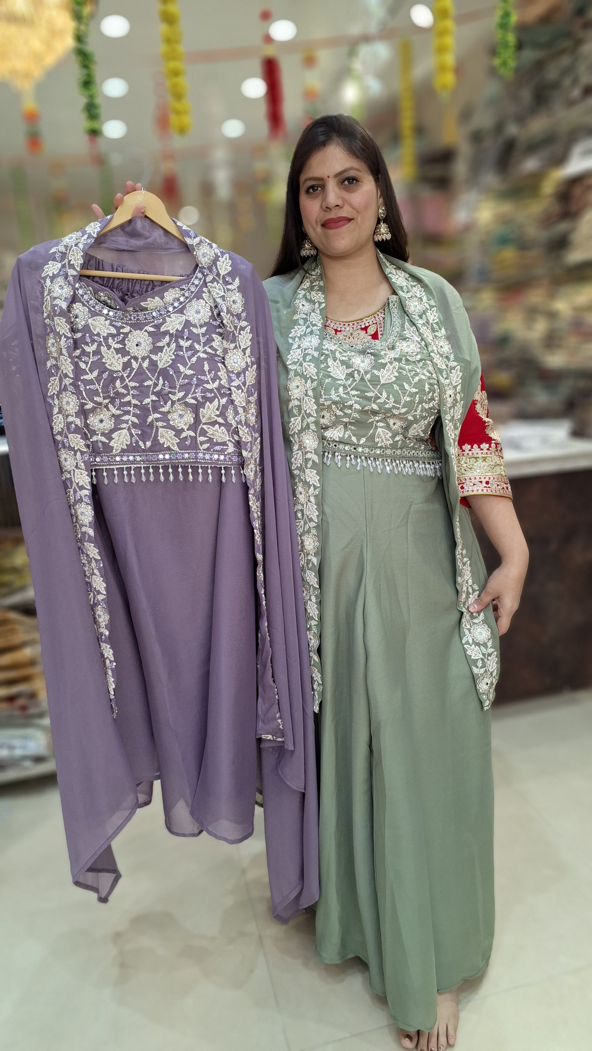 PURE CHINON SILVER TILLA WORK SHORT TOP WITH DHOTI DESIGN SKIRT PARTY WEAR DRESS