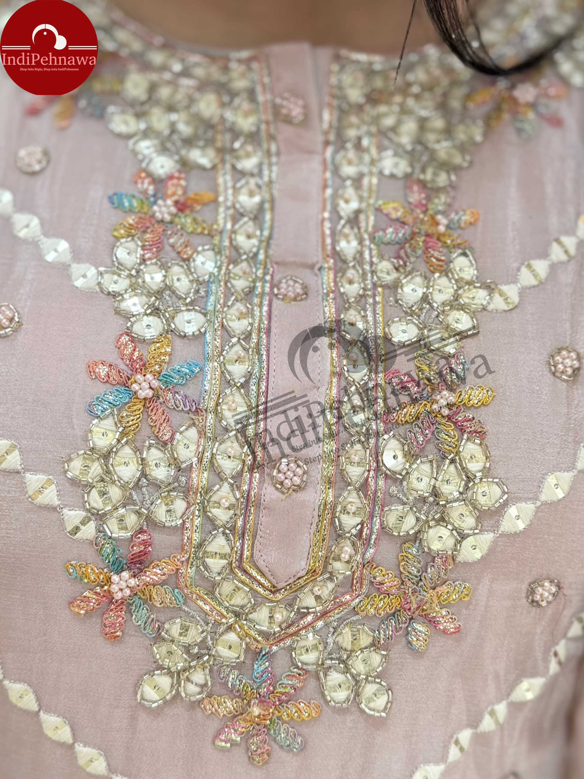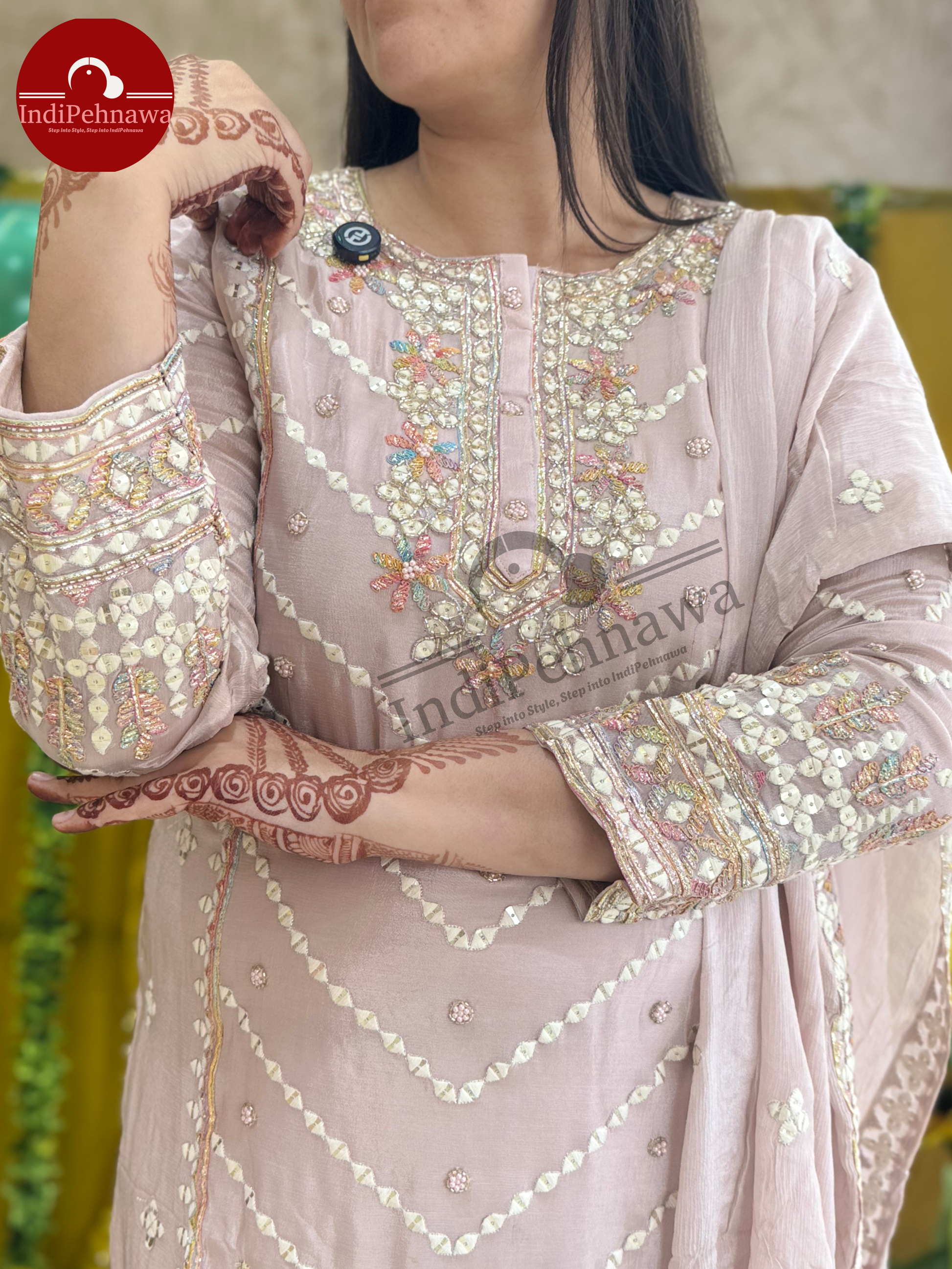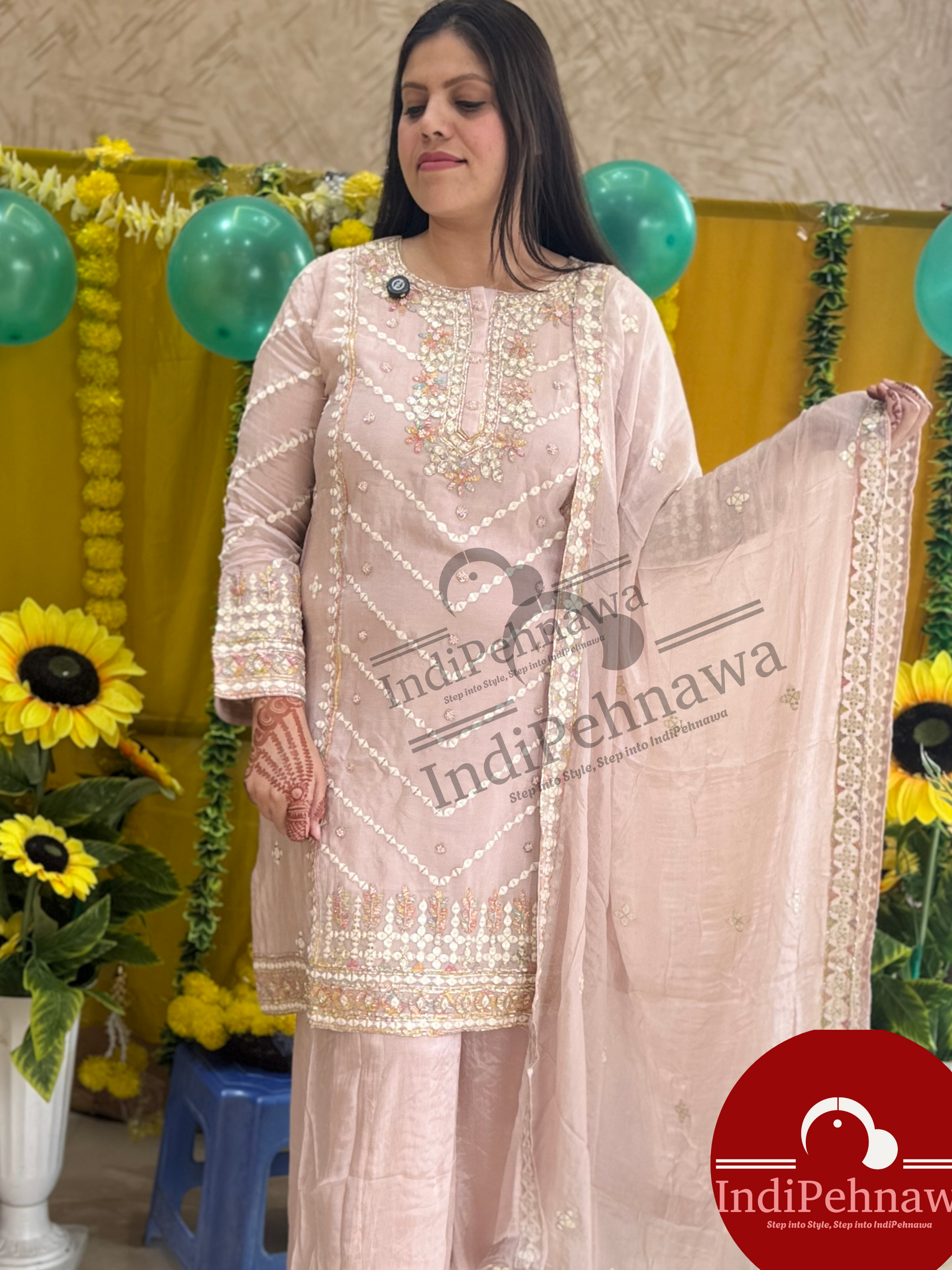 Experience elegance with this Pure Chinon Plazo Suit featuring intricate thread and cut dana work on the shirt. The ensemble includes a heavily embroidered dupatta and a matching heavy plazo adorned with detailed embroidered thread work, offering a refined and sophisticated look perfect for special occasions. Crafted from pure chinon fabric, it ensures comfort while maintaining a luxurious appearance.