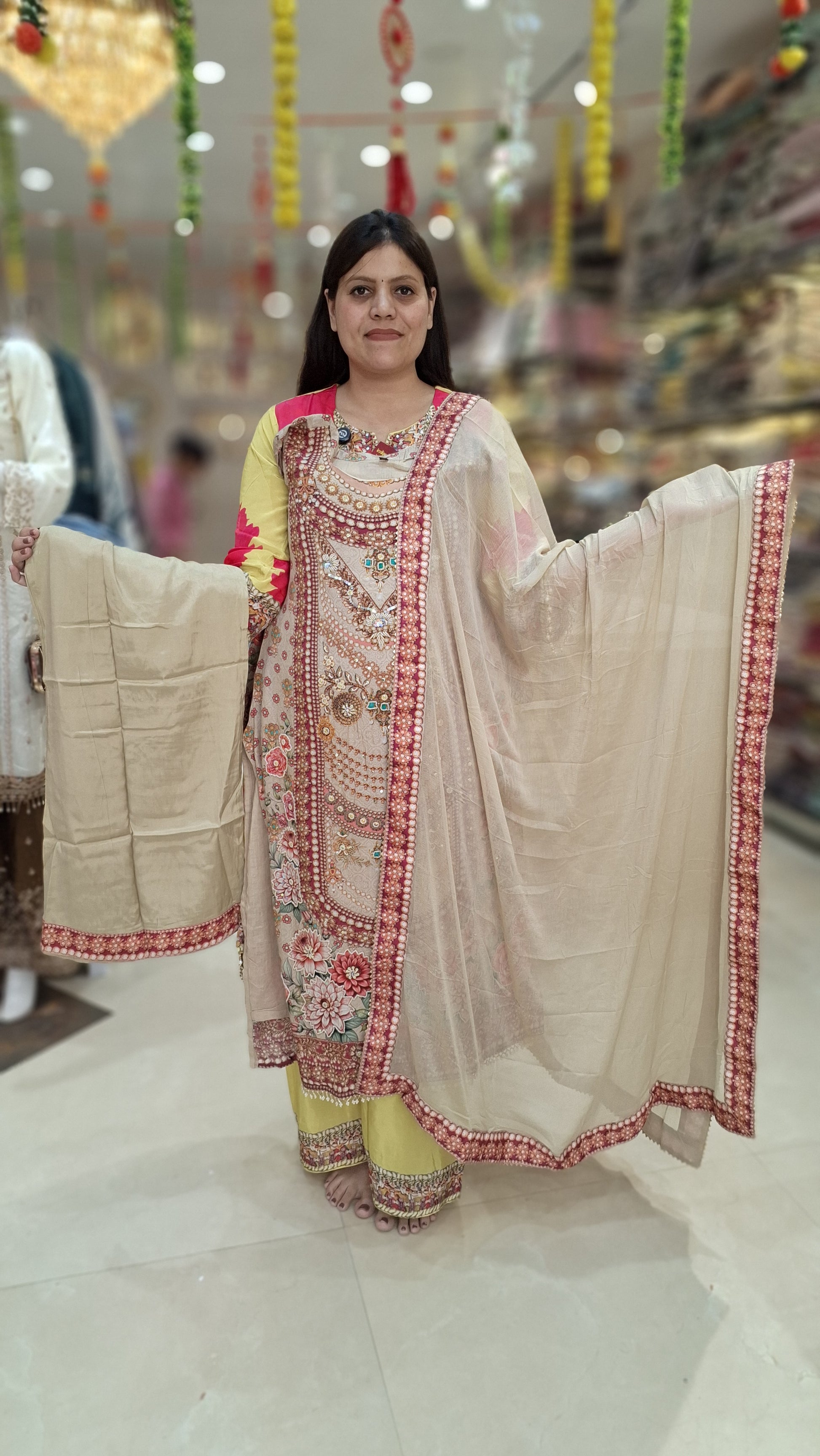 Experience the elegance of the Ranihaar Suit crafted in pure crape fabric, featuring exquisite hand-embroidered full cut dana work on the shirt. The distinctive Ranihaar neck design adds a regal touch, perfectly complemented by a four-sided lace dupatta that enhances the overall sophistication. Available in sizes M to XXLL, this suit blends traditional craftsmanship with refined style for a polished and graceful look.