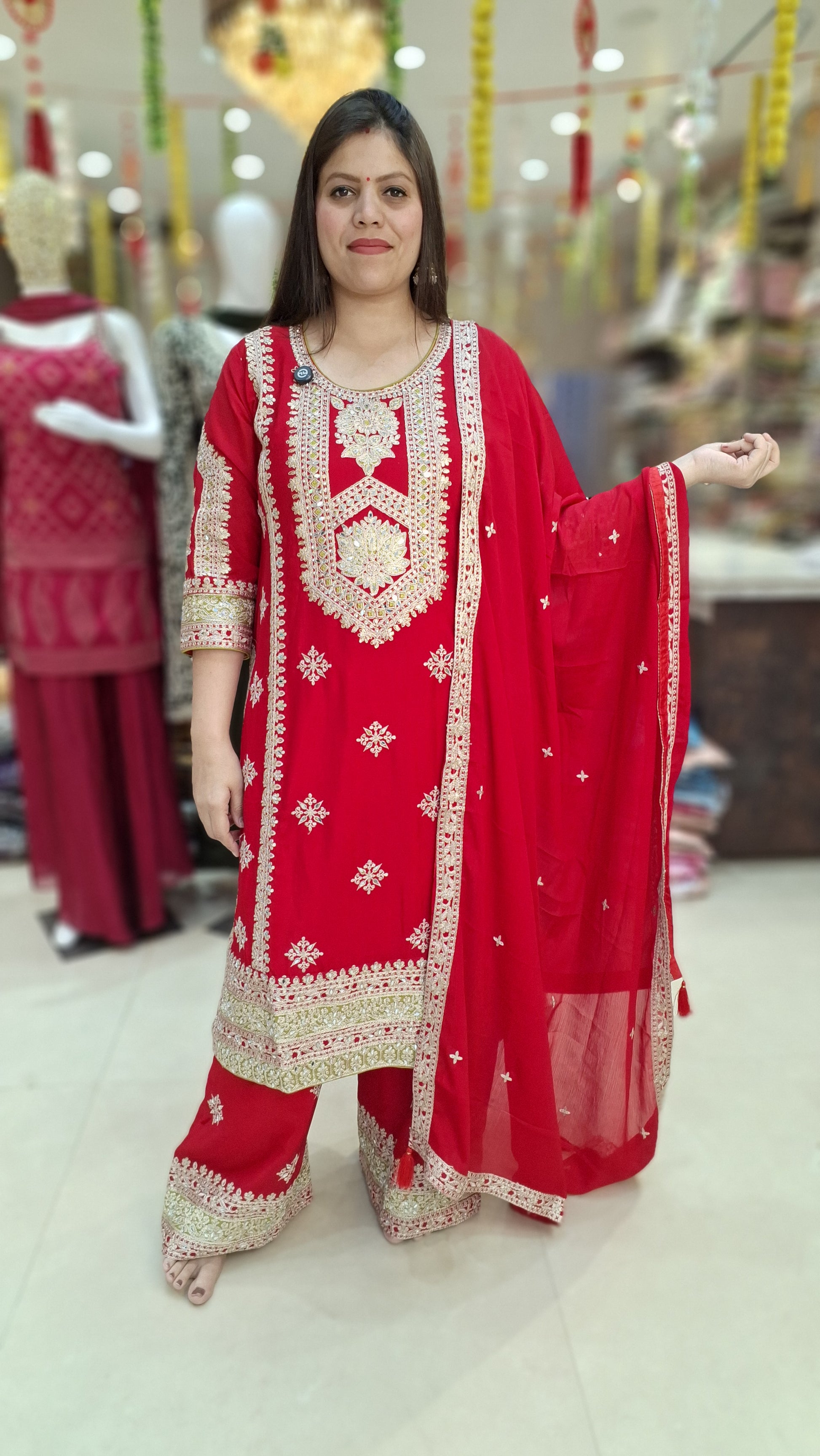 RED PURE CHINON NECK DESIGN WITH TIILA WORK PLAZZO SUIT
