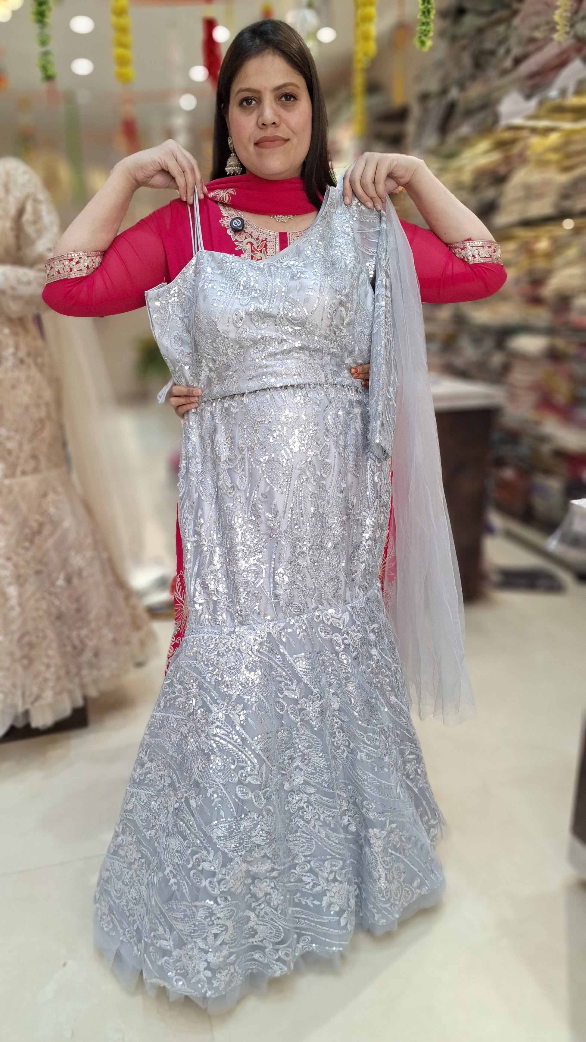 SILVER FISHCUT NETED WITH SIPI WORK SHORT TOP WITH SKIRT