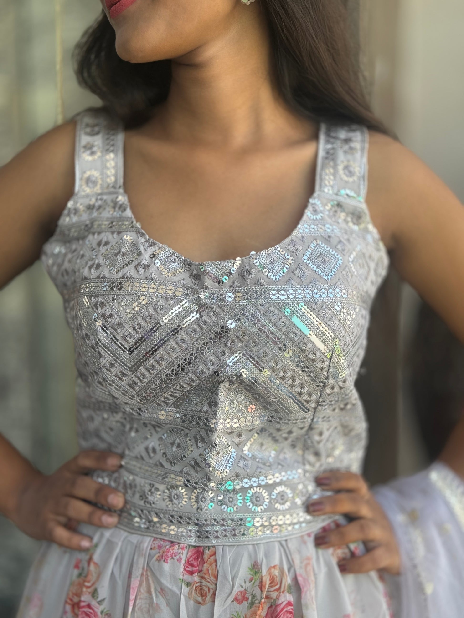 Steel Grey Floral Butterfly Georgette Lehenga (Leh: 001)