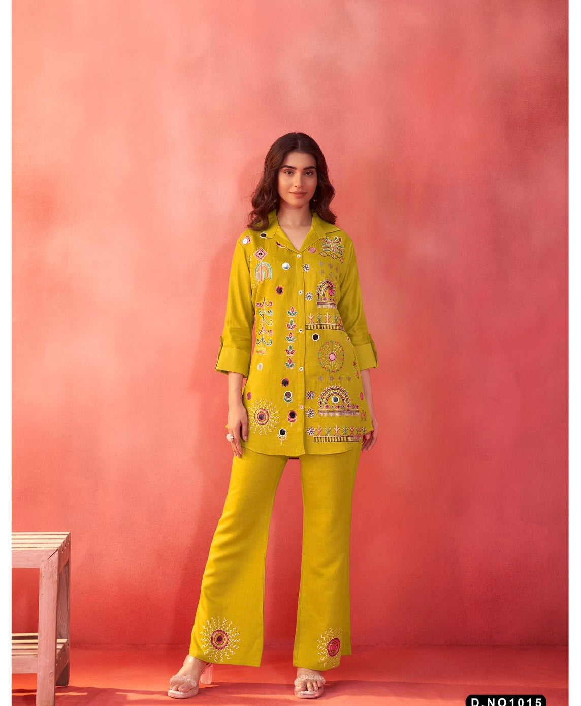 Superb article with full embroidered with mirror work. Bootcut pent give a better look. Size m to xxl , febric camric cotton.